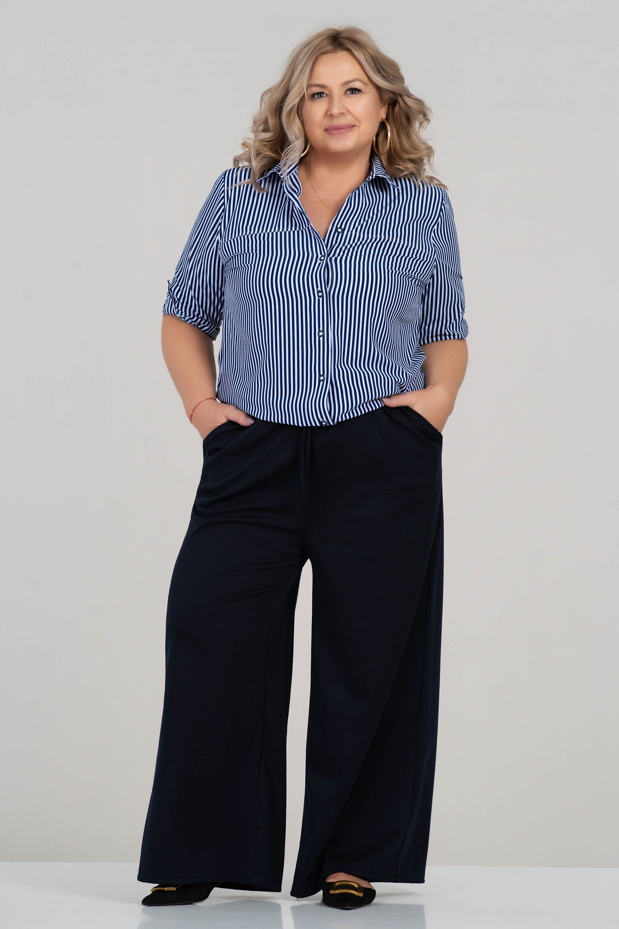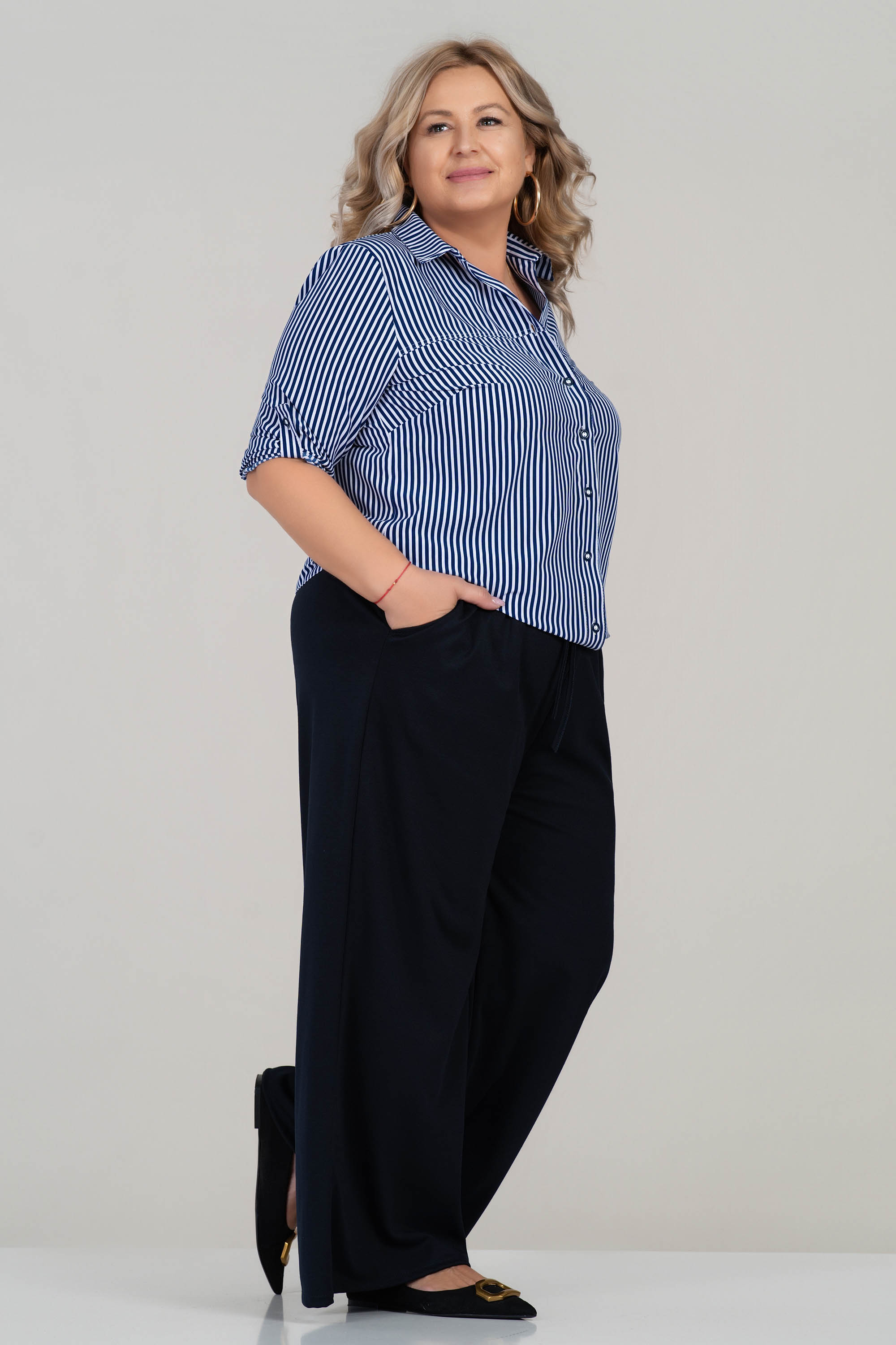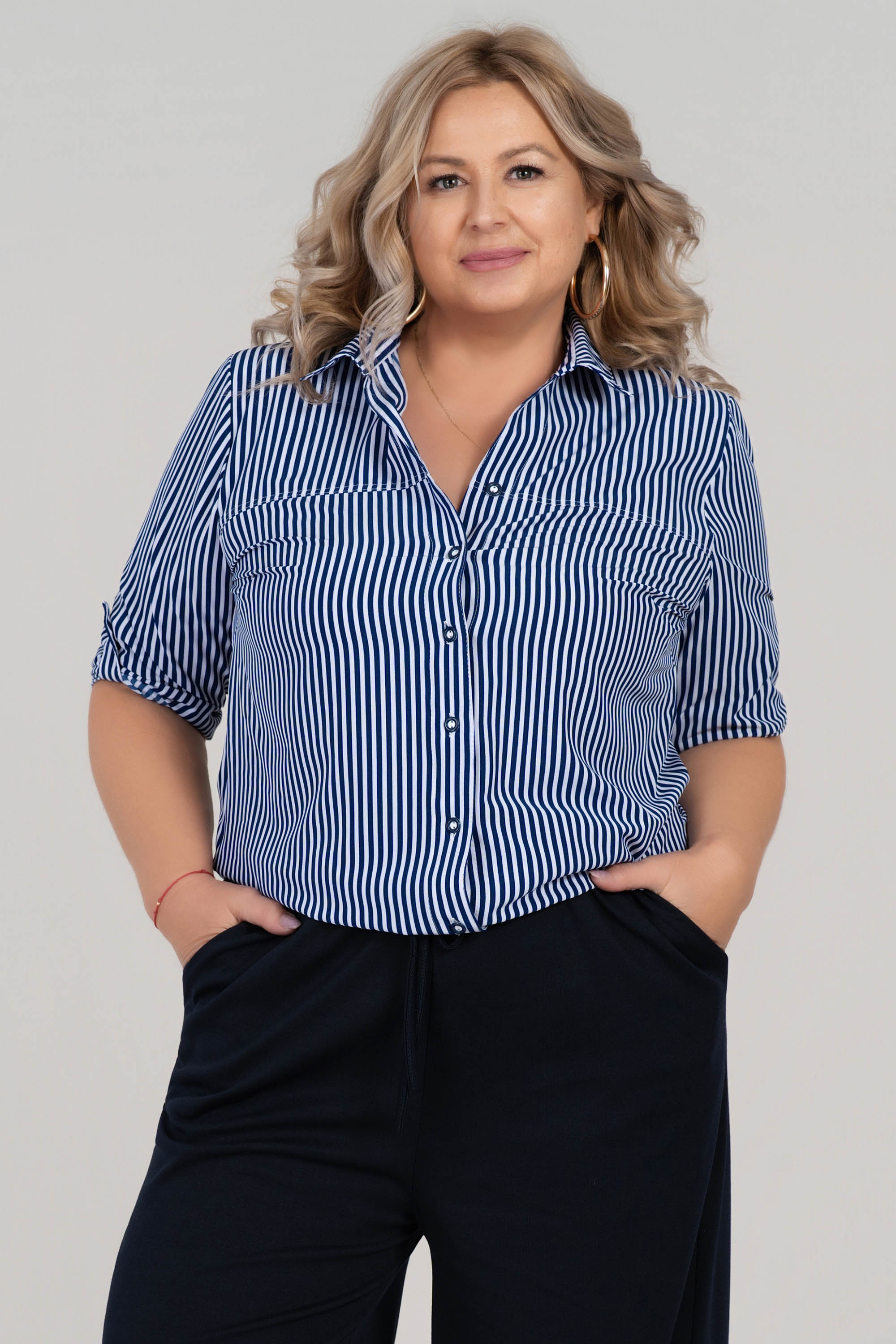 Класическа макси риза в елегантна комбинация от синьо и бяло, изработена от мека вискозна материя. Моделът е с регулиращ се ръкав, закопчава се с копчета до долу, а кройката е свободна и удобна. Раираният и принт издължава силуета. Подходяща за ежедневието и офиса през есенно-зимния сезон.