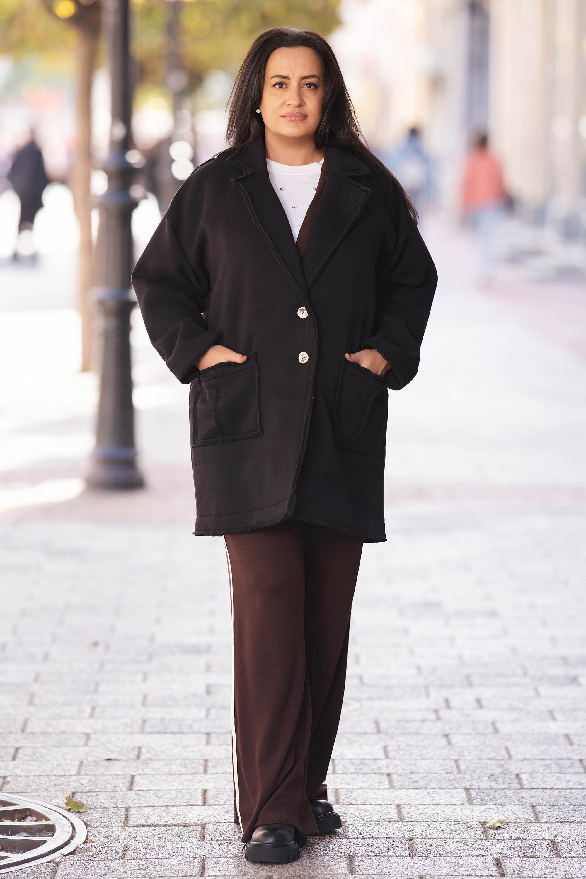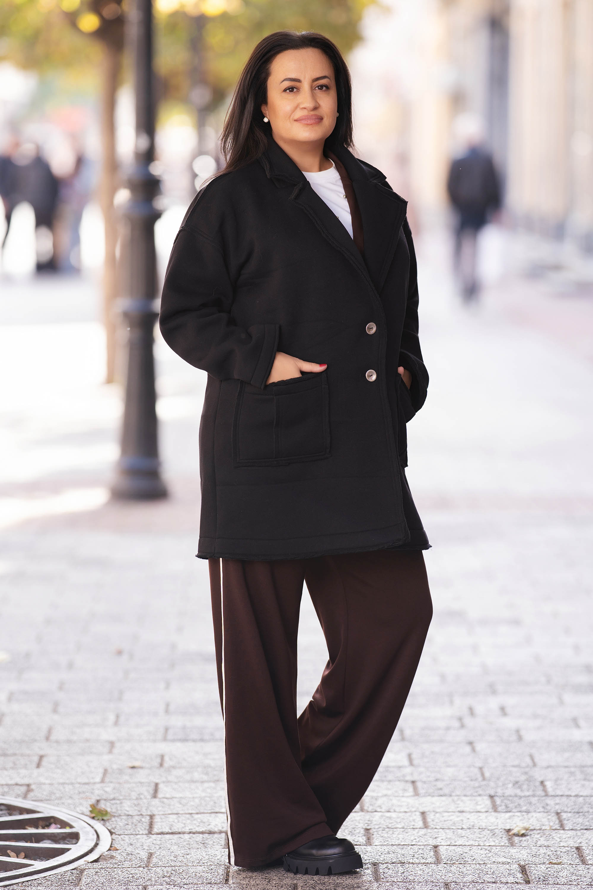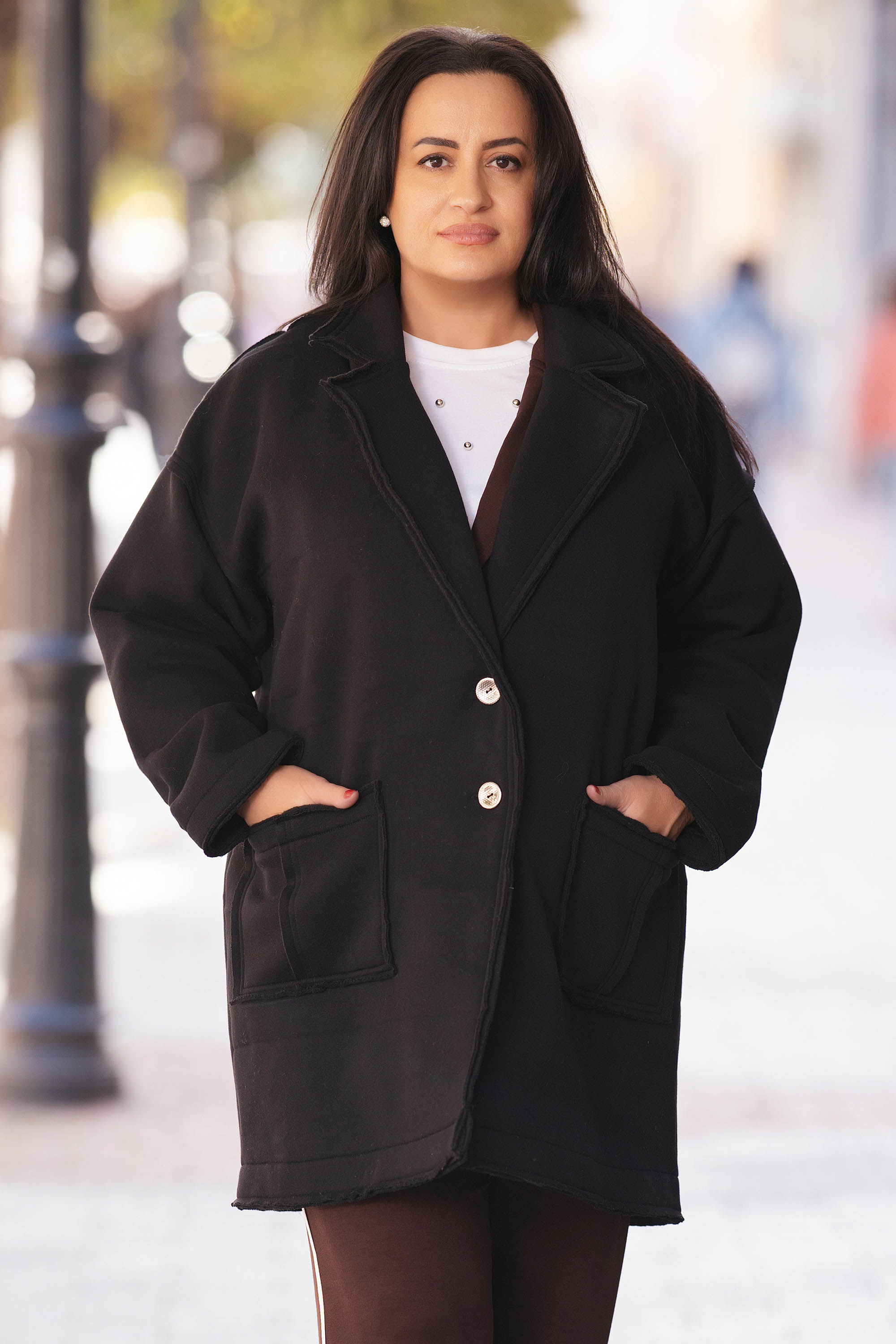 Класическо макси палто в черно, изработено в България. Моделът е с изчистена линия, подчертана от две метални копчета и големи джобове с функционален характер. Подходящо за носене както в градска среда, така и при пътуване. Топлата материя с високо съдържание на памук осигурява мекота и уют през есенно-зимния сезон.