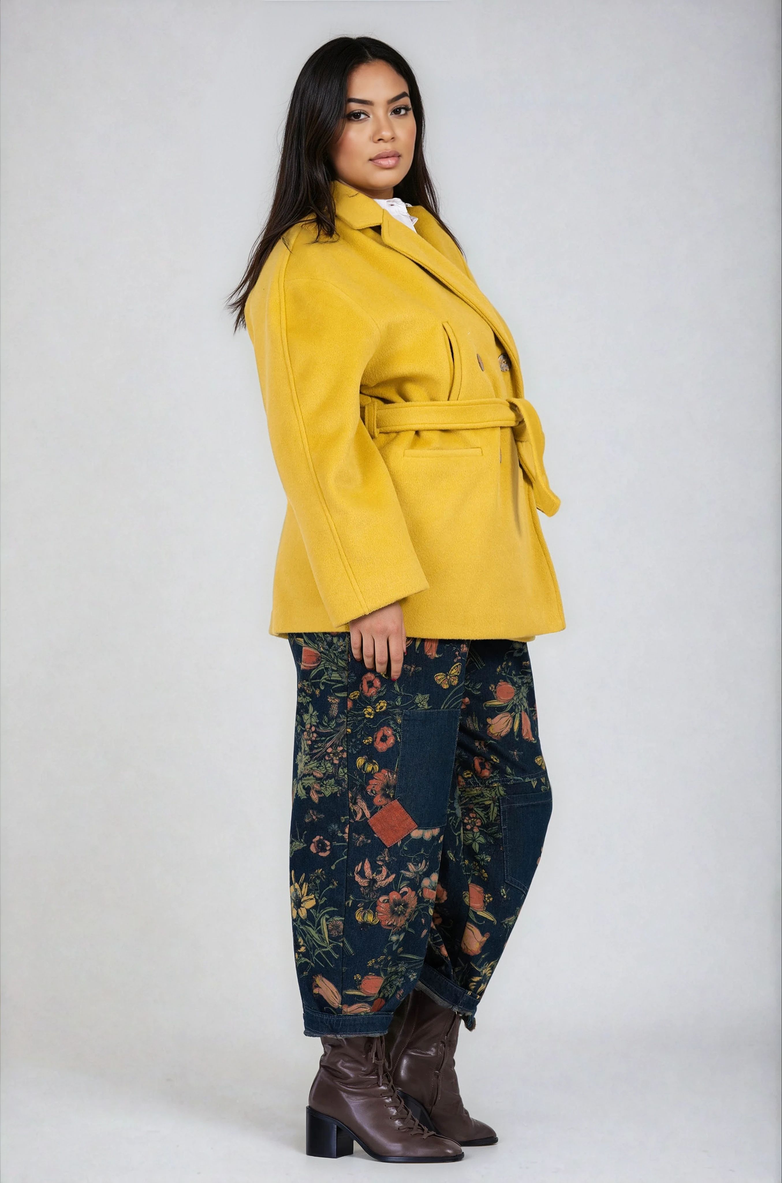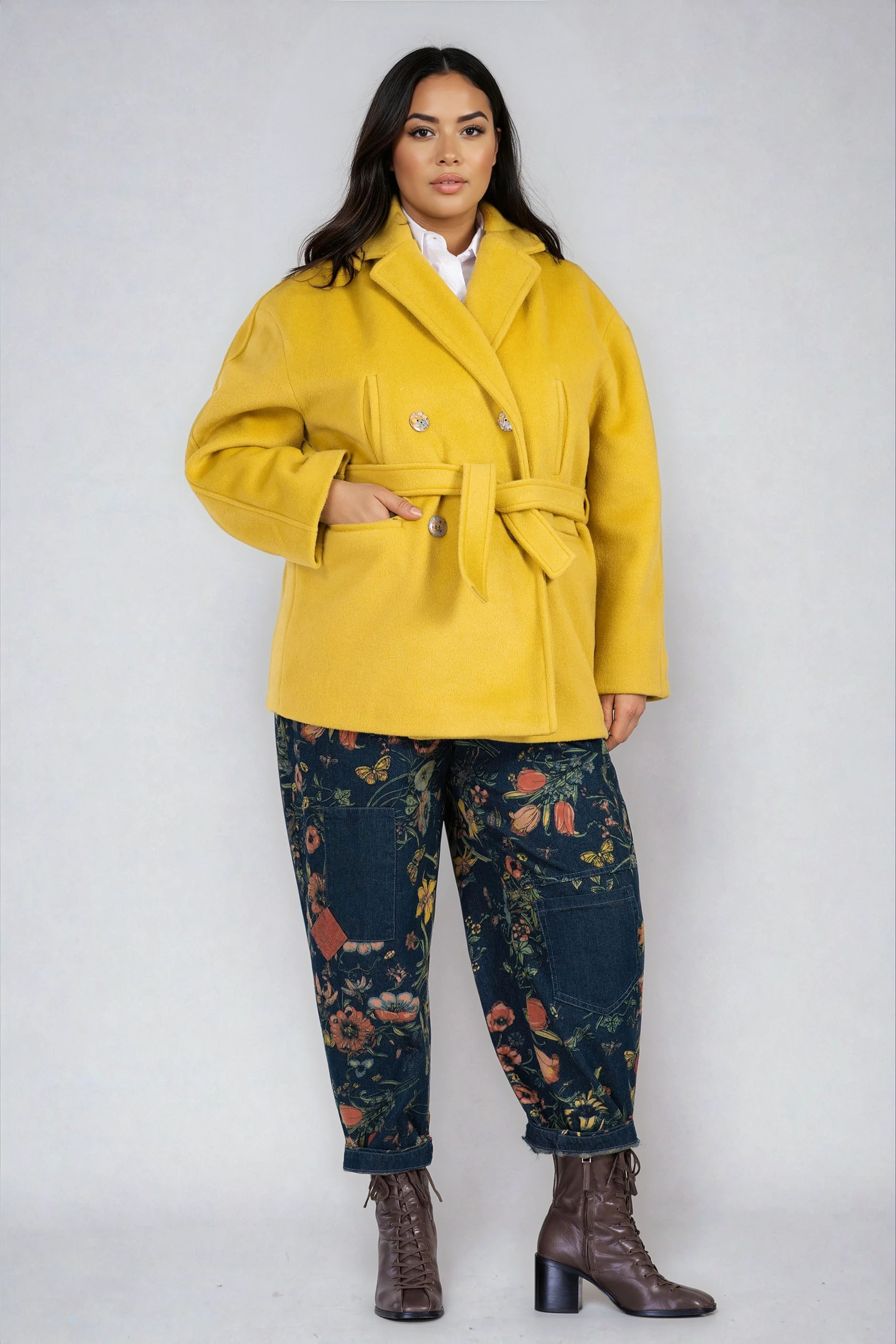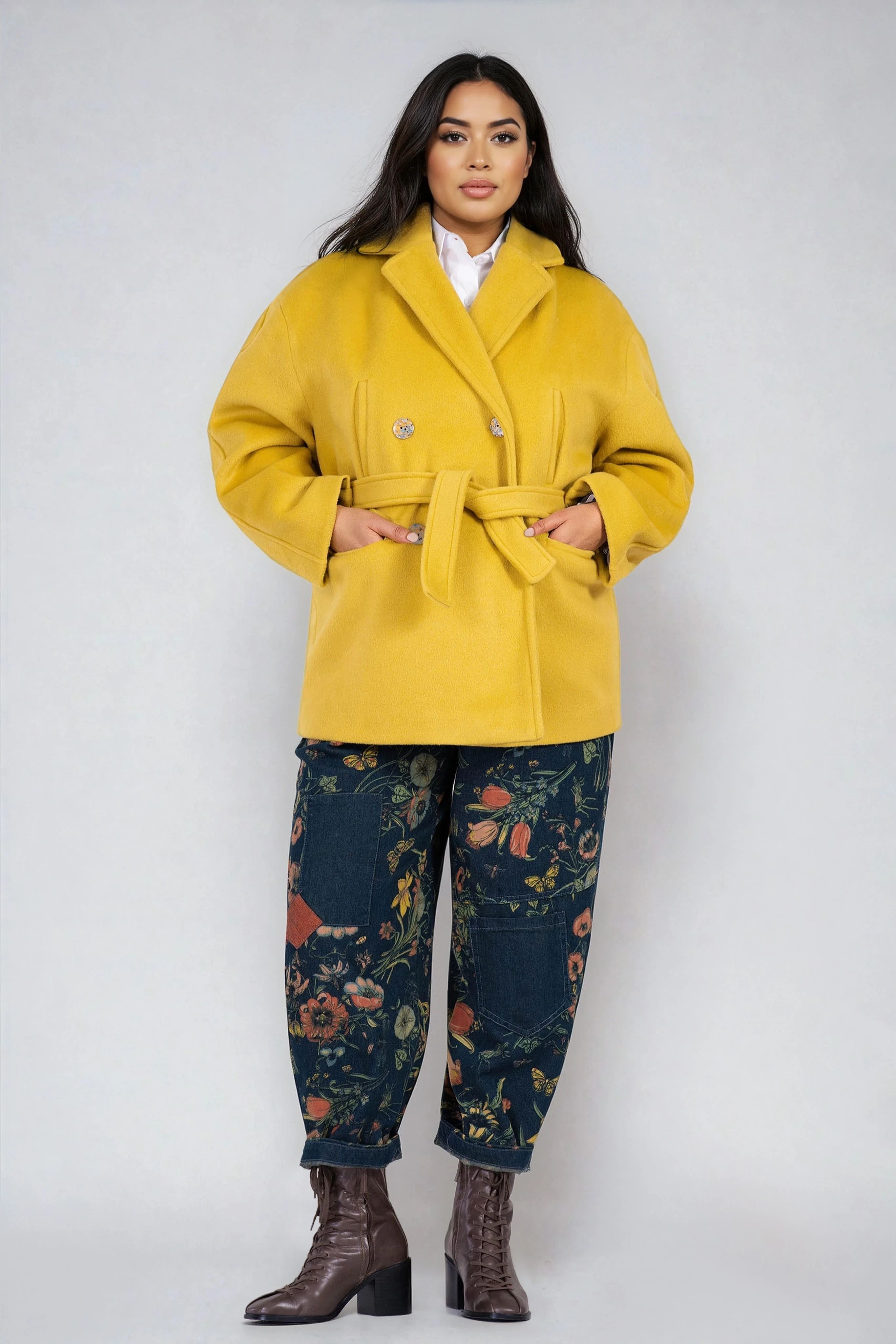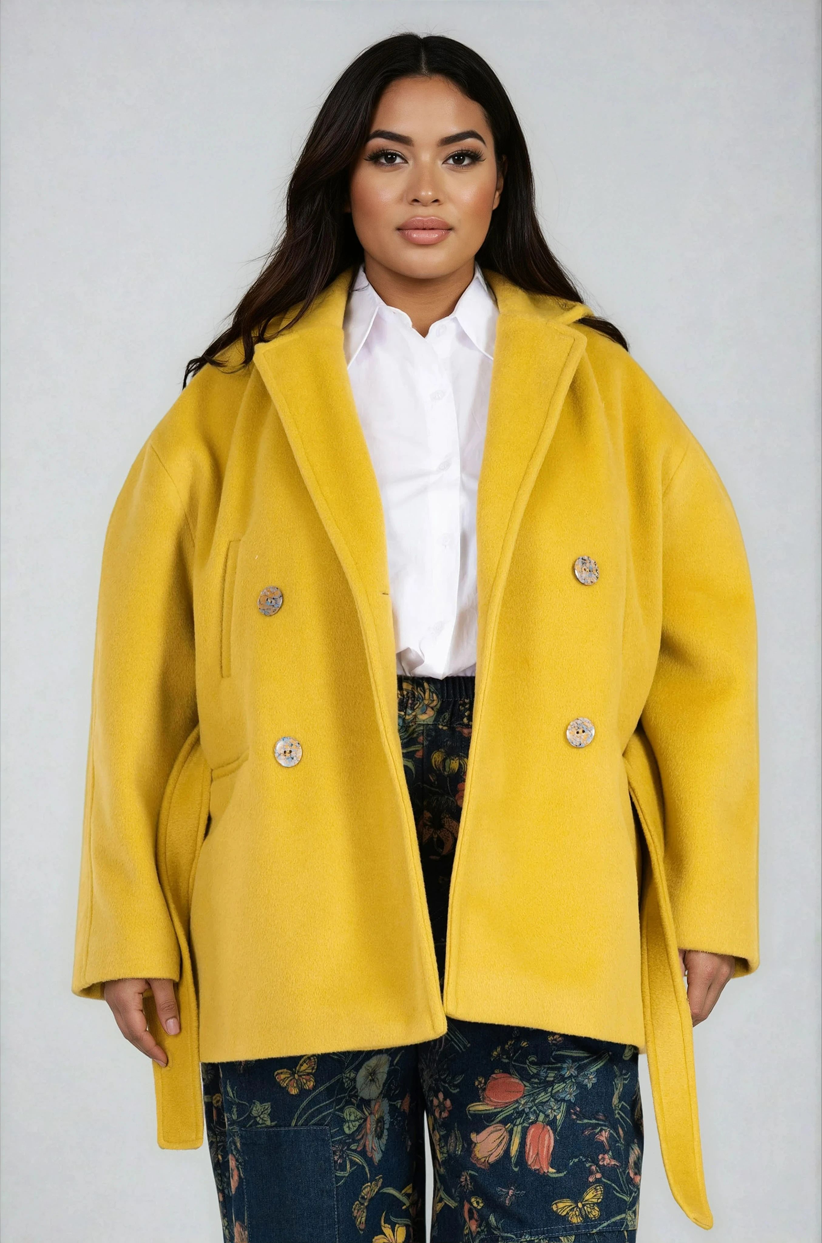 МАКСИ палто в жълто с вълна, двуредно закопчаване и колан в талията