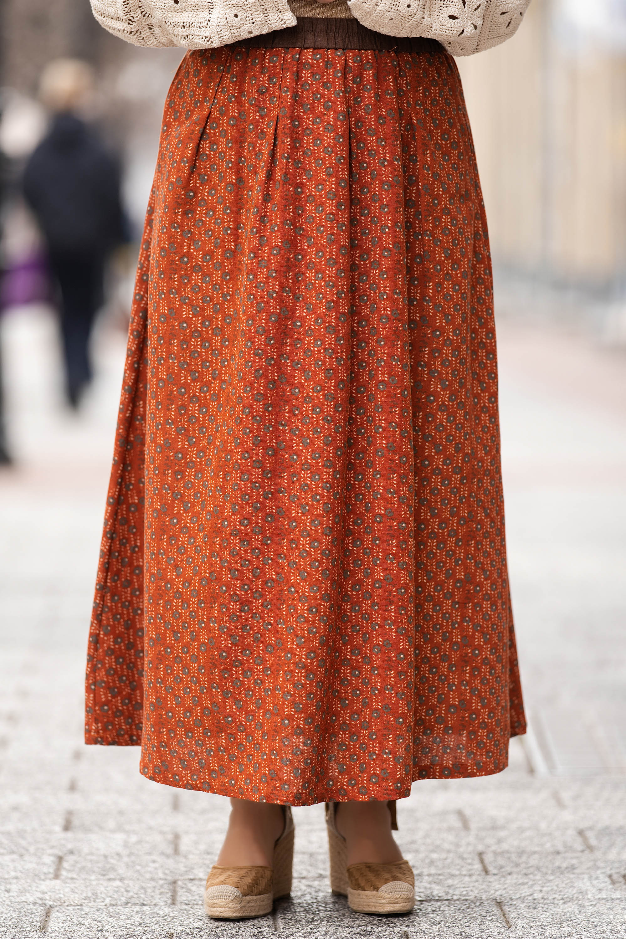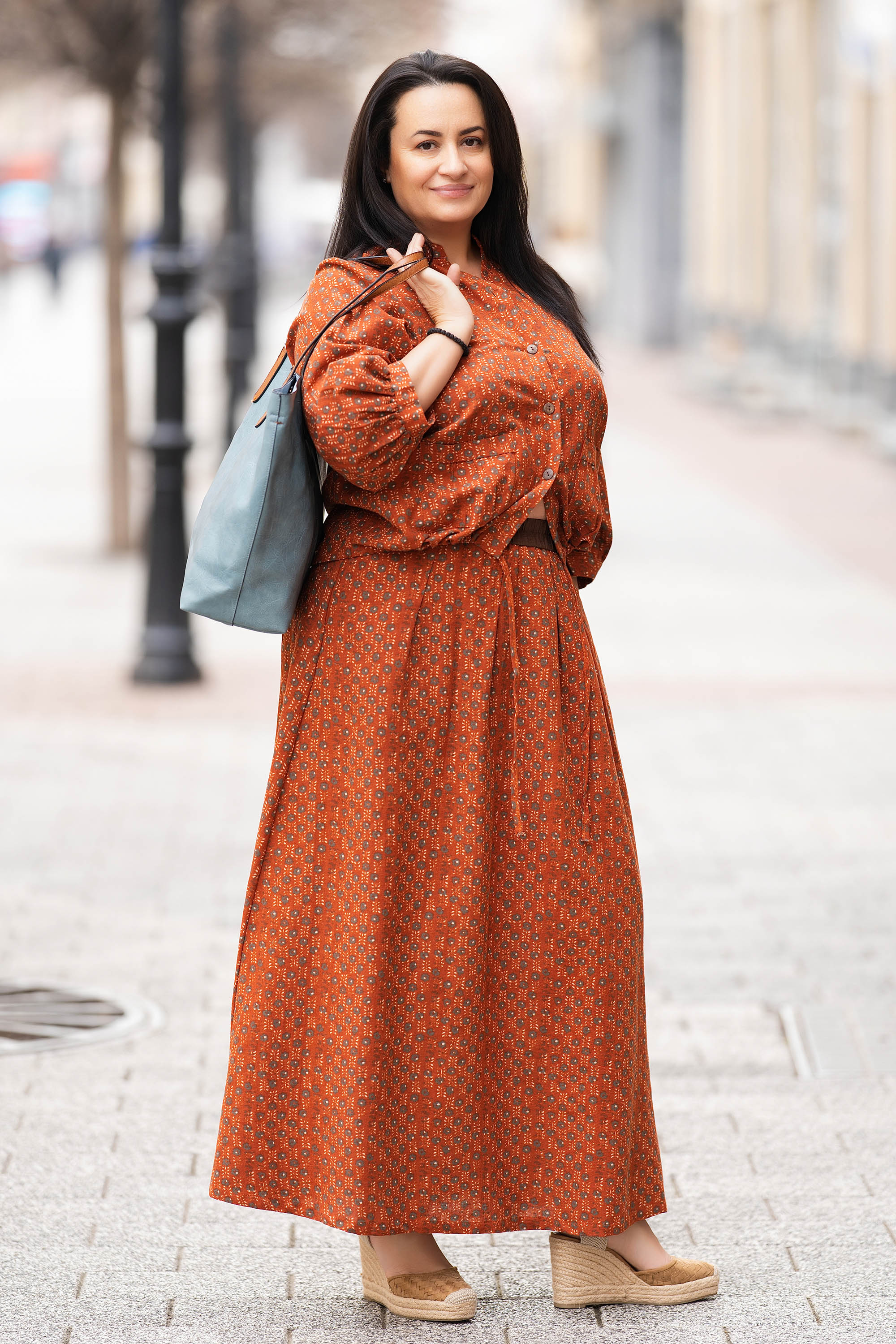 Макси памучен комплект от пола и риза в цвят керемида