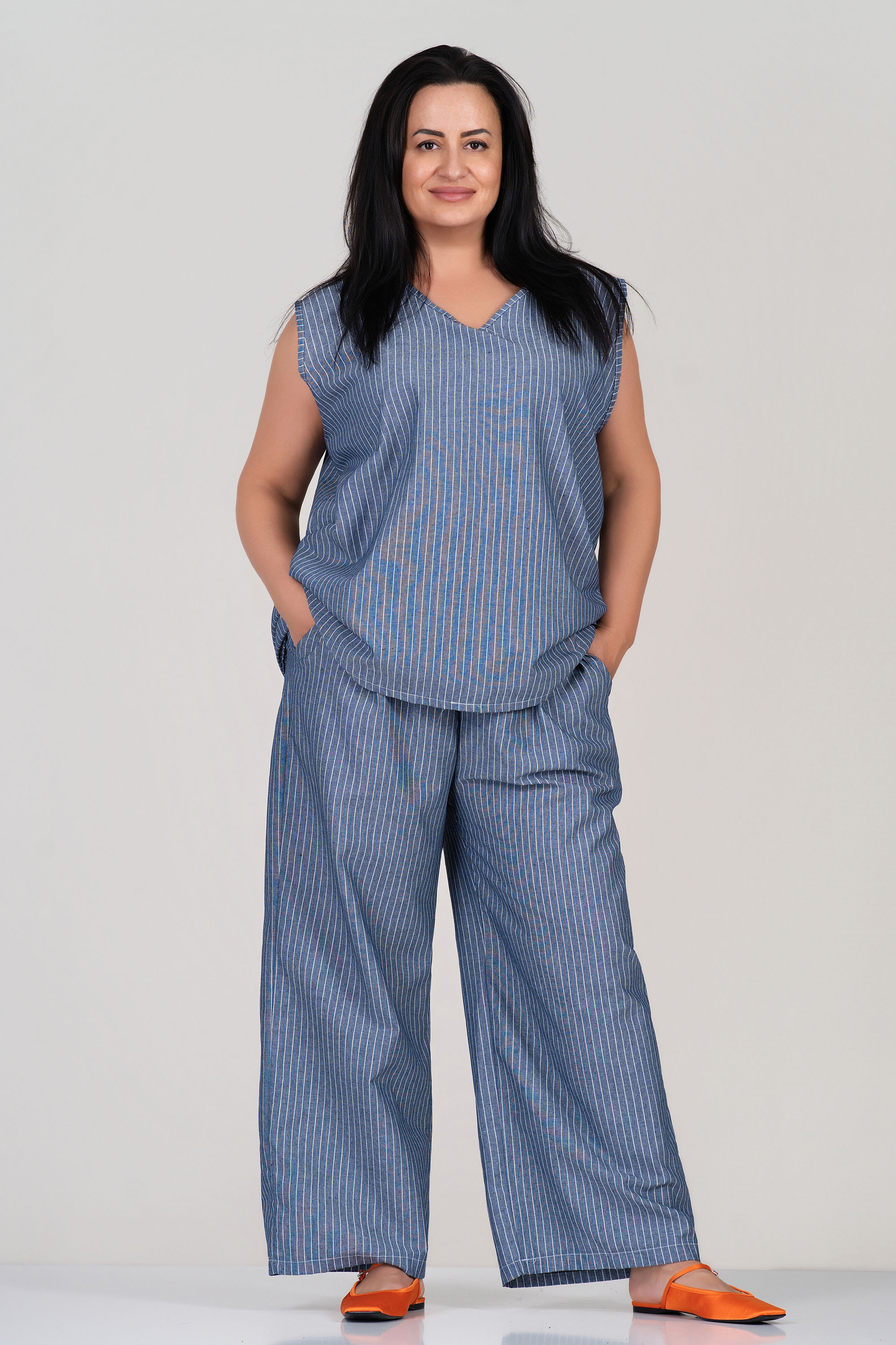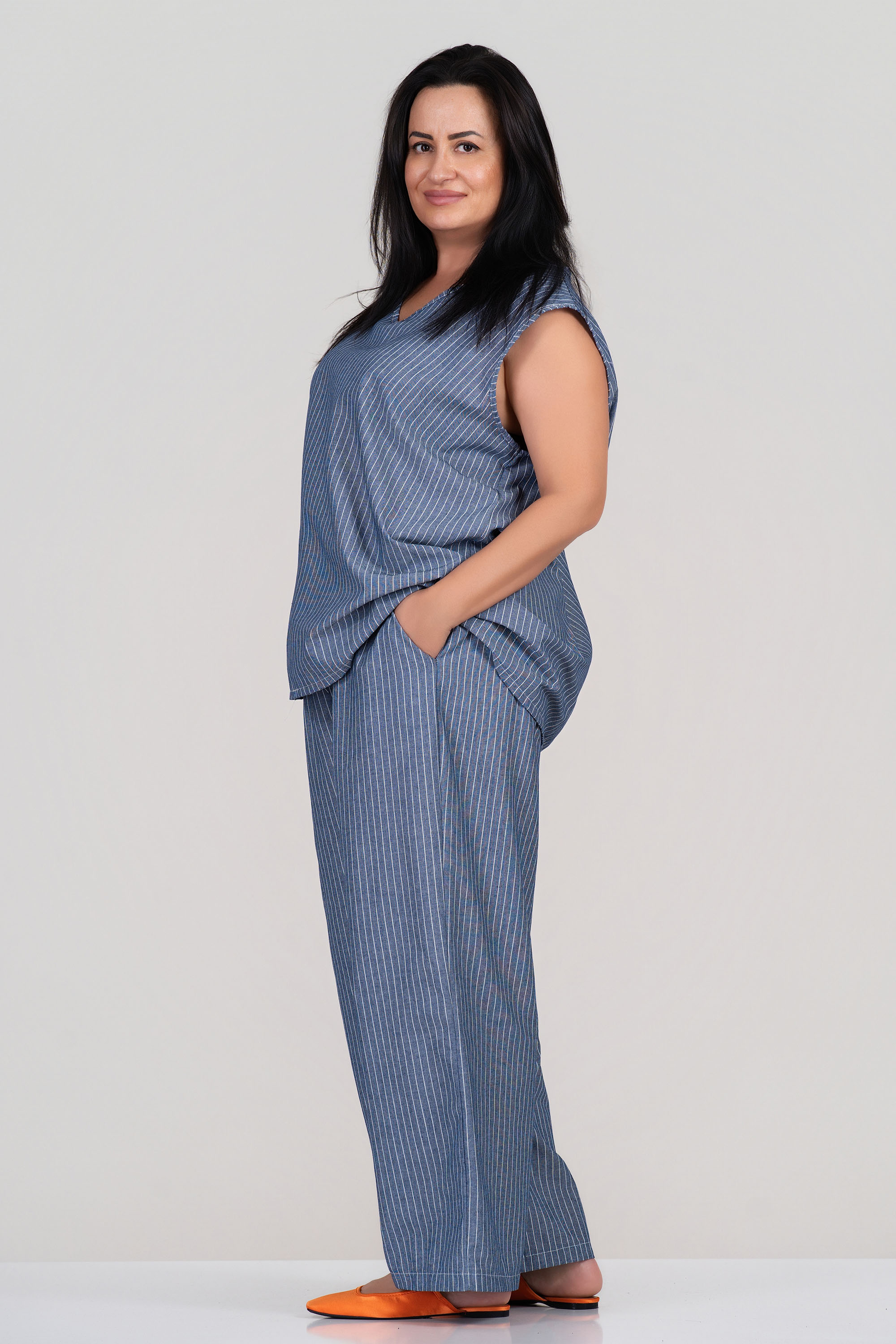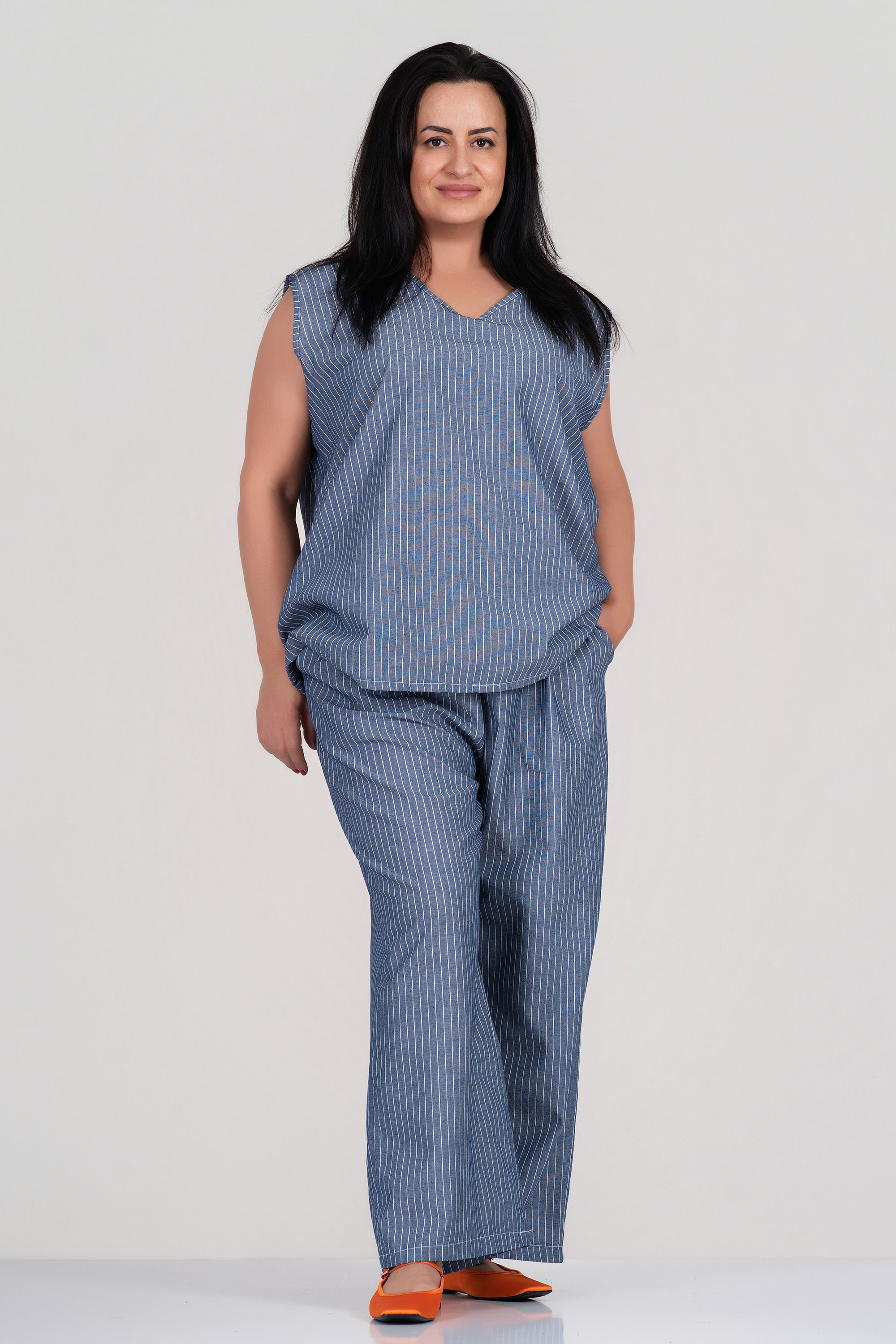 Лекота, удобство и стил се съчетават в този макси комплект от потник и широк панталон. Изработен от дишаща памучна материя, моделът осигурява максимален комфорт в топлите дни. Потникът е с V-образно деколте и свободна линия, а панталонът е с еластична талия и леко разкроен силует. Подходящ както за градска разходка, така и за почивка.