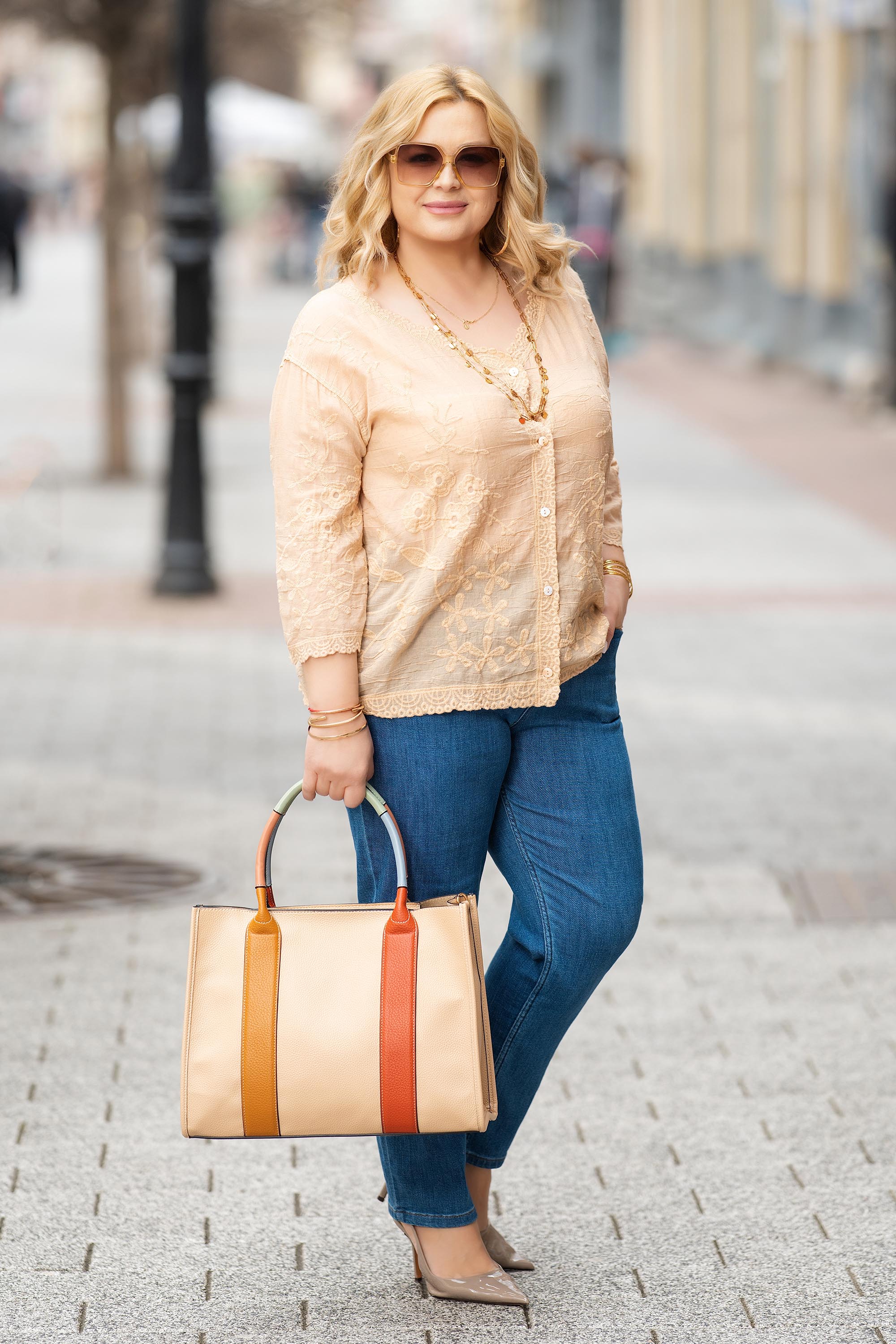 Тази ефирна блуза в бежово съчетава удобство и женствен стил. Акцентът пада върху фината бродерия на цветя и нежния дантелен кант около деколтето, ръкавите и подгъва. Дълбокото деколте и свободната кройка я правят подходяща за ежедневно носене или по-специални поводи през топлите сезони.