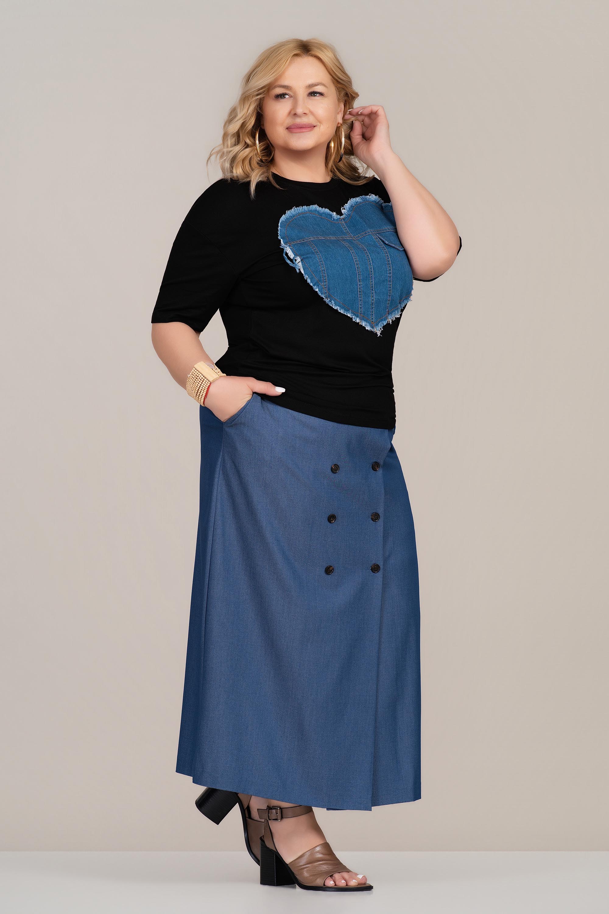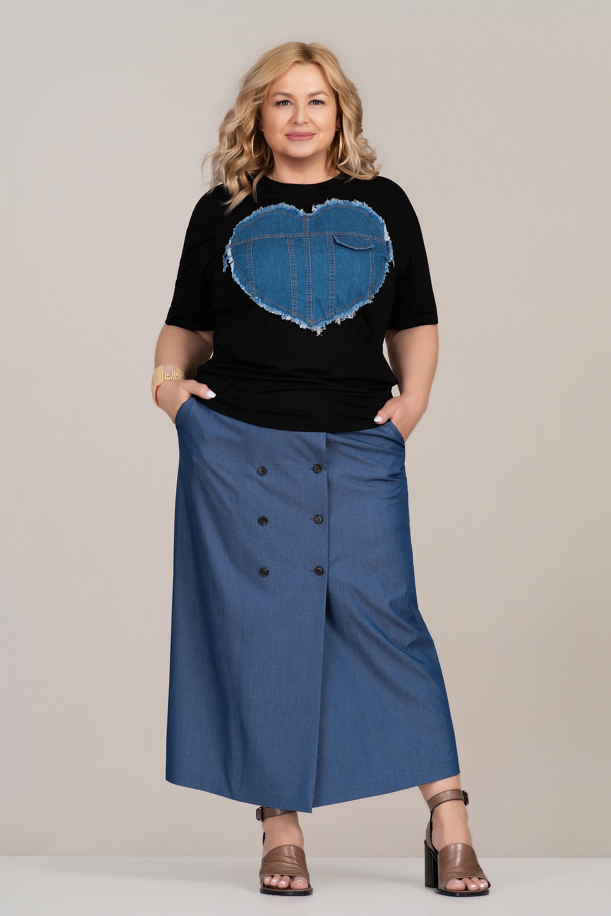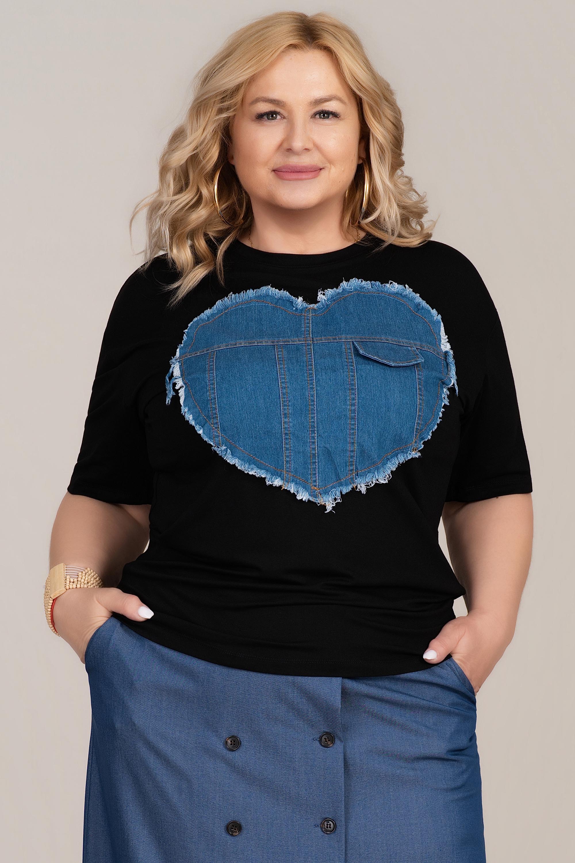 Ефектна макси тениска с модерно излъчване и отличителен дизайн. Памучната материя е мека и дишаща, което осигурява комфорт при целодневно носене. Декоративната деним апликация във форма на сърце с леко накъсани ръбове придава характер и стил на визията. Свободната линия създава удобно прилягане и увереност, подходяща за ежедневни и градски комбинации.