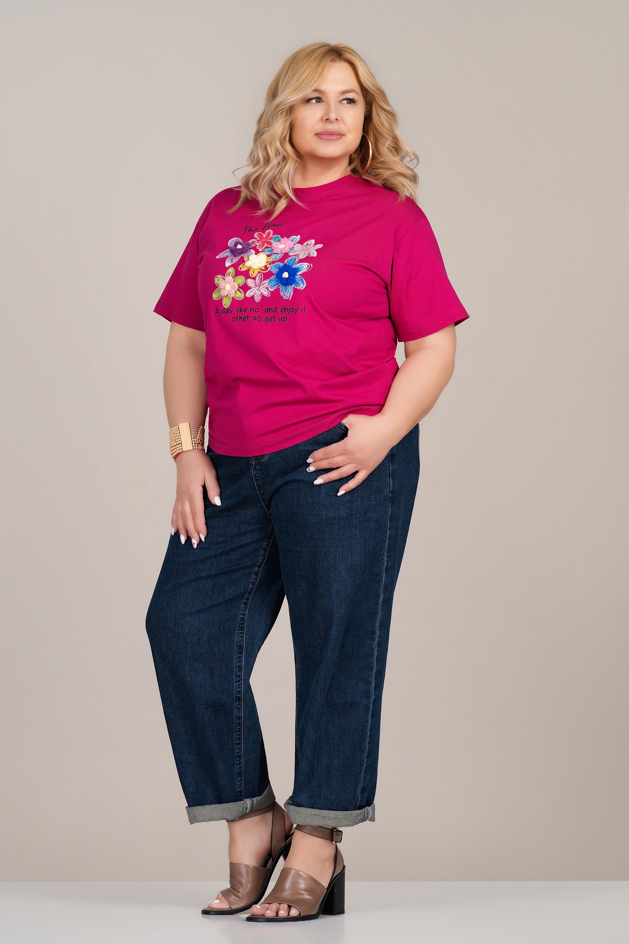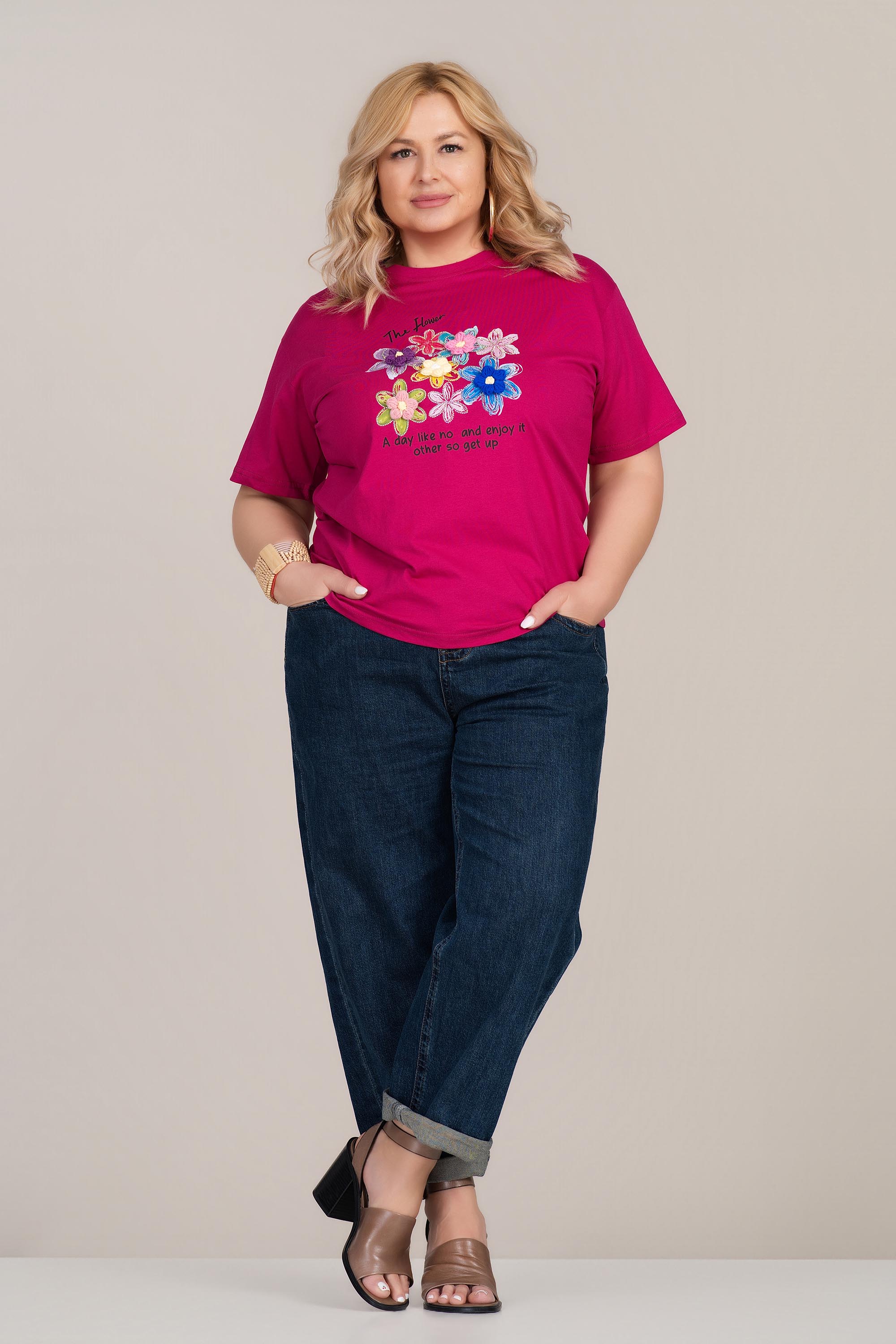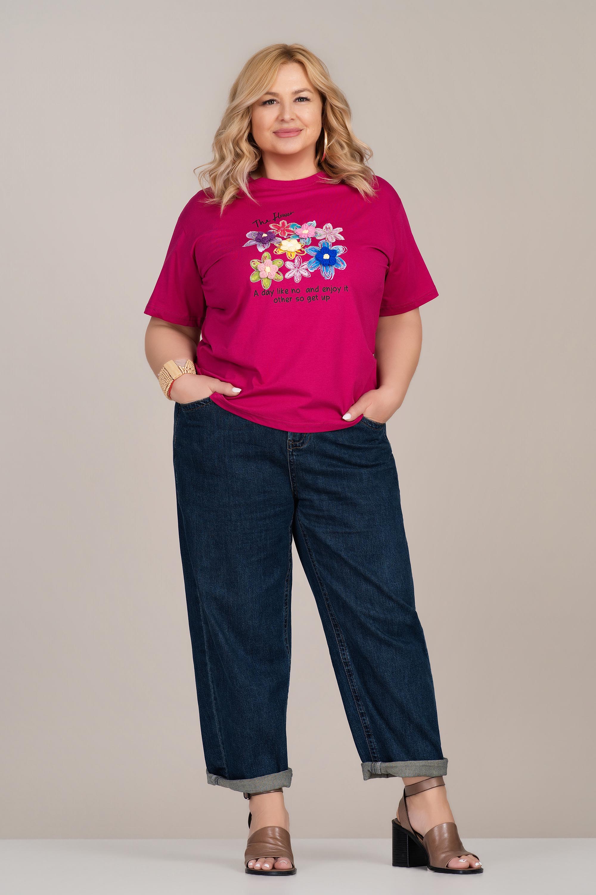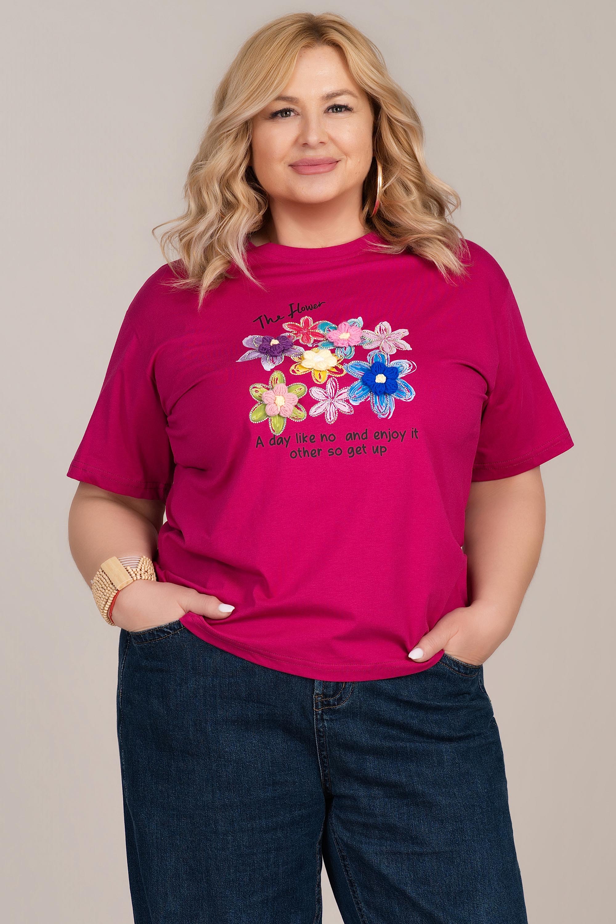 МАКСИ памучна тениска в цикламено розово с флорална апликация