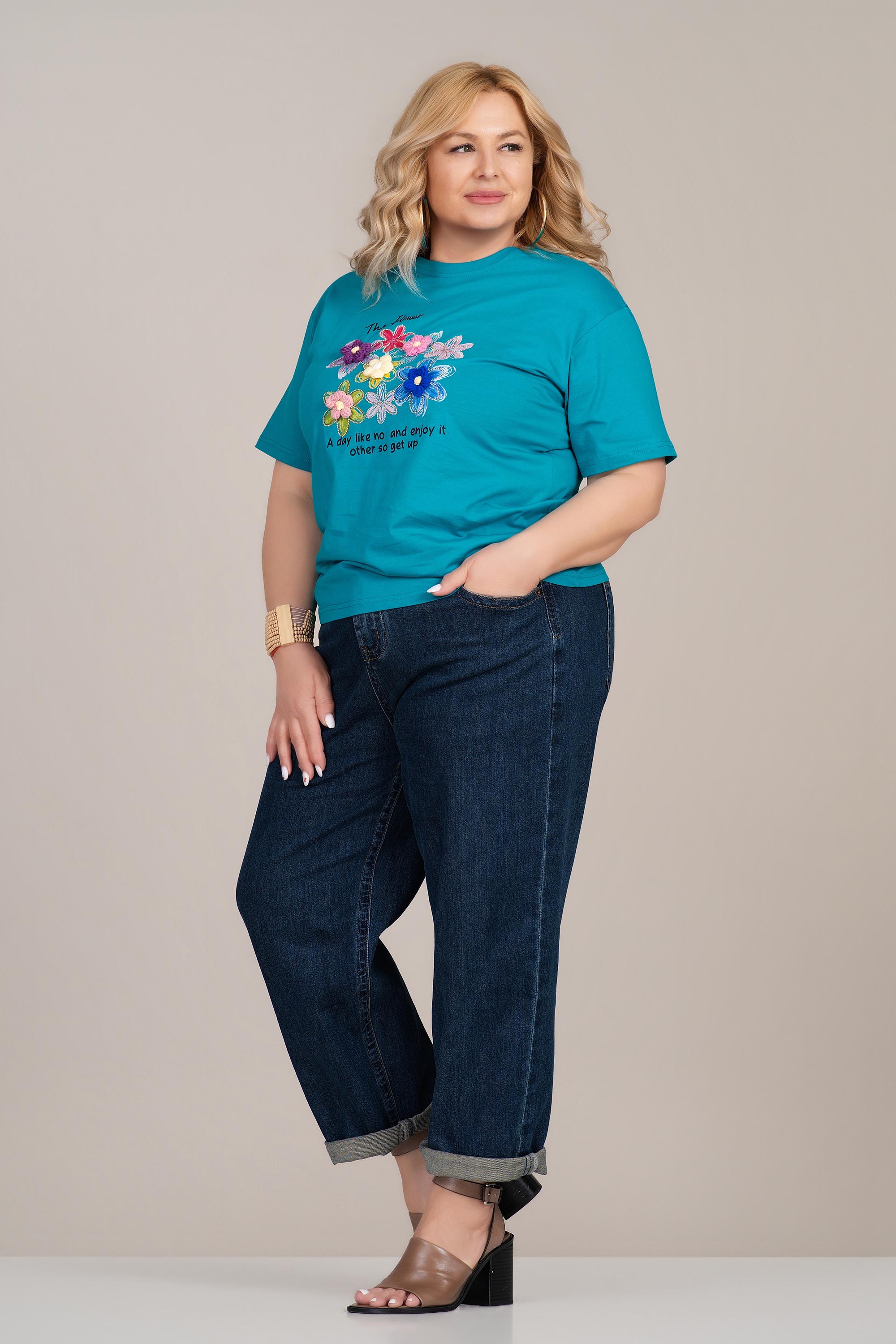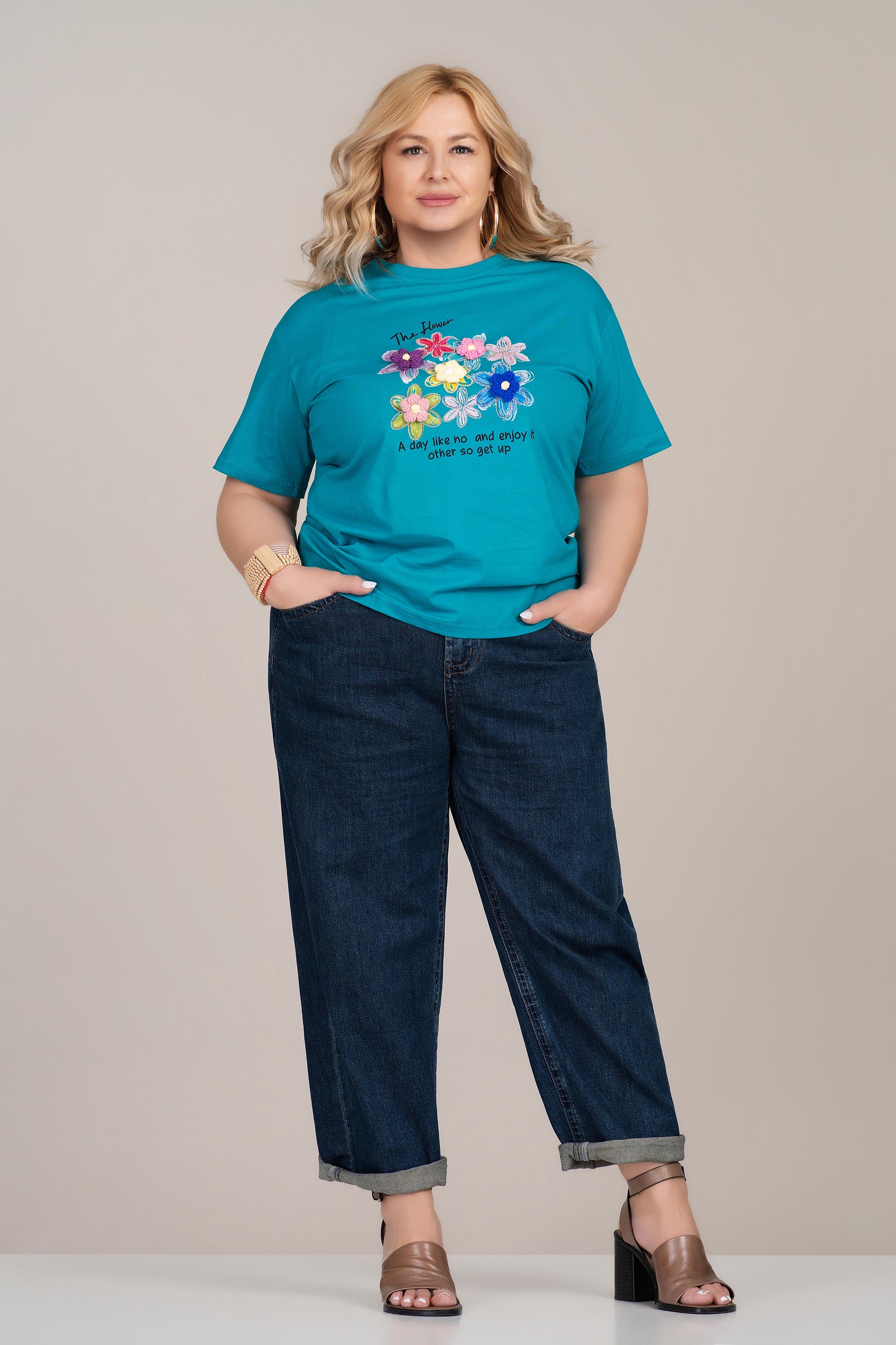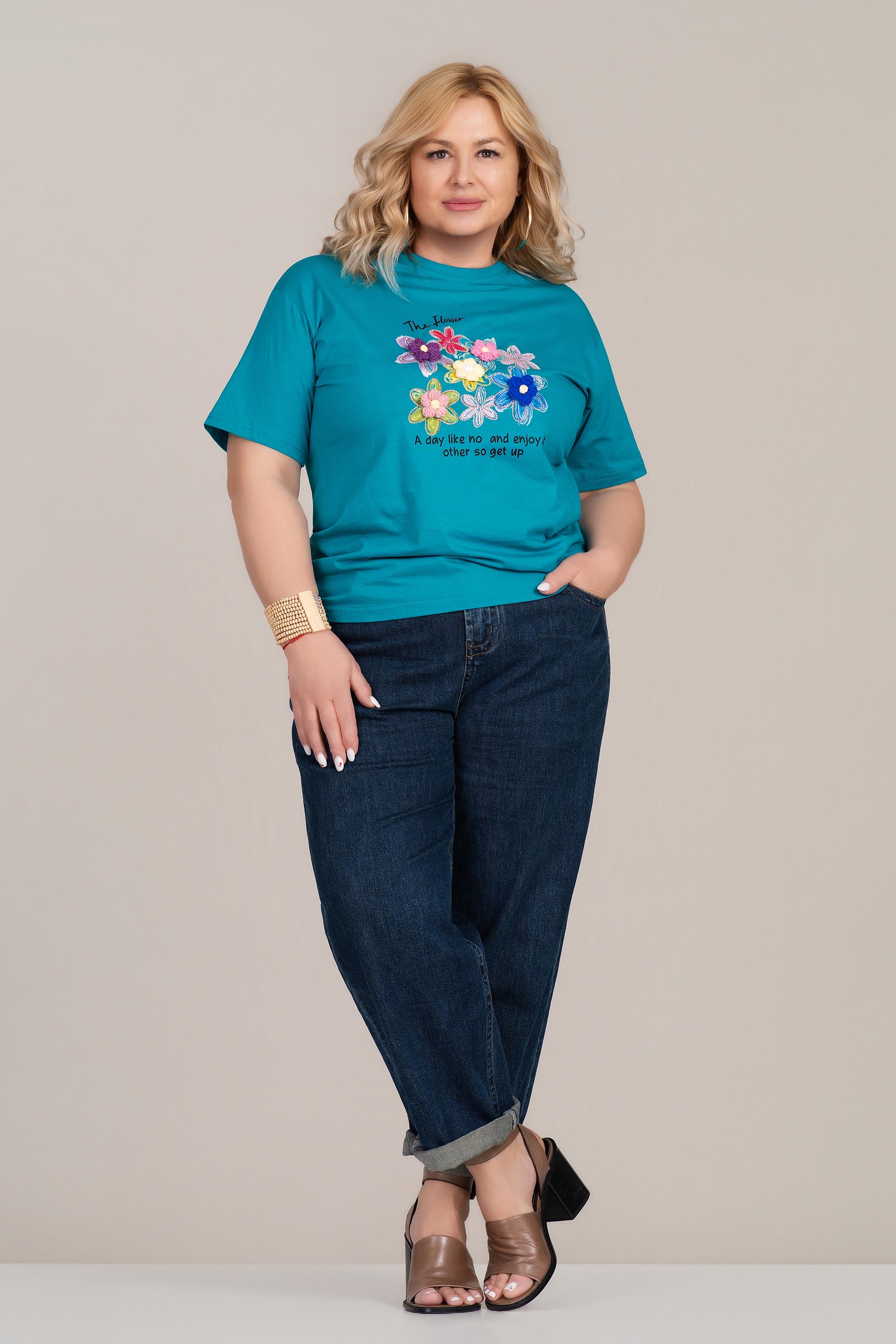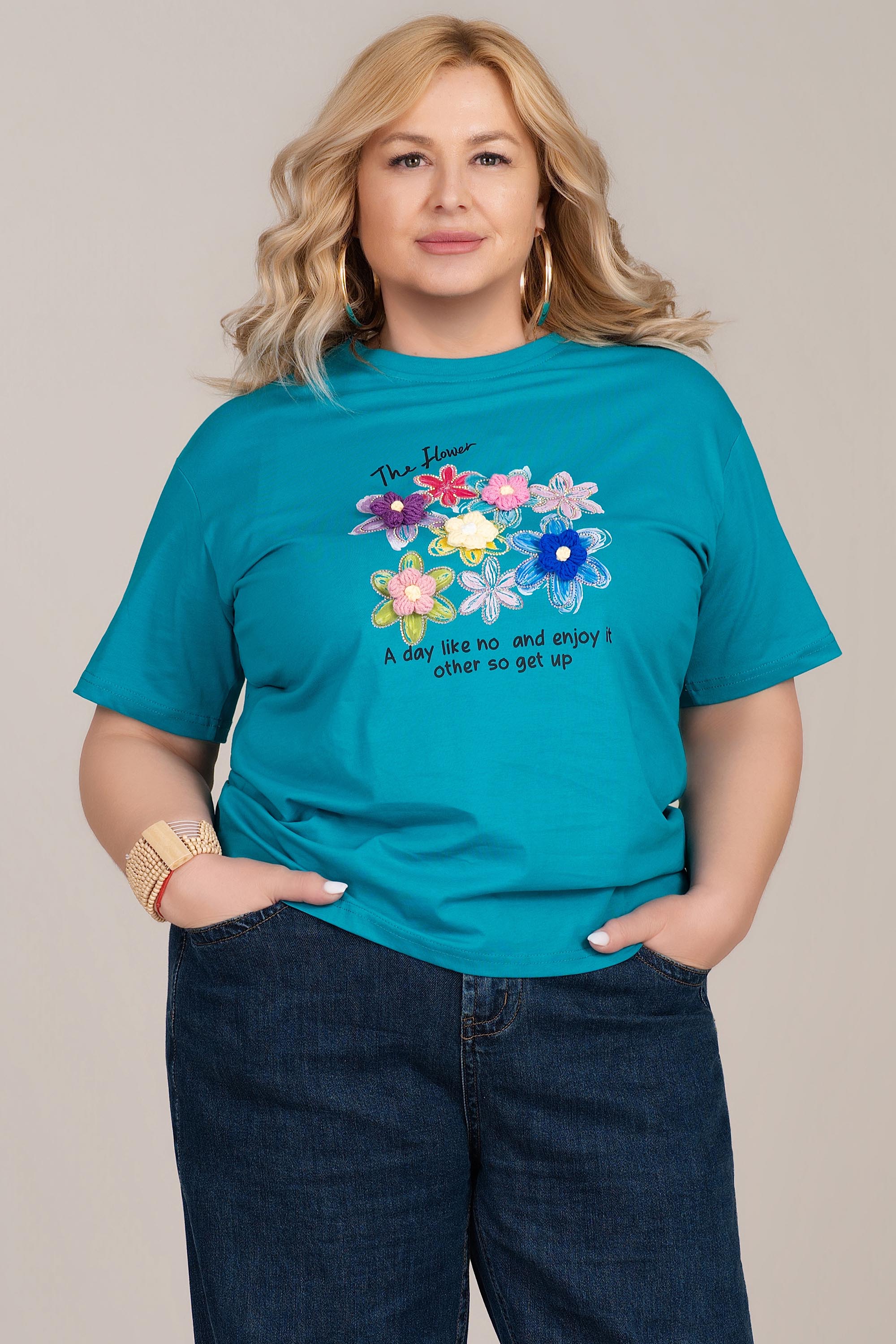МАКСИ памучна тениска в цвят тюркоаз с флорална апликация