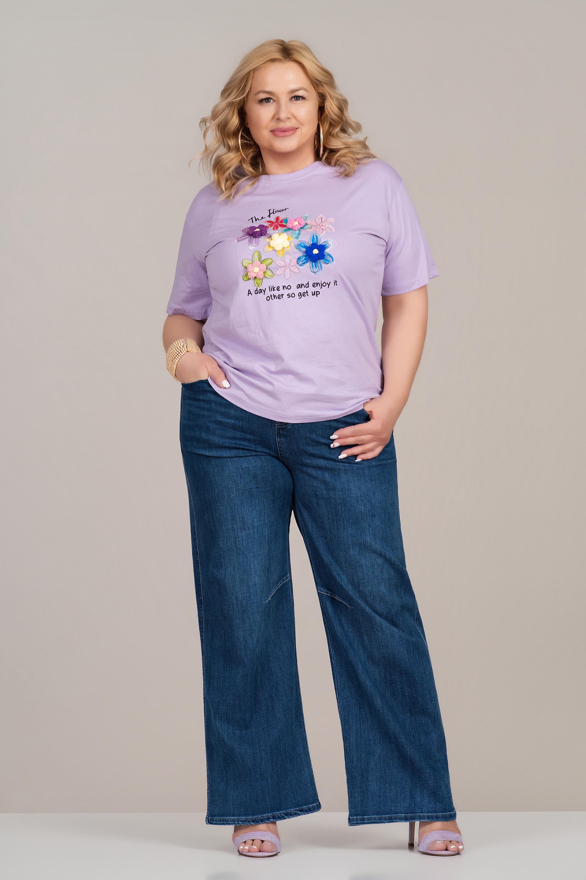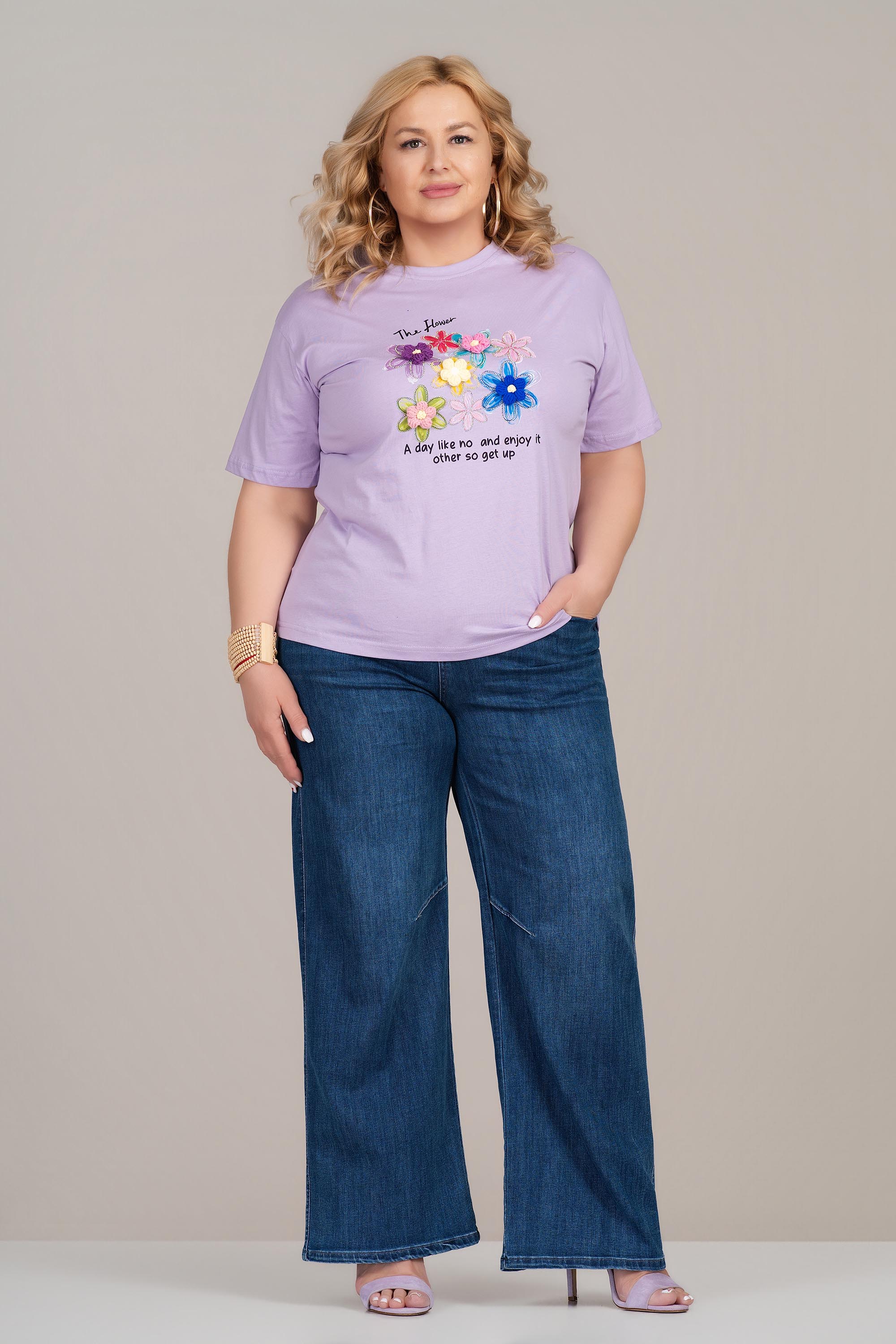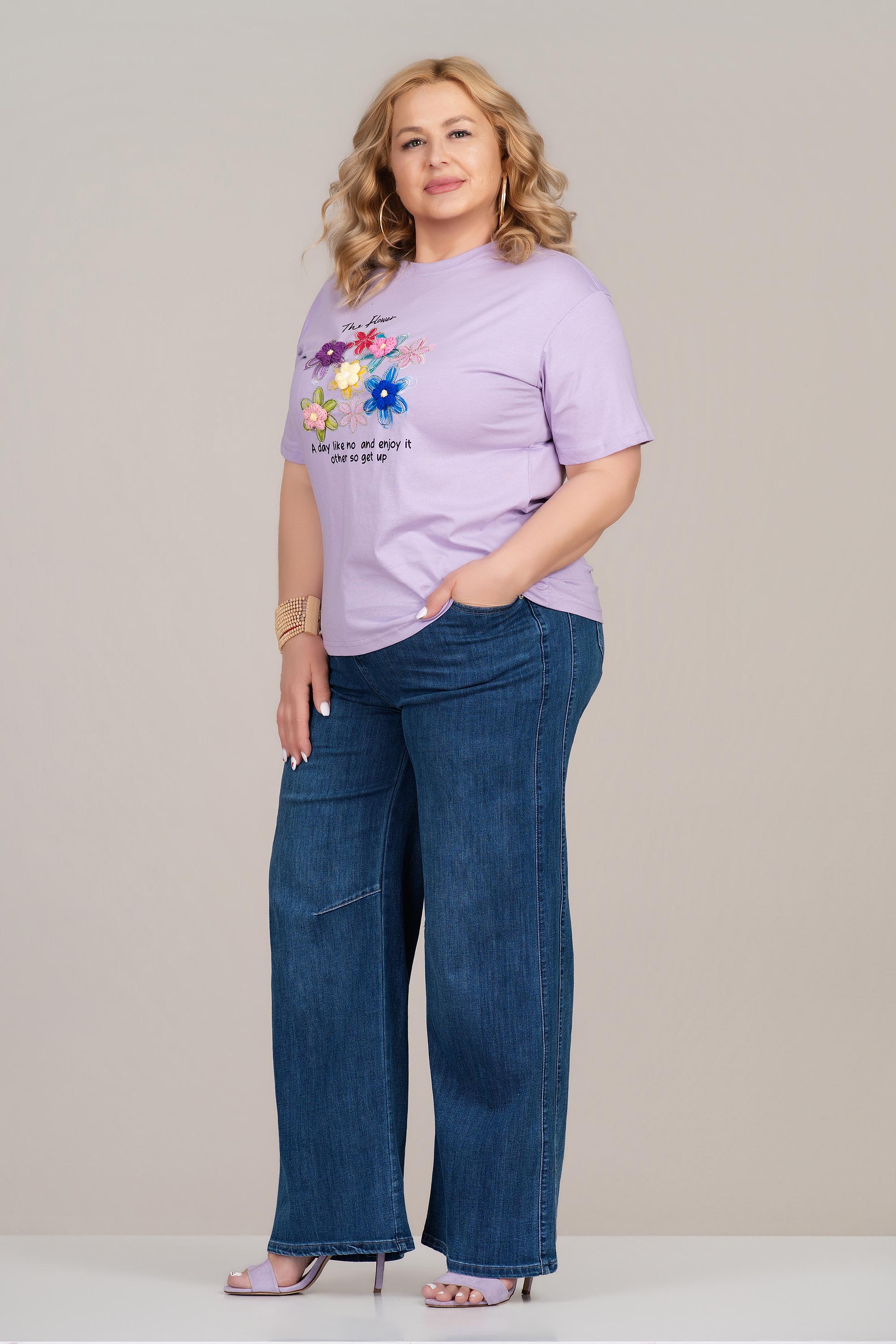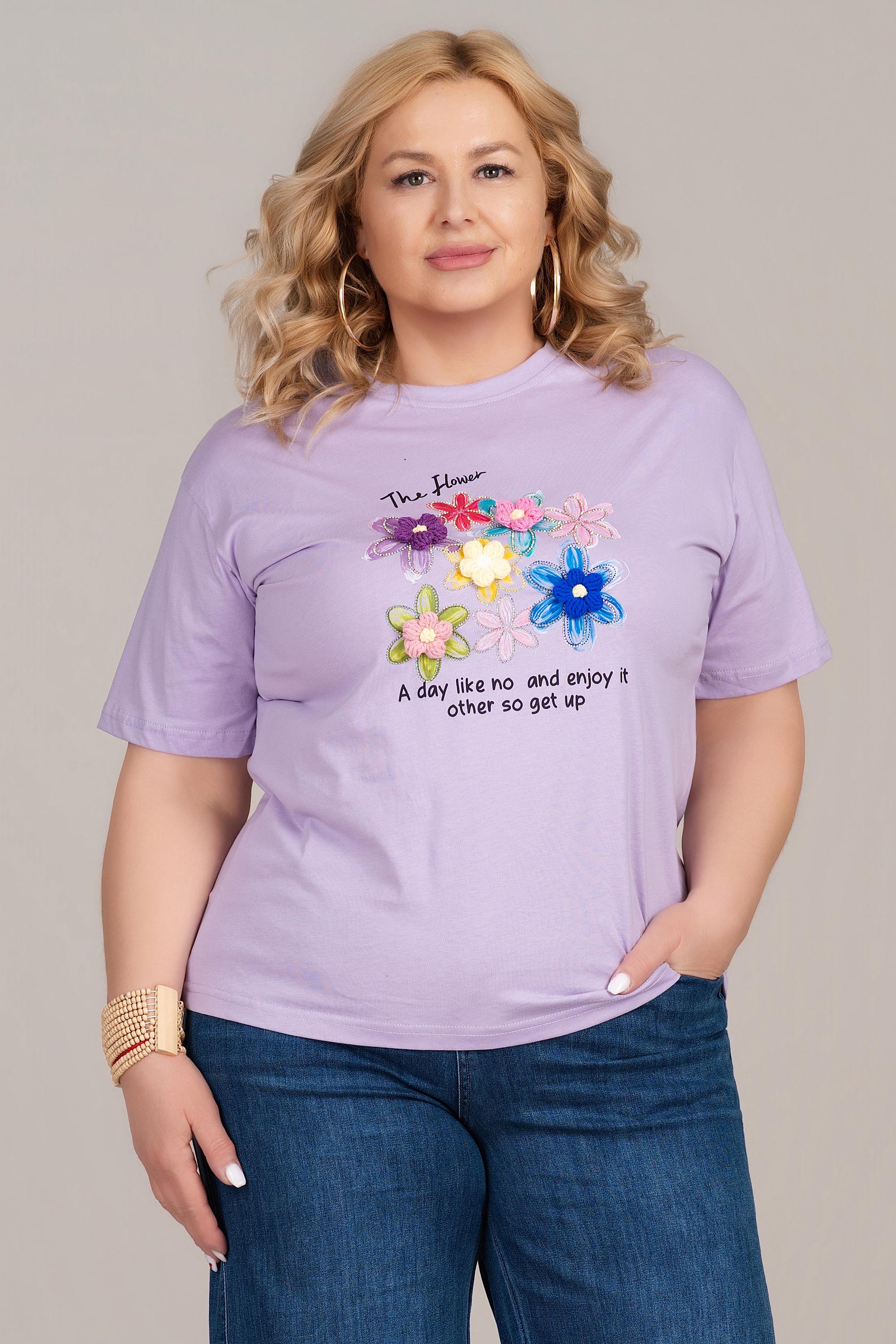 МАКСИ памучна тениска в лилаво с флорална апликация