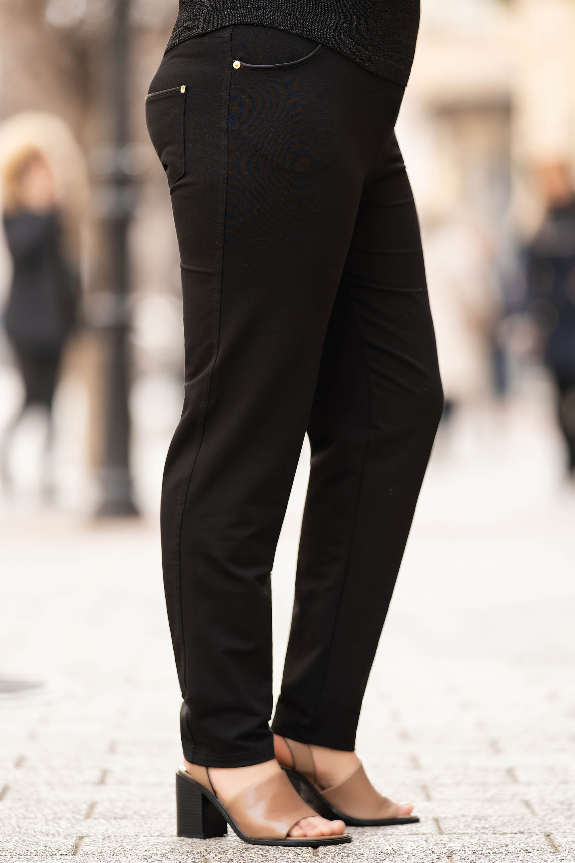 Този едноцветен макси панталон съчетава функционалност и стил с елегантен кожен кант на талията. Моделът разполага с ластик и гайки за колан, осигуряващи оптимален комфорт. Два предни и два задни джоба придават практичност, а класическият черен цвят го прави универсален избор за ежедневието.