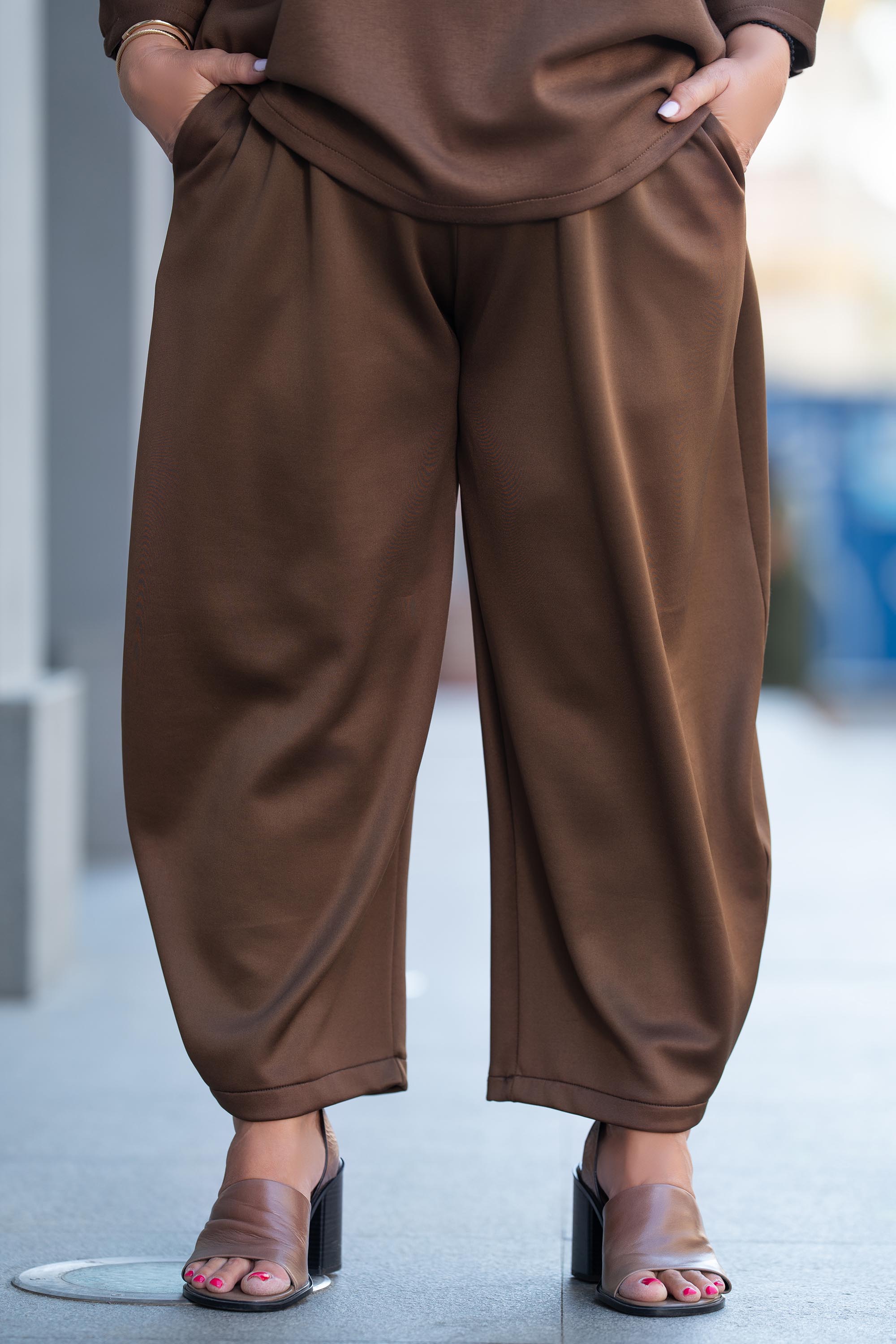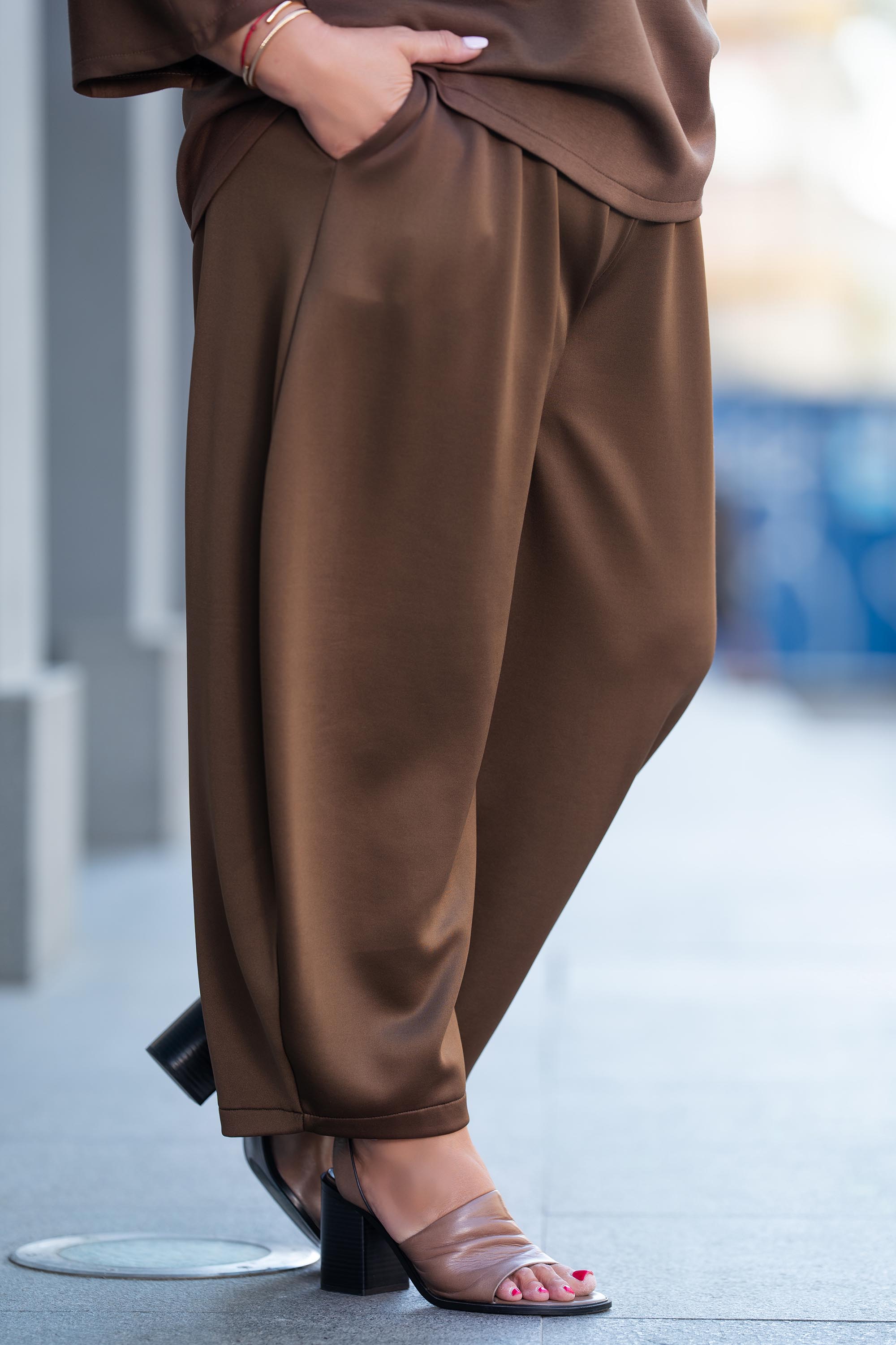 Панталонът впечатлява с модерна, свободна кройка и меко трико, което осигурява комфорт и елегантност през целия ден. Ластикът на талията и широкият крачол създават изчистена линия, подходяща за всеки тип фигура. Кафявият нюанс добавя топлина и стил, идеален за есенно-зимния сезон. Италианска изработка с акцент върху качество и удобство.