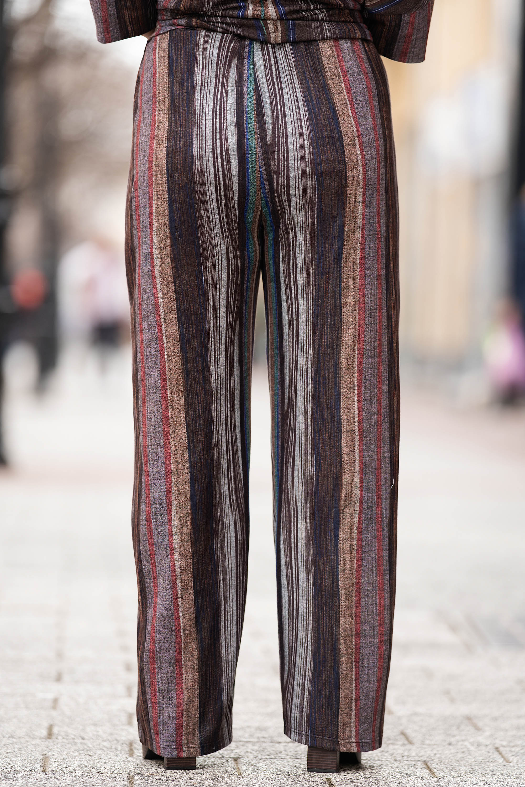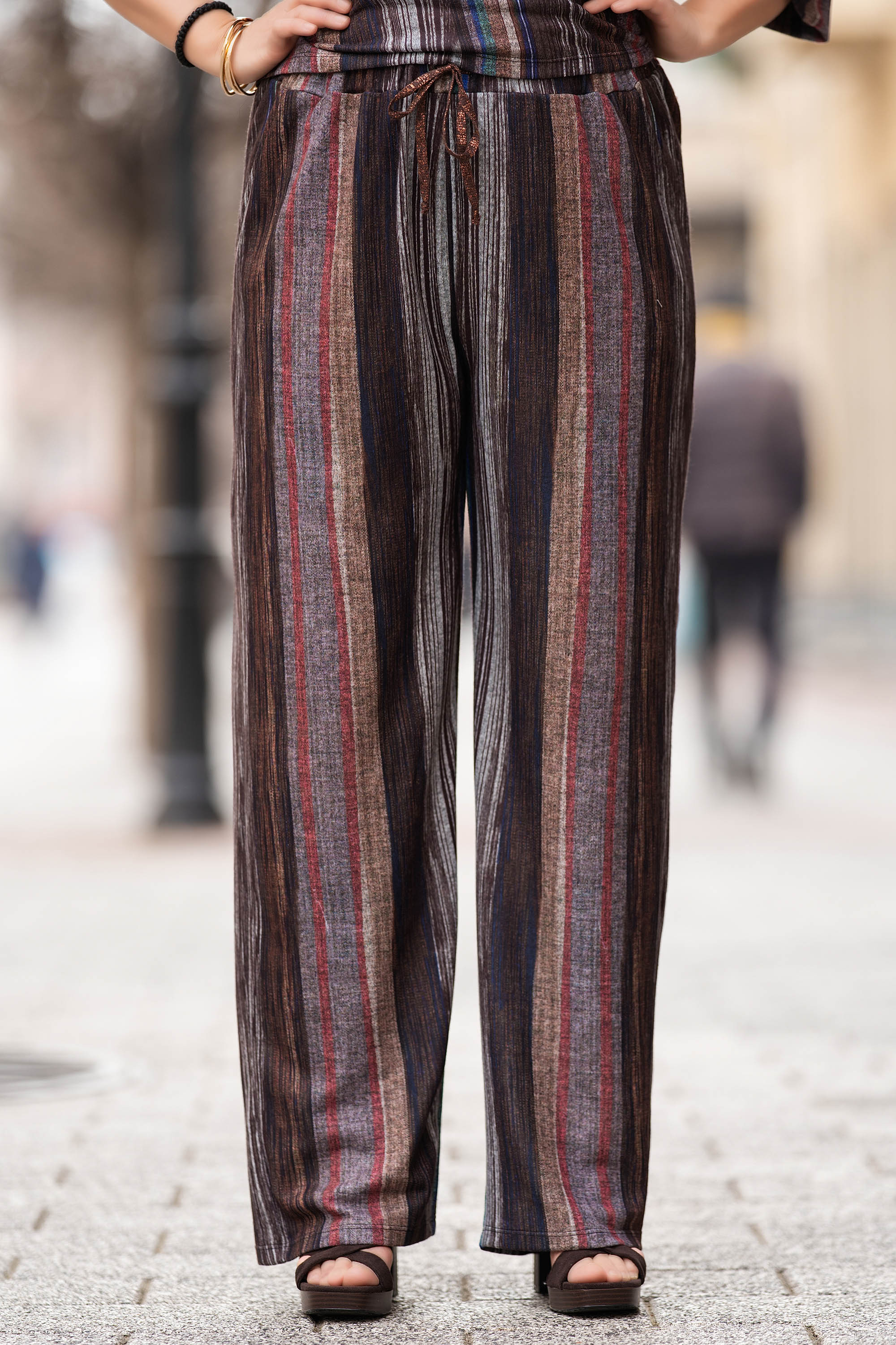 Произведен в България, този макси панталон се отличава с ефектен райе принт в синьо, червено, сиво и бежово върху топъл кафяв фон. Ластикът на талията с декоративни връзки с ламе осигурява комфорт и добавя деликатен блясък. Меката и еластична материя гарантира лекота при носене – идеален избор за ежедневието с модерно излъчване.