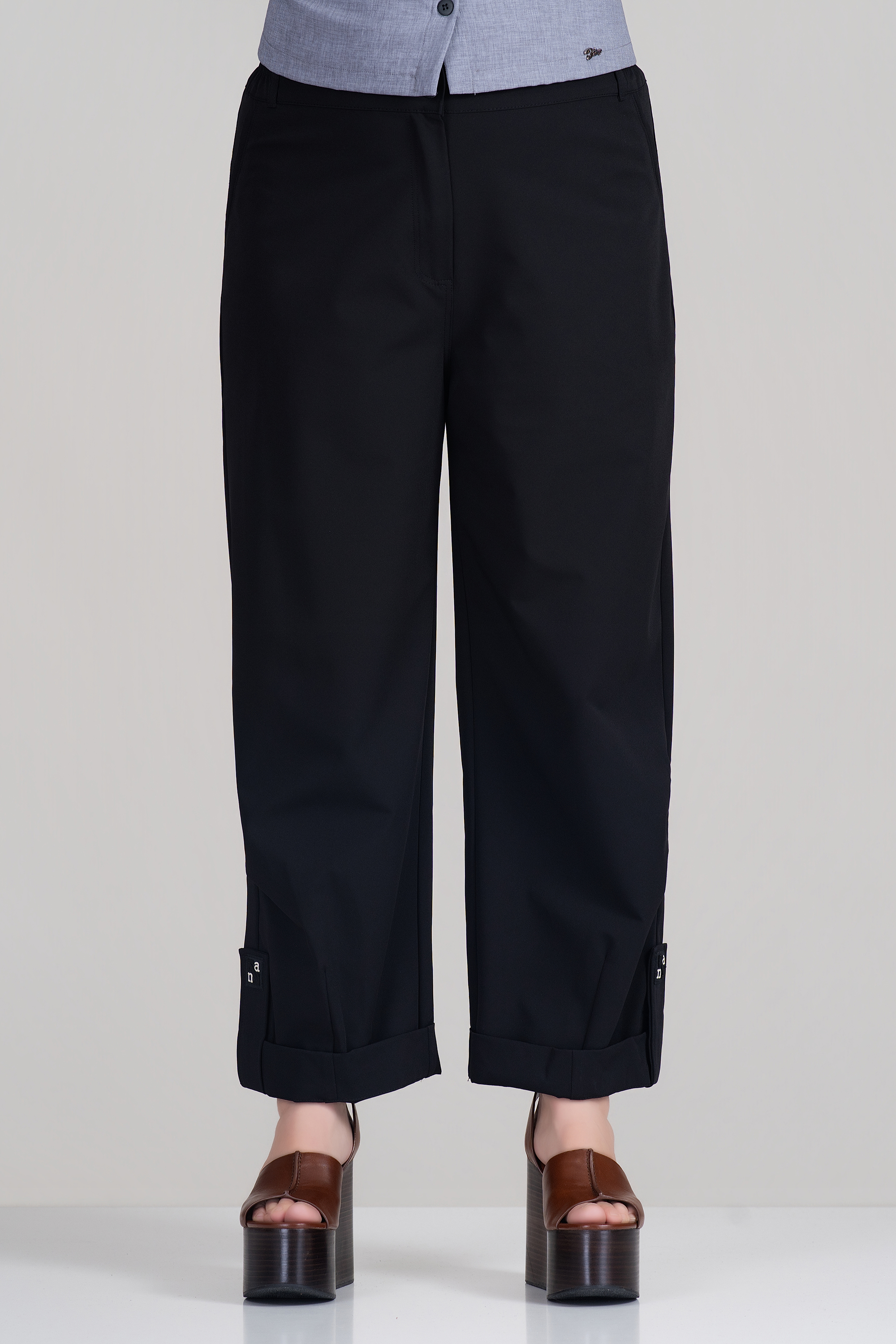 Елегантни макси панталони в класически черен цвят с изчистена линия и широк крачол. Моделът е с еластична талия, която осигурява комфорт и удобно прилягане в областта на корема. Материята е мека, падаща и с лека еластичност, което гарантира свобода на движение през целия ден. Подгъвът с декоративен акцент придава модерно излъчване и завършен стил. Подходящи както за ежедневие, така и за по-елегантна визия в комбинация с риза или блуза.