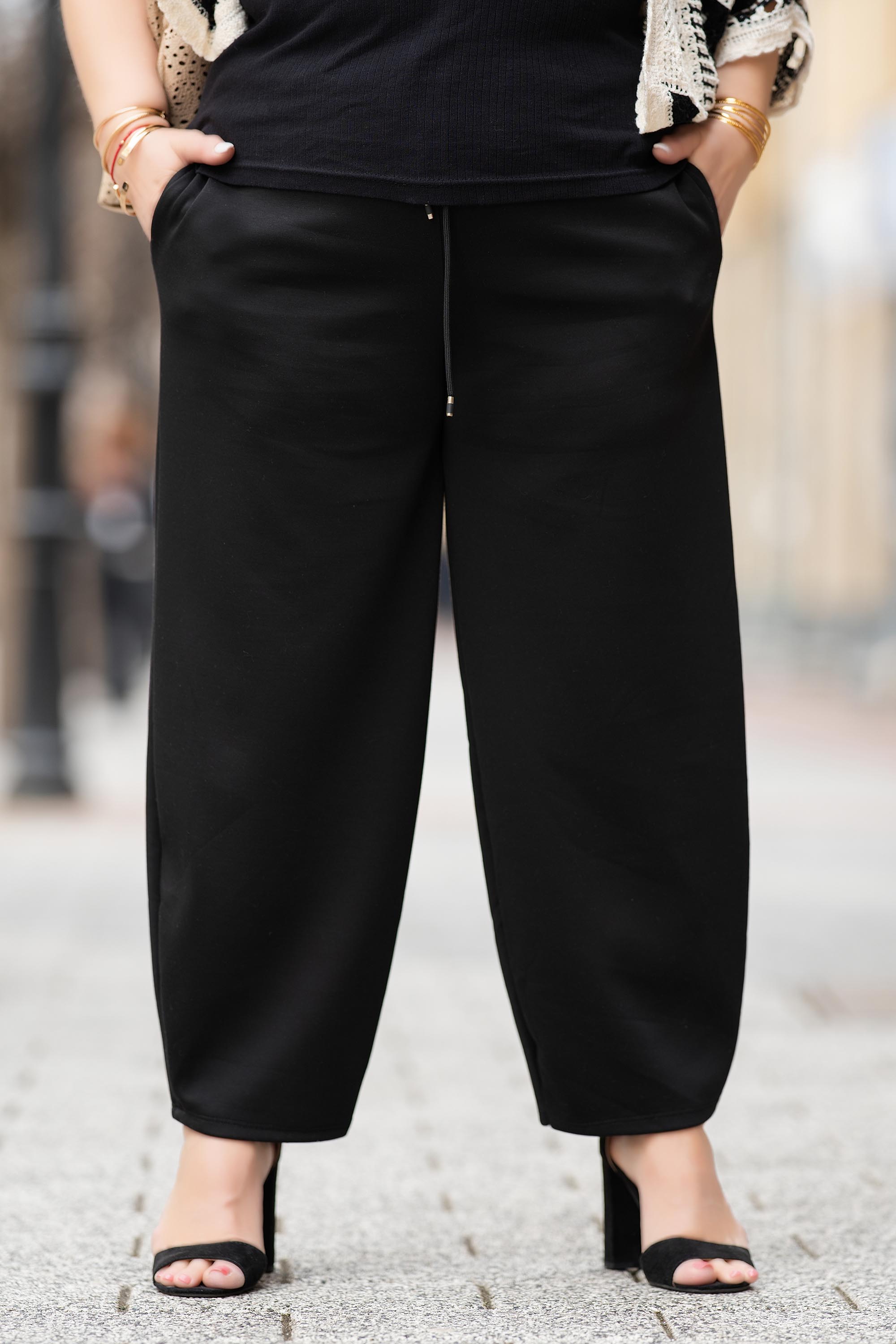 МАКСИ панталон в черно с еластична талия и връзки