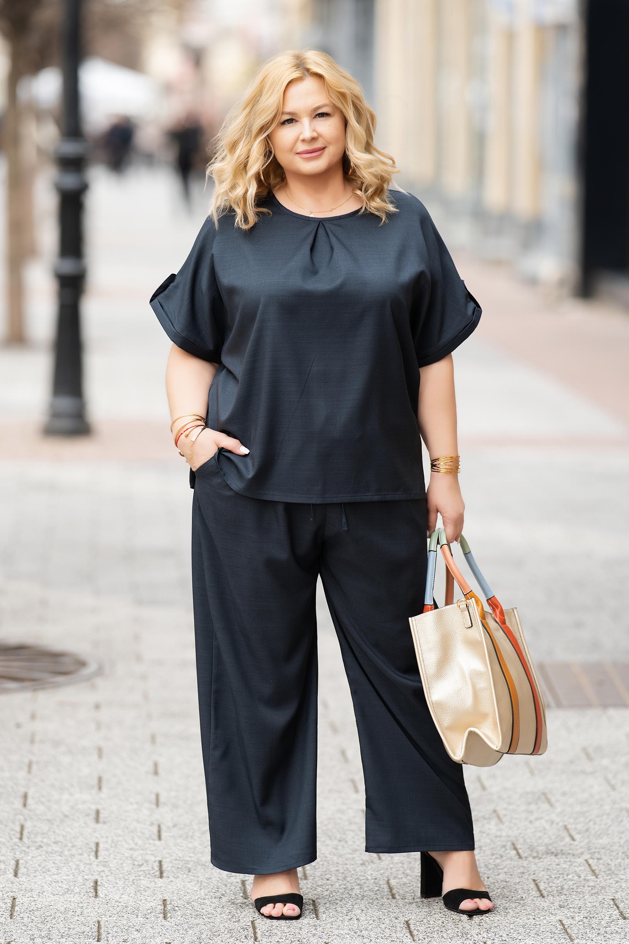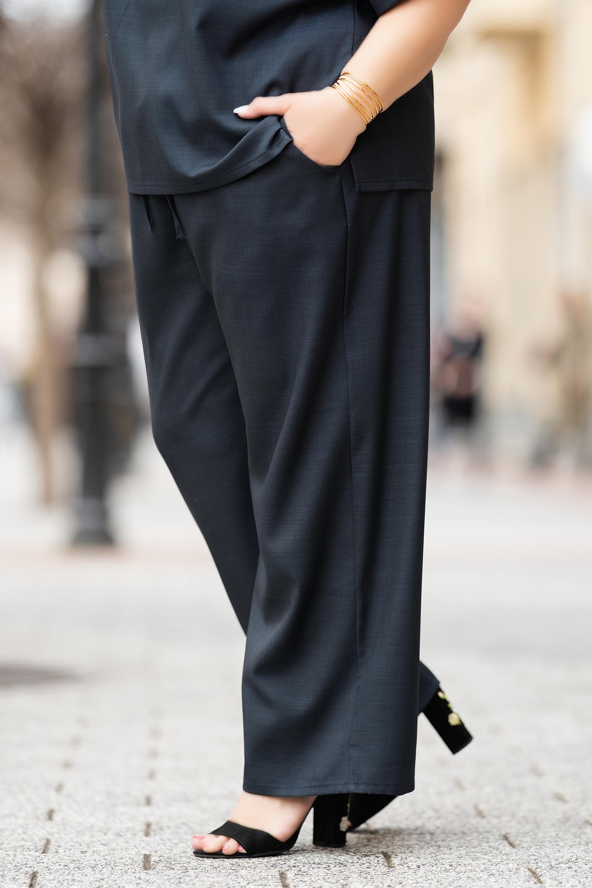 Практичен макси панталон в класическо черно, създаден за максимален комфорт в ежедневието. Леката и гладка материя осигурява приятно усещане при допир и свобода на движение. Еластичната талия с връзки позволява лесно регулиране и удобно прилягане. Широкият крачол придава модерна визия и визуално издължава силуета.