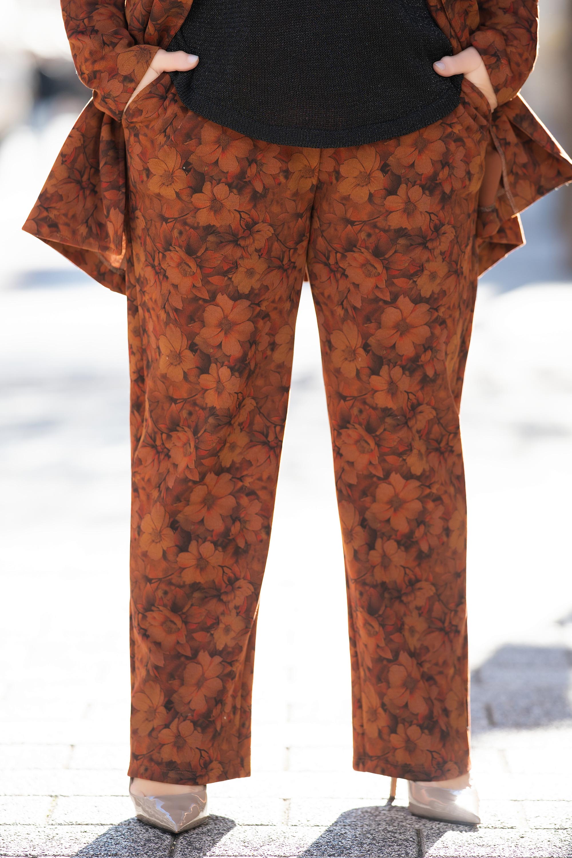 Изработен от удобна материя с лека еластичност, този панталон приляга комфортно и осигурява свобода на движение през целия ден. Свободната кройка и изчистената линия го правят подходящ за ежедневието и офиса. Стилният флорален десен в керемидената гама придава меко излъчване с женствен акцент.