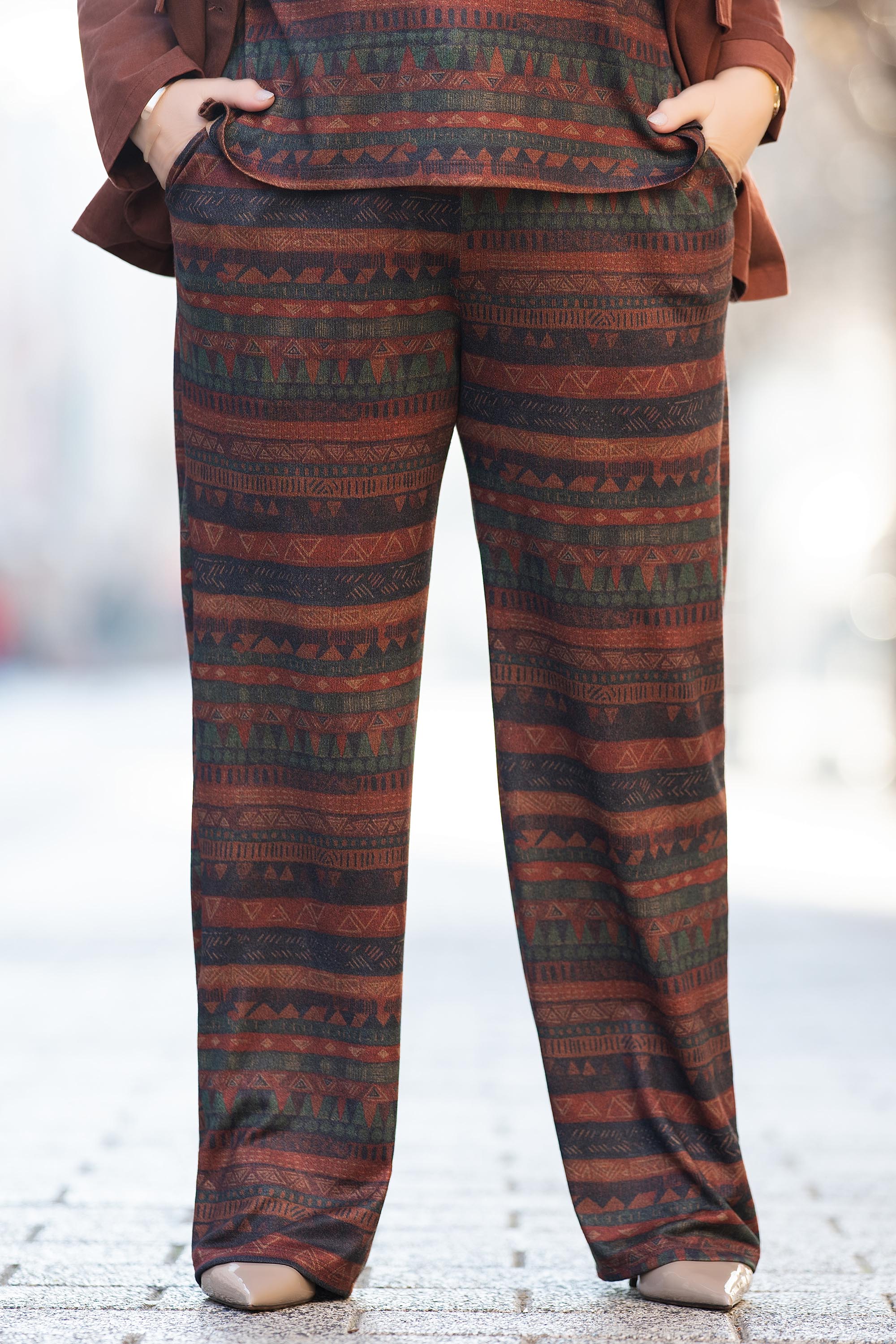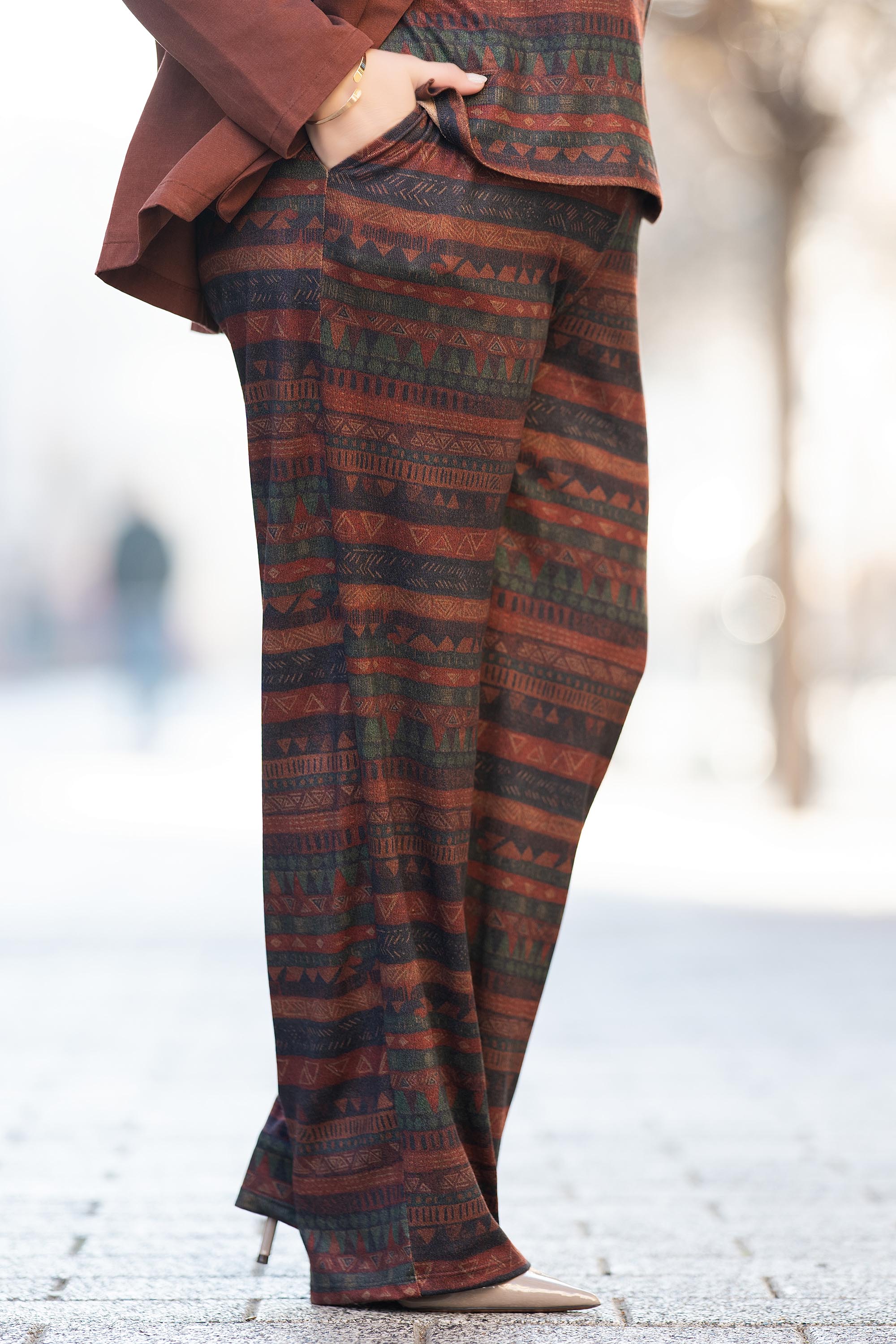 Ежедневен макси панталон с прав силует и етно принт в в кафяво и зелено. Талията е с ластик и връзка, което гарантира удобно прилягане. Материята е лека и мека, идеална за сезоните пролет и есен.