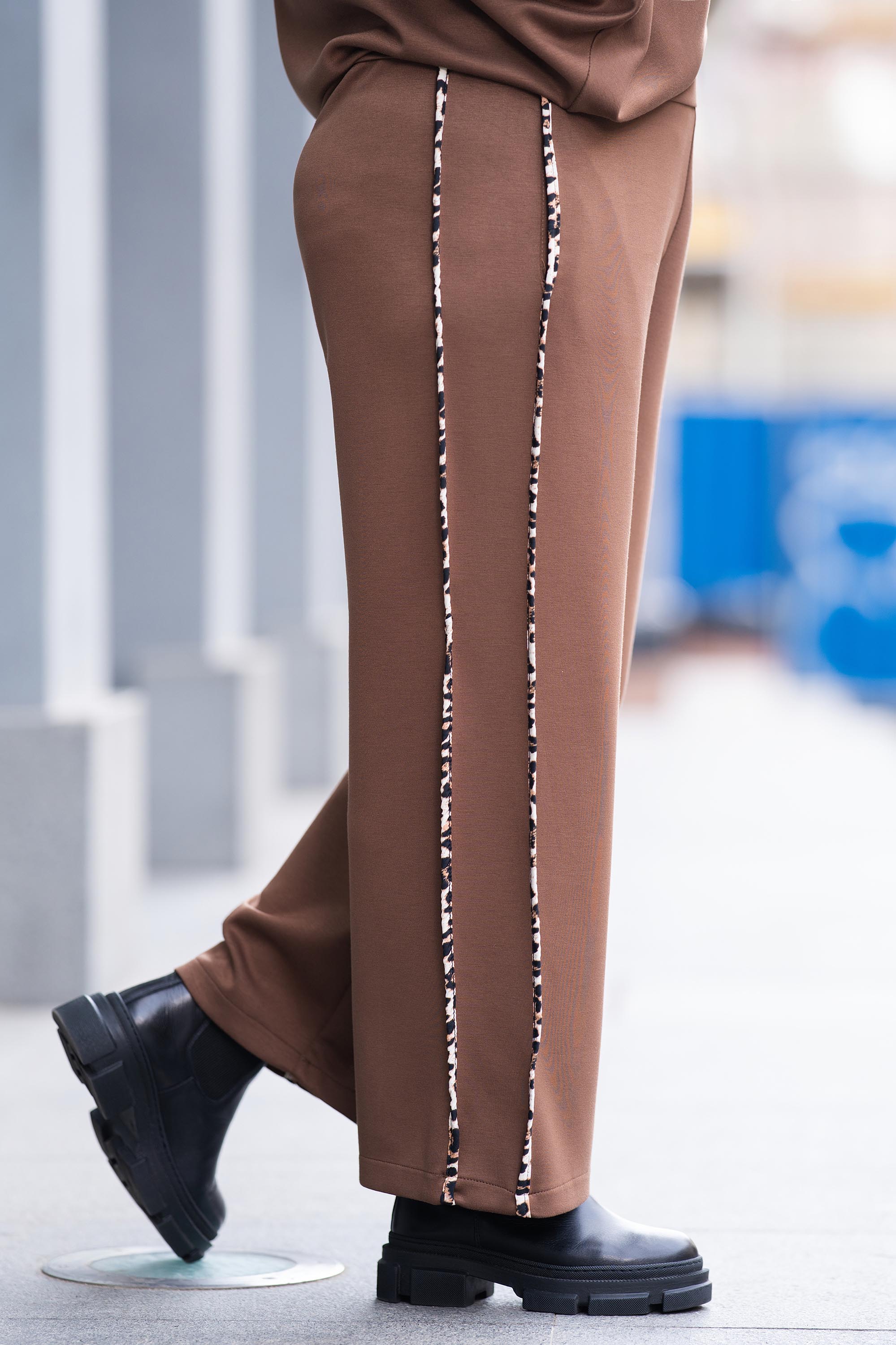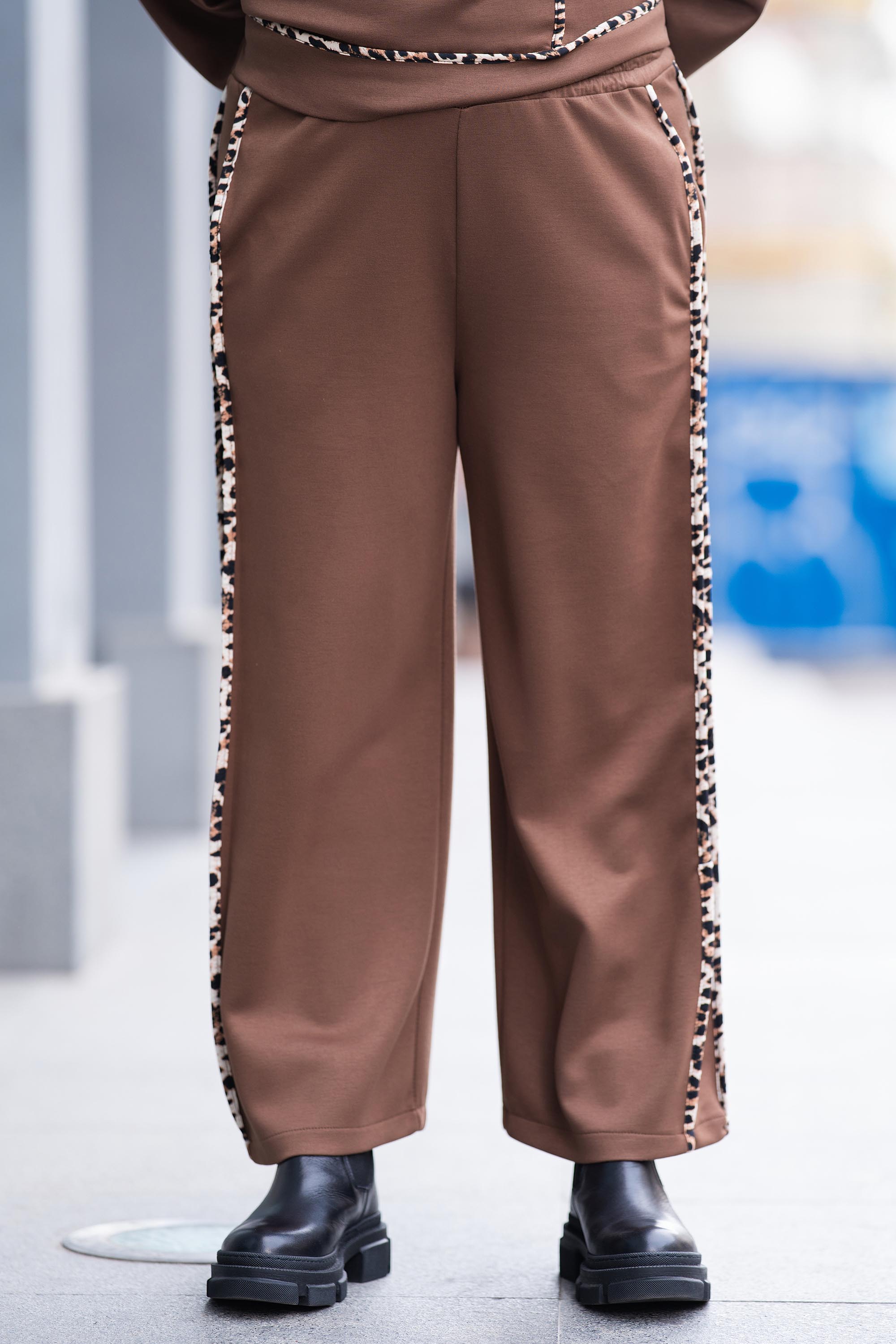 Панталон с широка и удобна кройка, изработен от мекa и средно плътна материя с еластичност. Моделът е с ластична талия за по-добро прилягане и е завършен с атрактивен леопардов кант по дължината на крачолите. Кафявият цвят придава елегантност и лесно се съчетава както с ежедневни, така и с по-стилни тоалети.