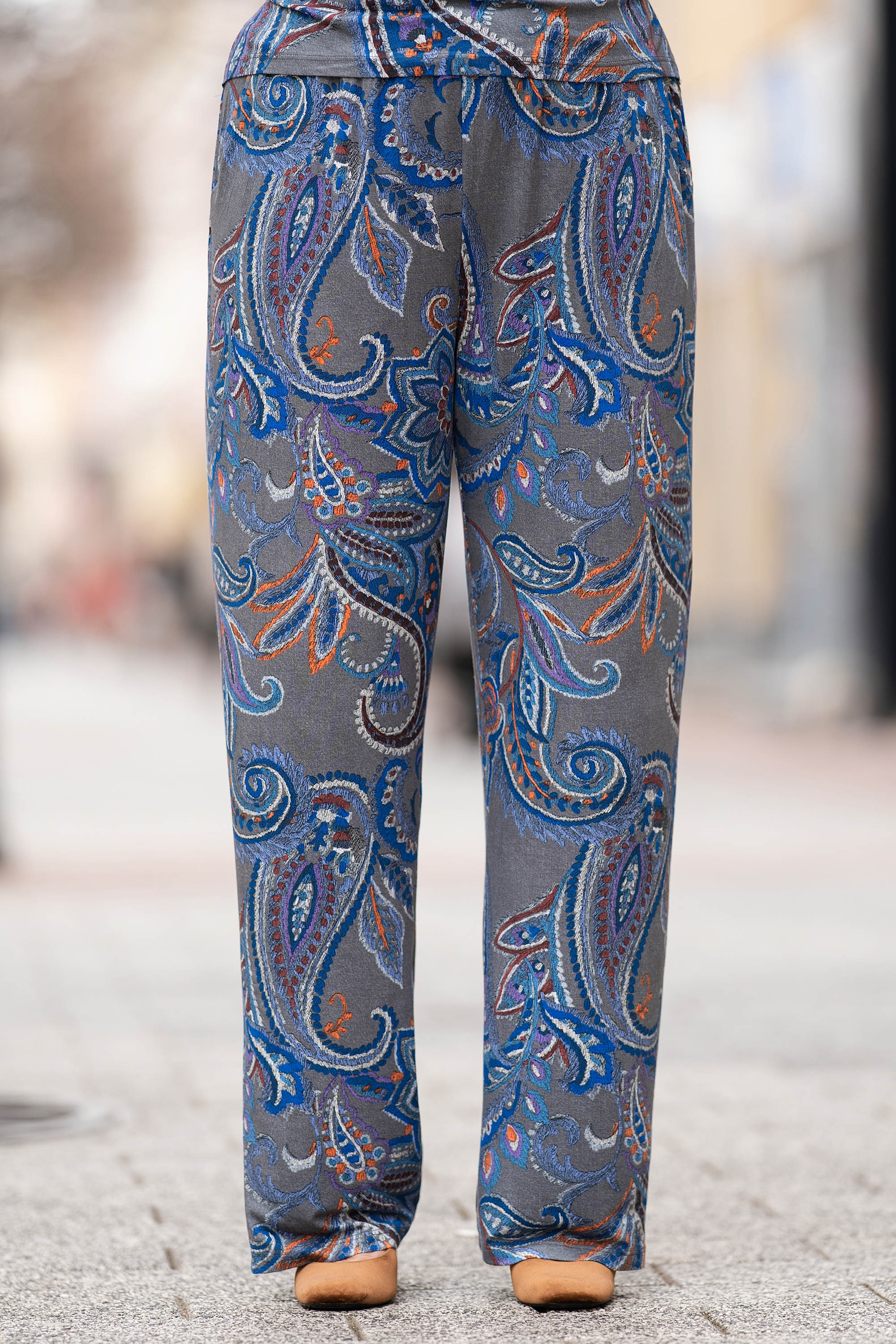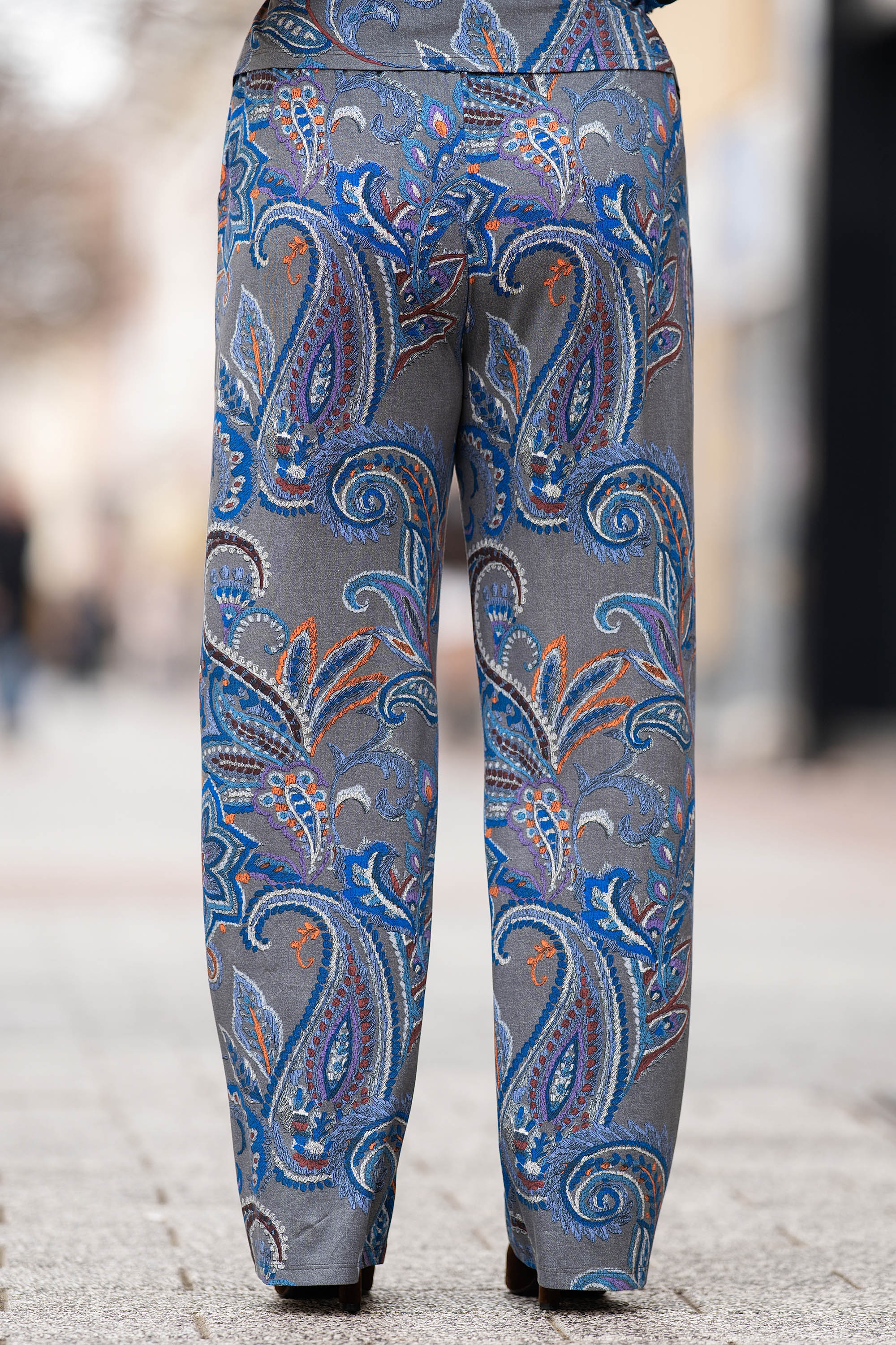 МАКСИ панталон в сиво с етно принт и ластик на талията