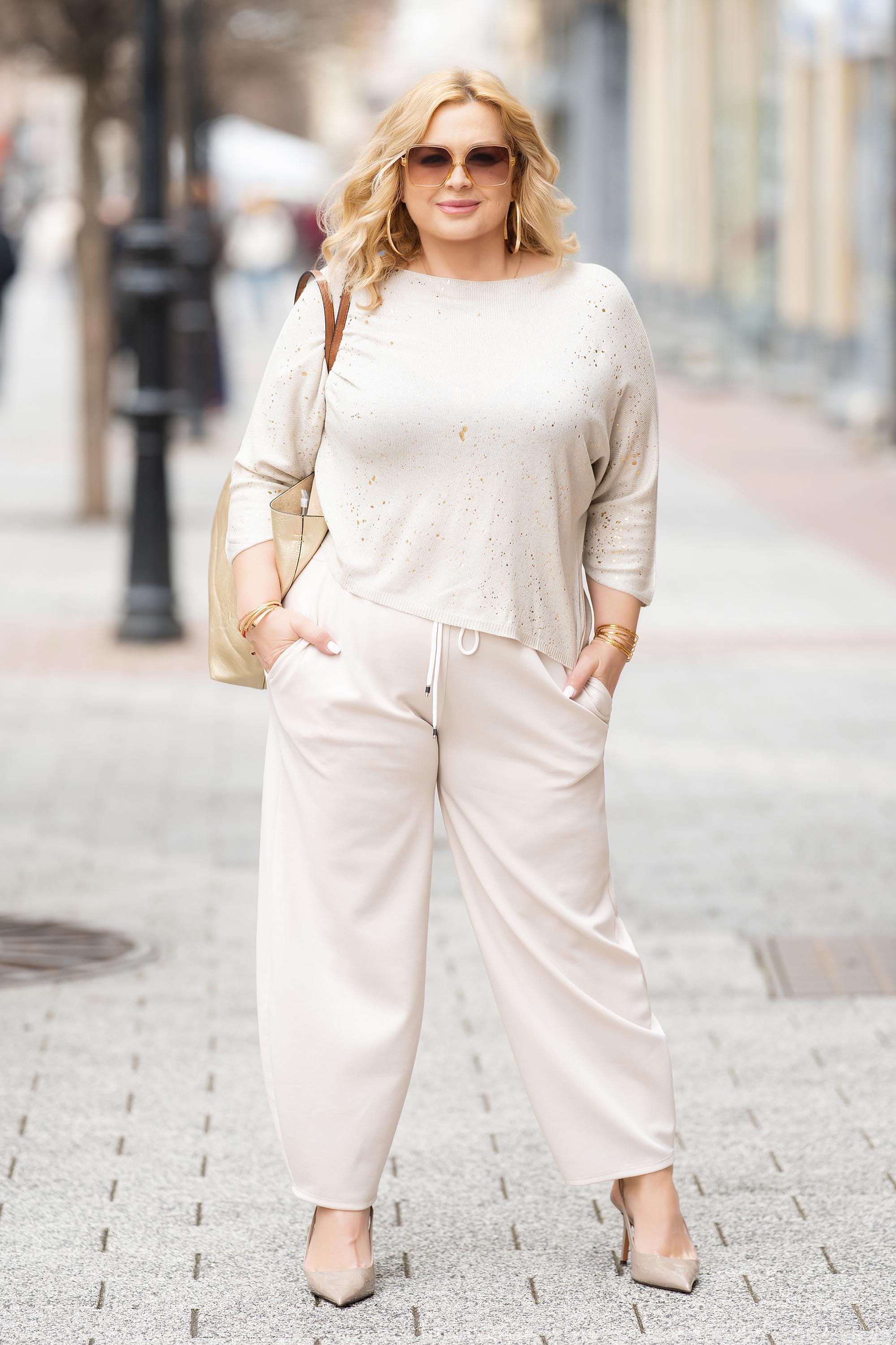 МАКСИ панталон в светлобежово с еластична талия и връзки
