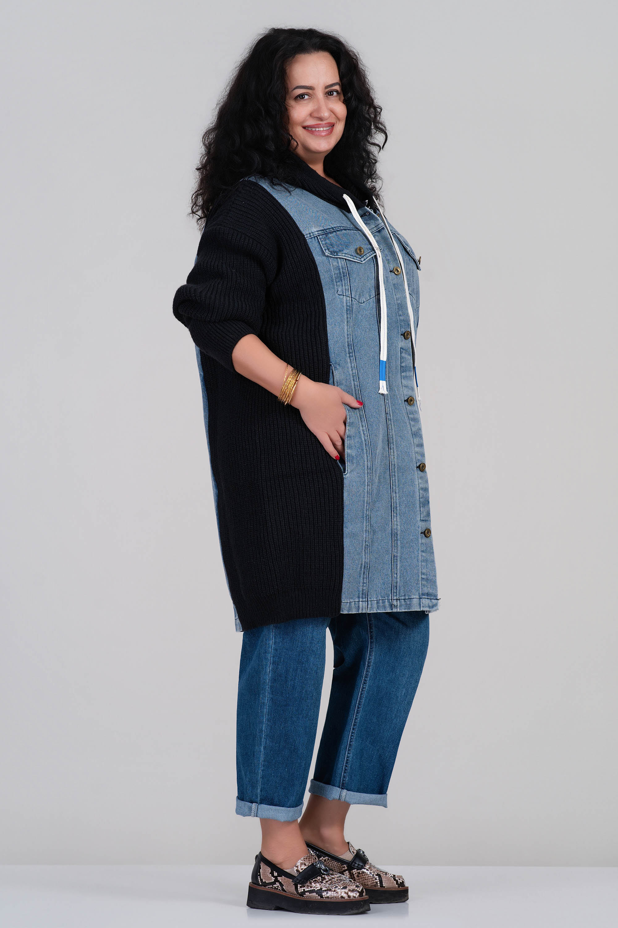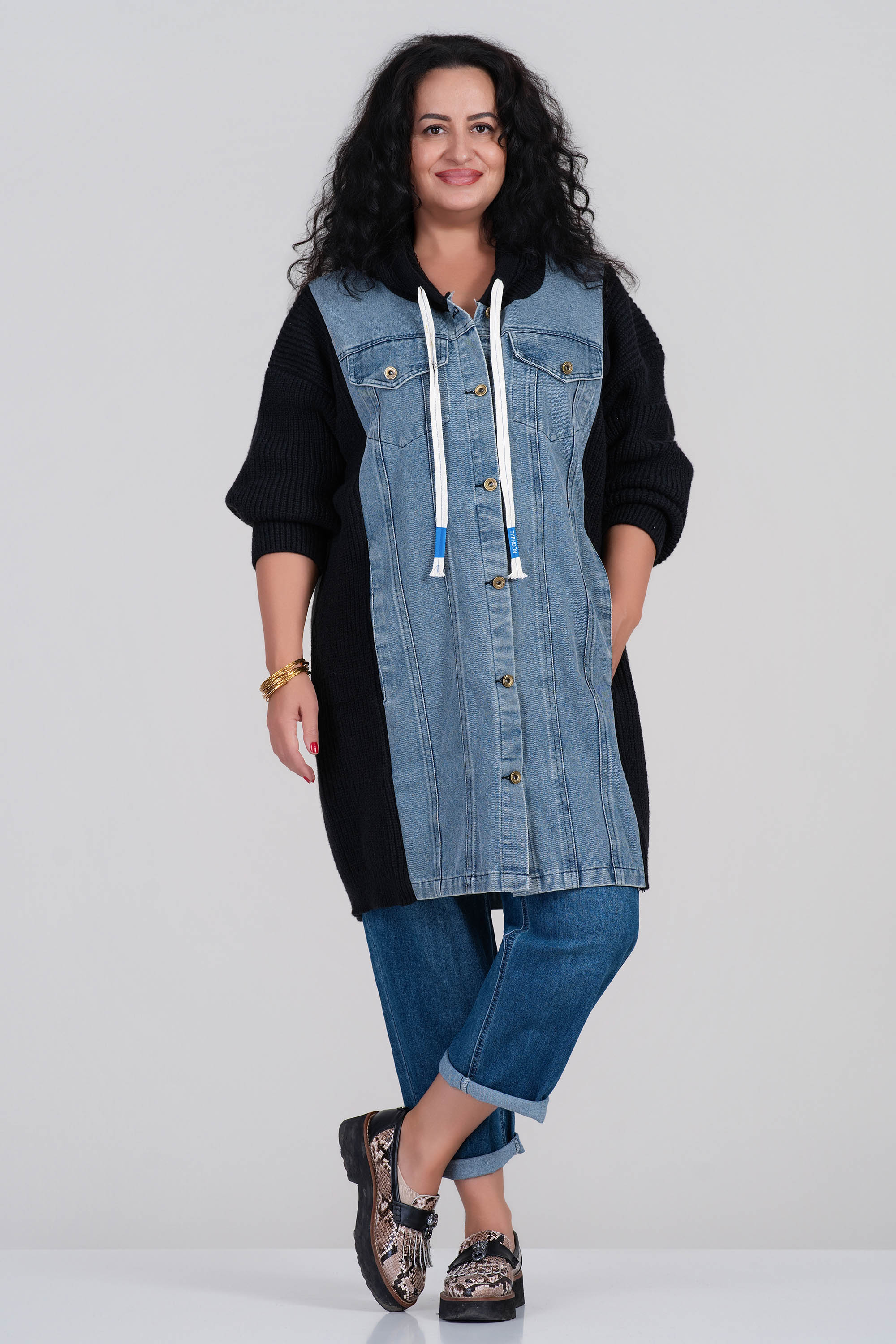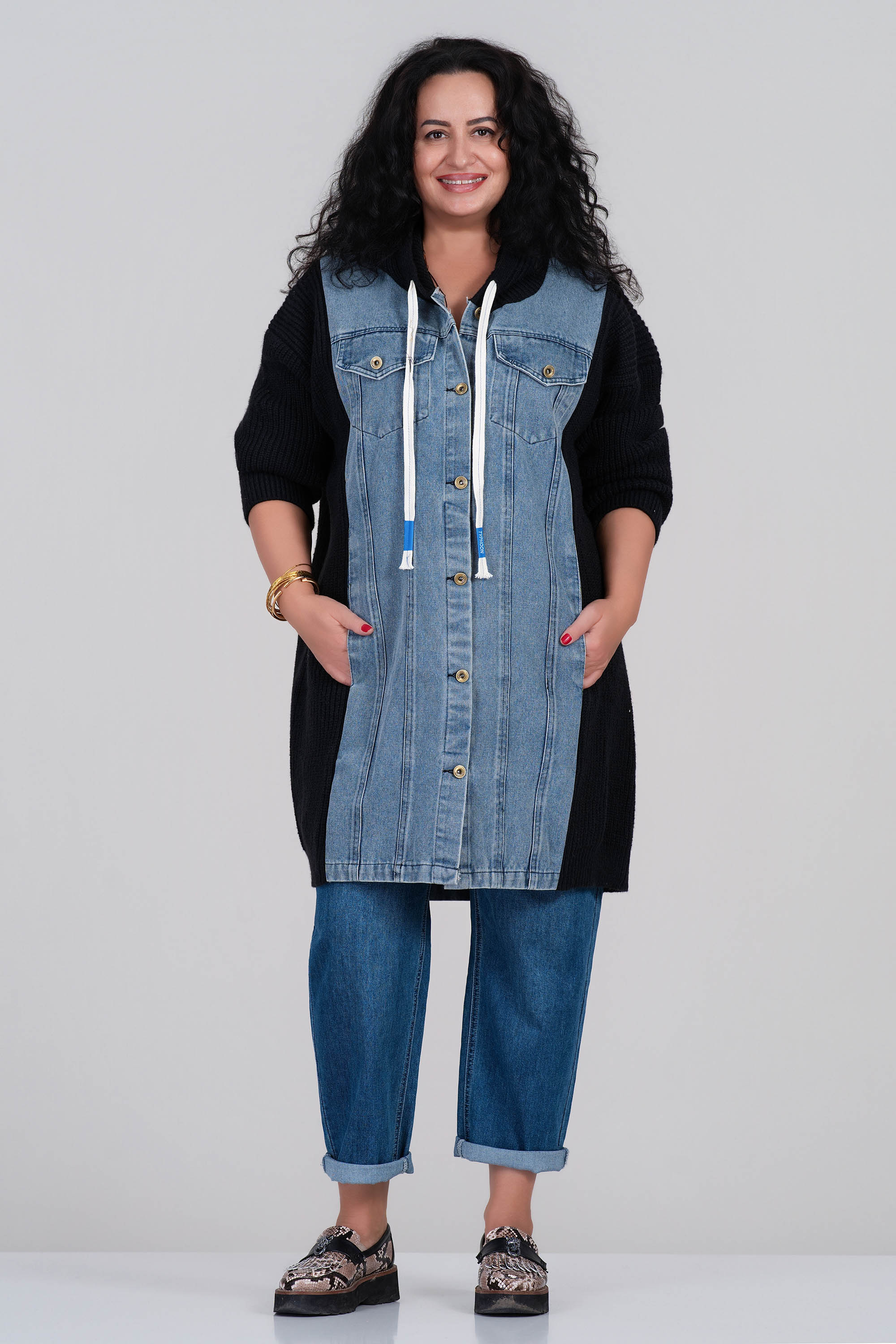 Уникална плетена жилетка в черен цвят с дънкови панели отпред и удобна качулка. Моделът съчетава мекота и комфорт с модерна визия. Има джобове с капак и метални копчета, които подчертават градския стил. Подходяща за ежедневието и прохладните дни.