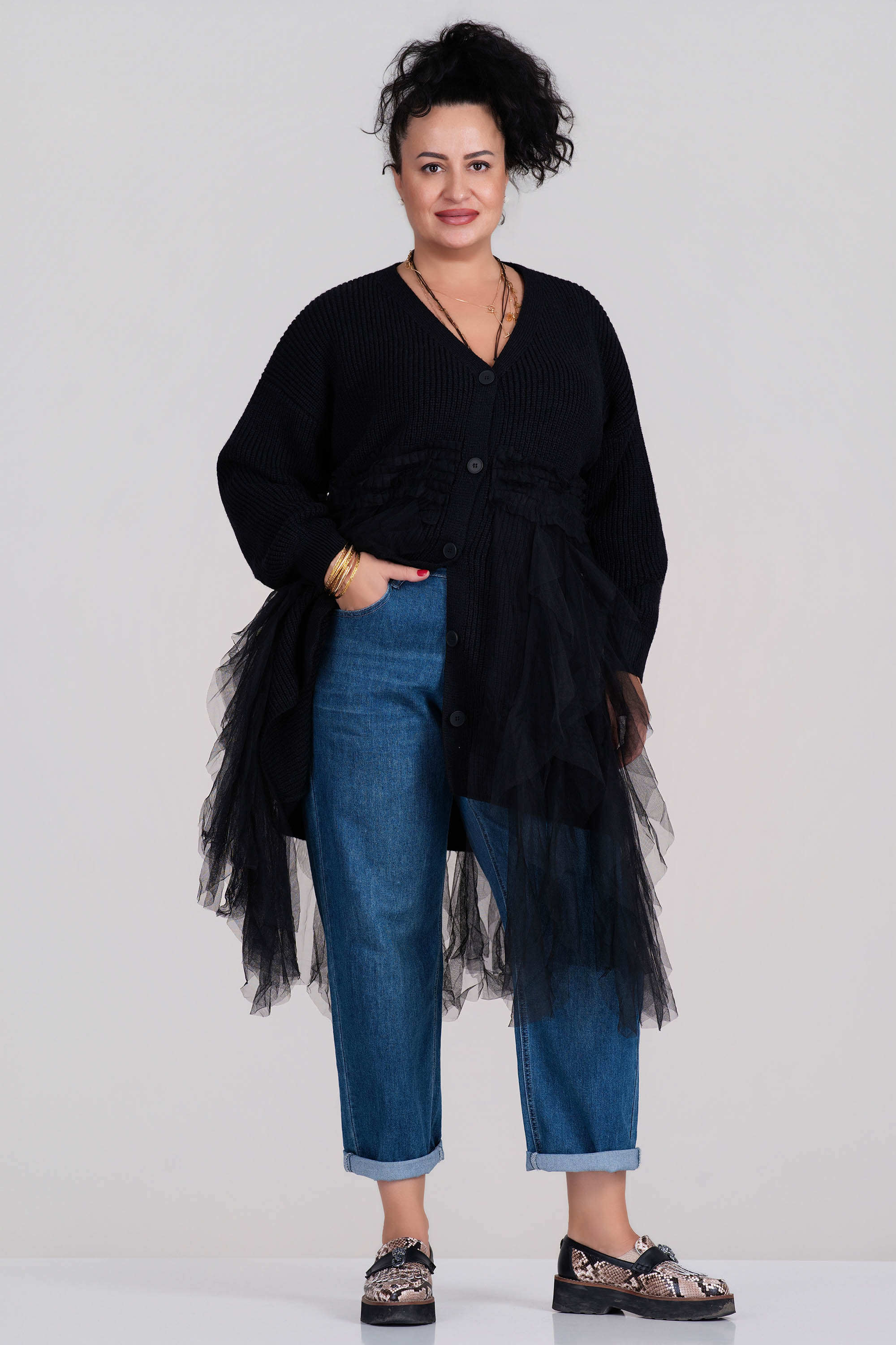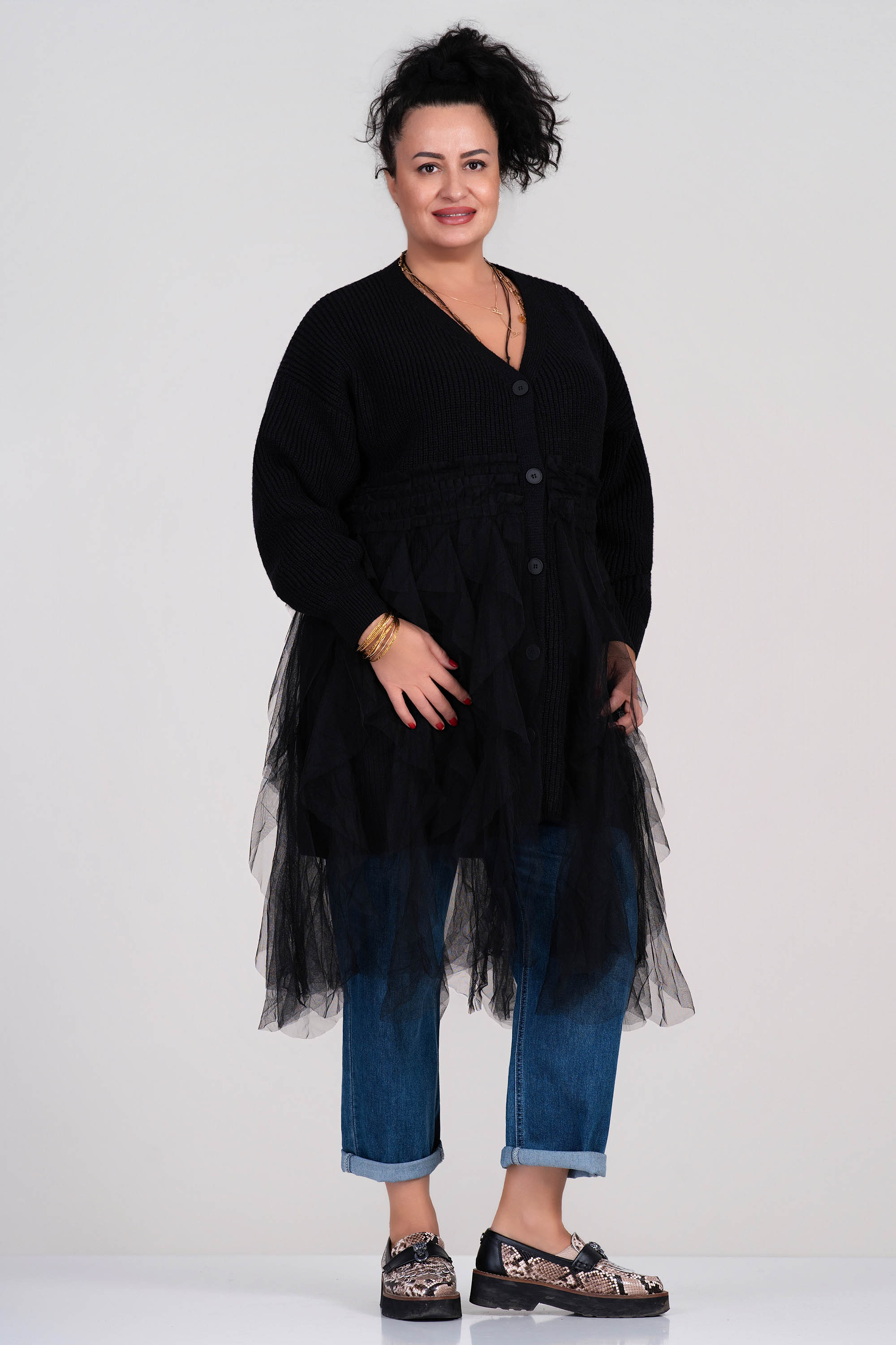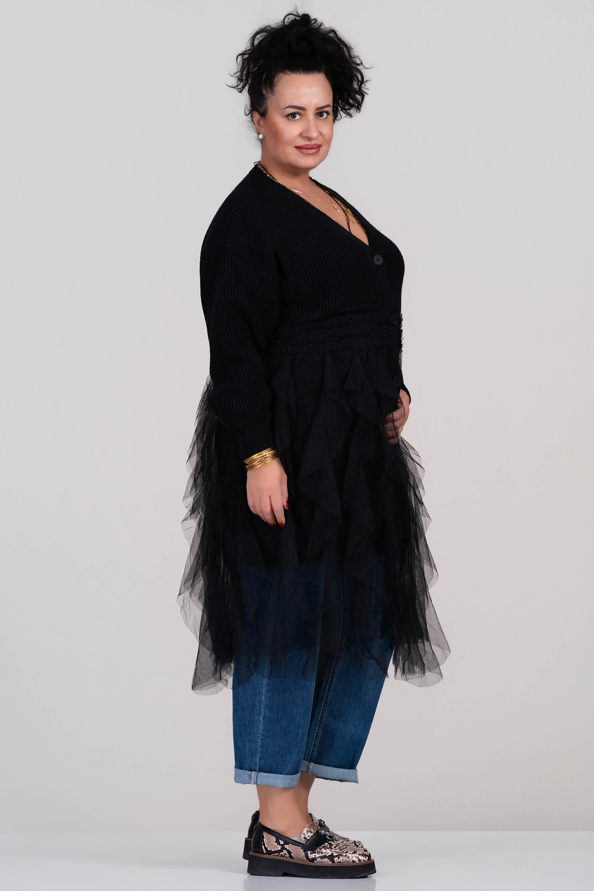 Тази жилетка впечатлява със своята комбинация от плетена структура и ефирен тюл, който придава обем и женственост. Черната гама лесно се съчетава. Кройката е удължена с остро деколте и копчета по дължина, което позволява различни начини на стилизиране. Перфектен избор за модерна визия през есенно-зимния сезон.