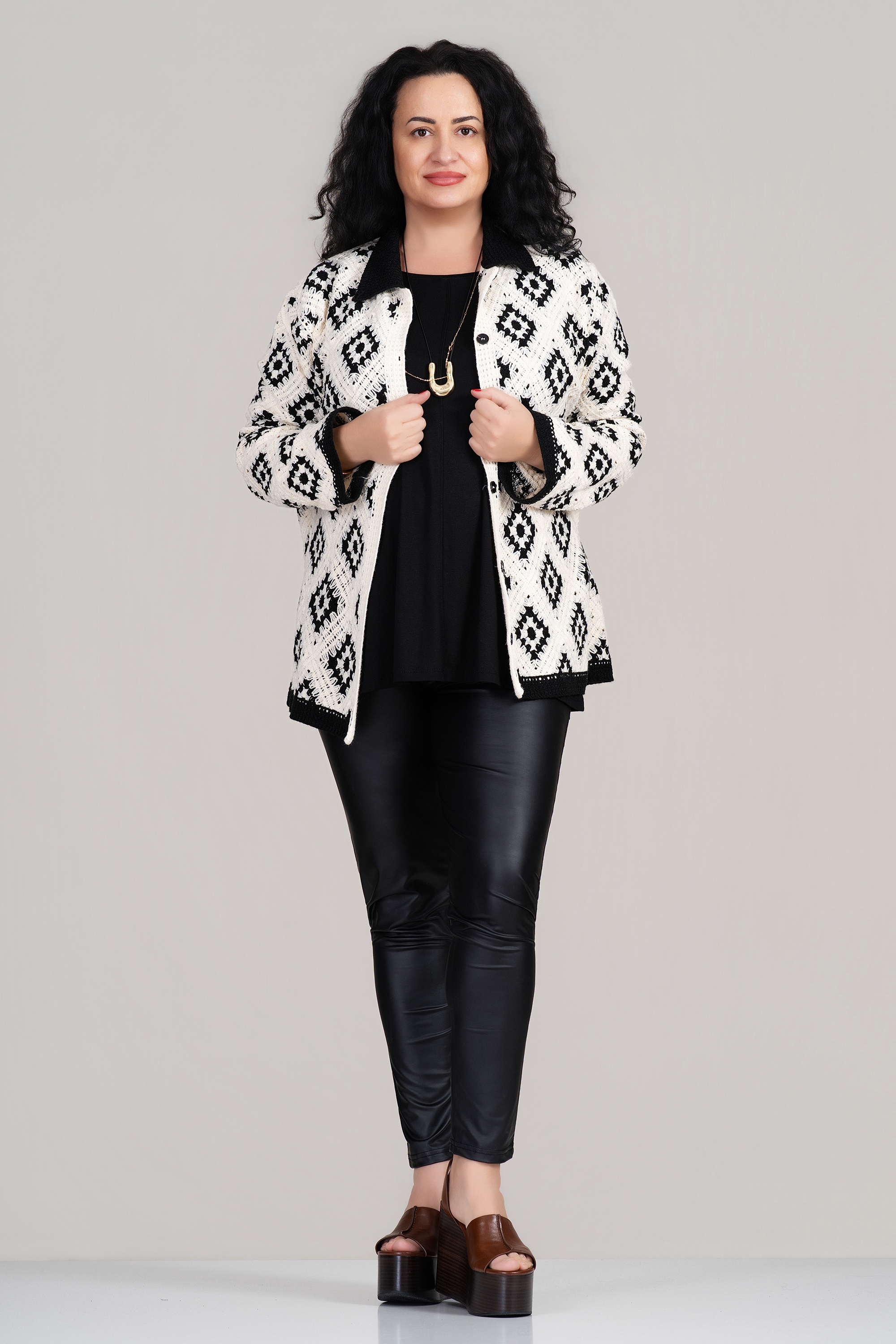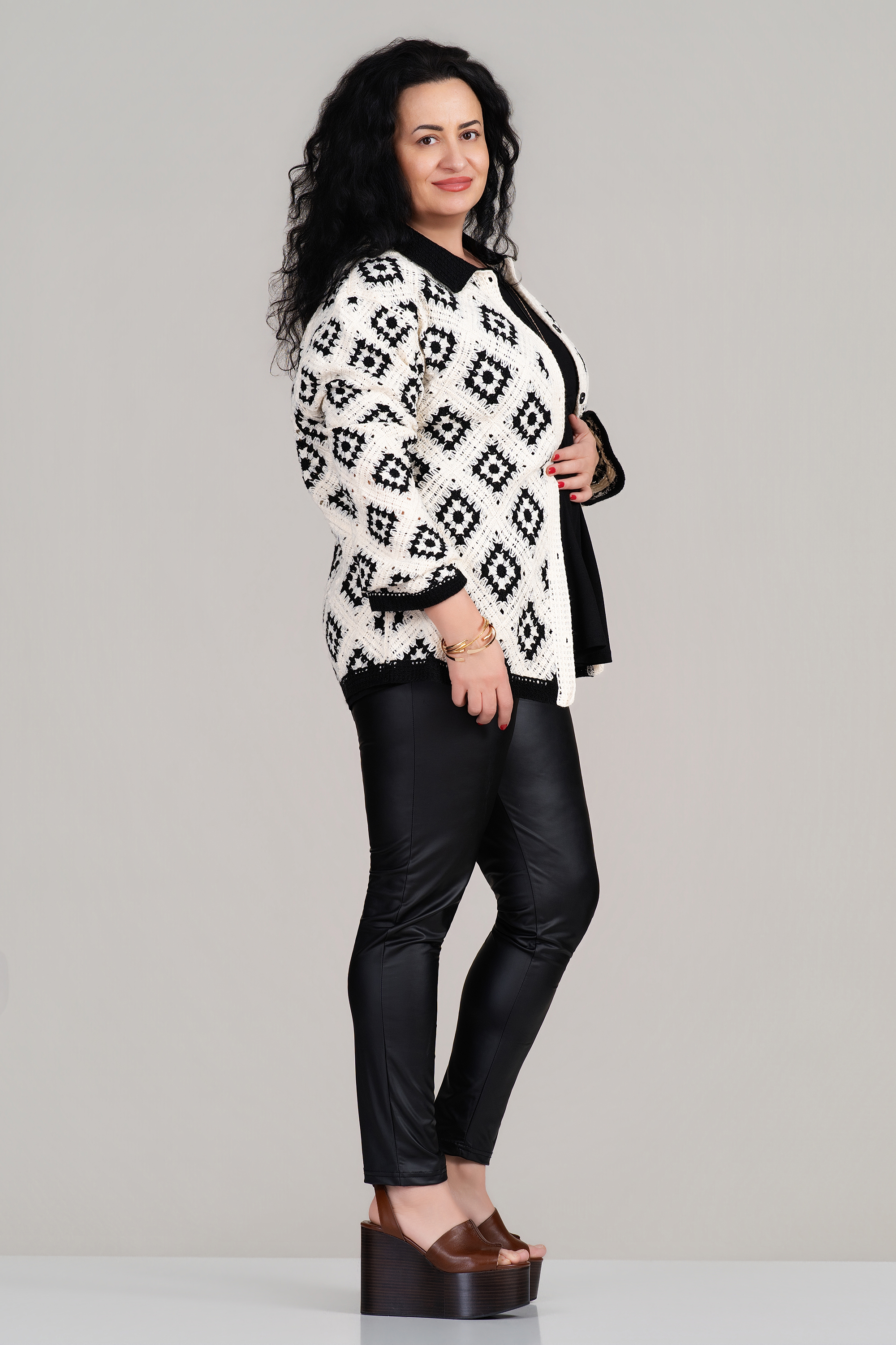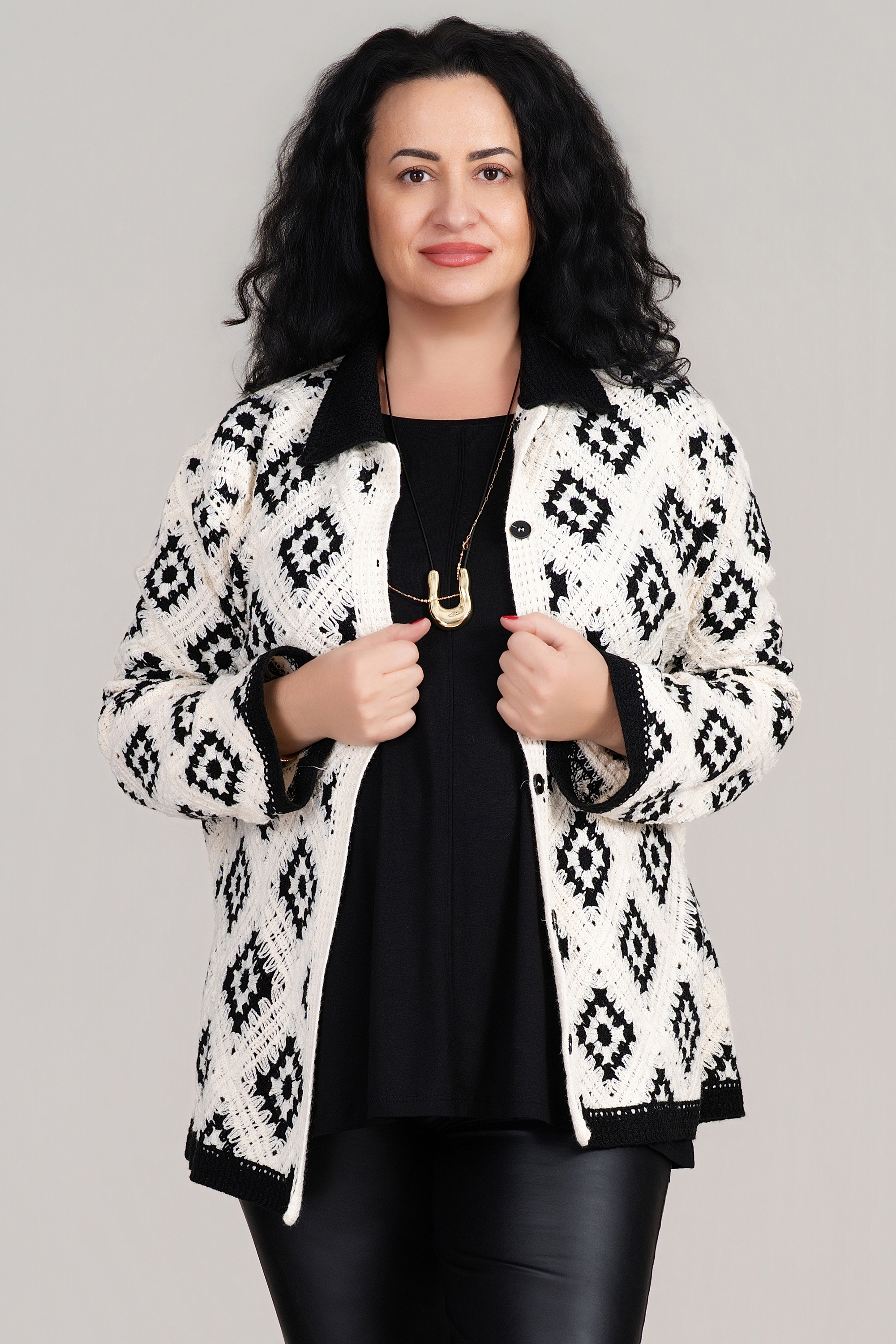 Стилна макси риза с ефектен черен принт върху светла основа, съчетаваща комфорт и модерна визия. Мекото плетиво е приятно на допир и осигурява удобство през целия ден, като същевременно запазва формата си. Свободната кройка позволява лесно наслояване върху топ или рокля и създава усещане за лекота и увереност. Подходяща е за пролетно-летния сезон и за дами, които търсят баланс между практичност и стил.