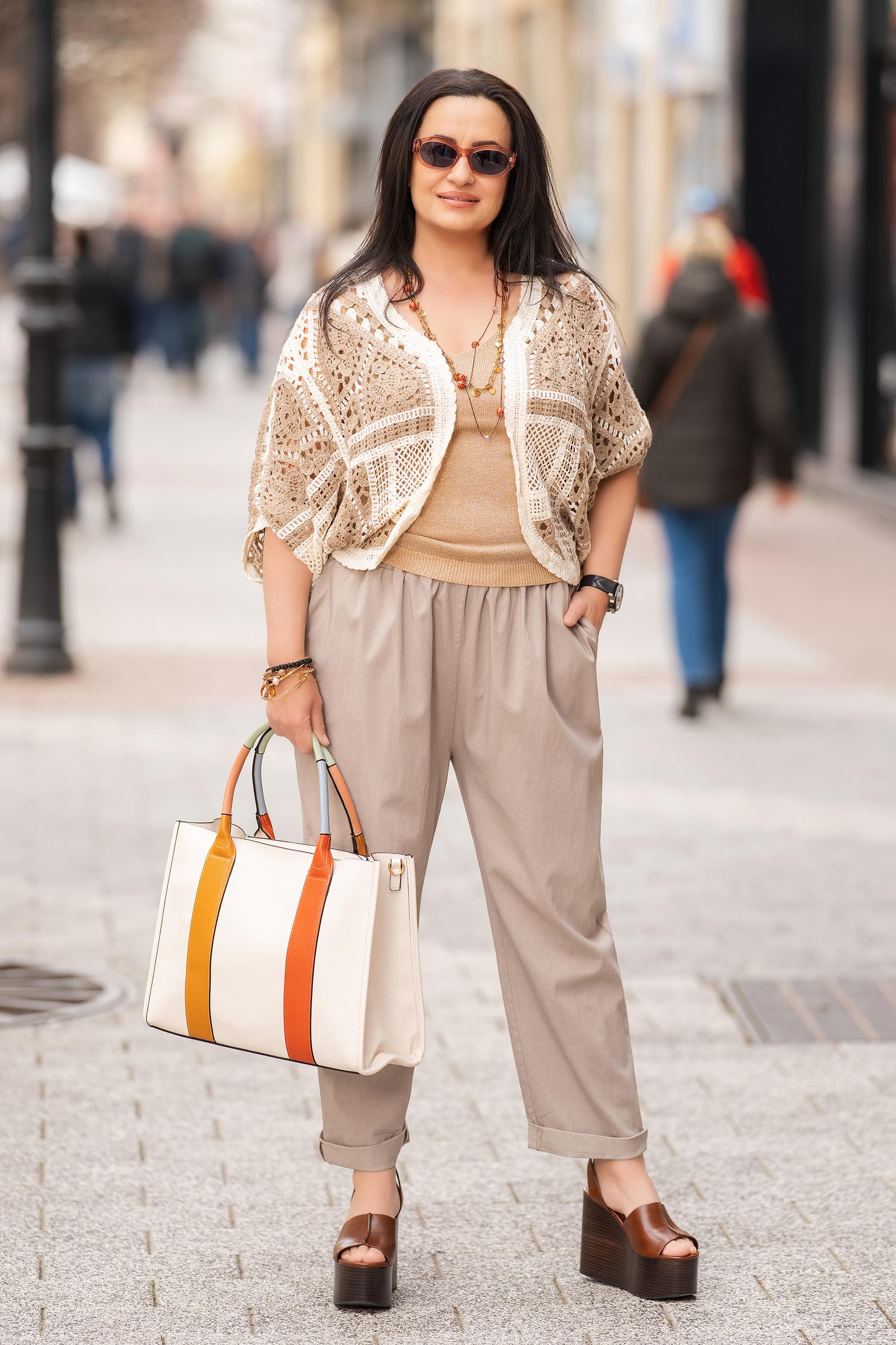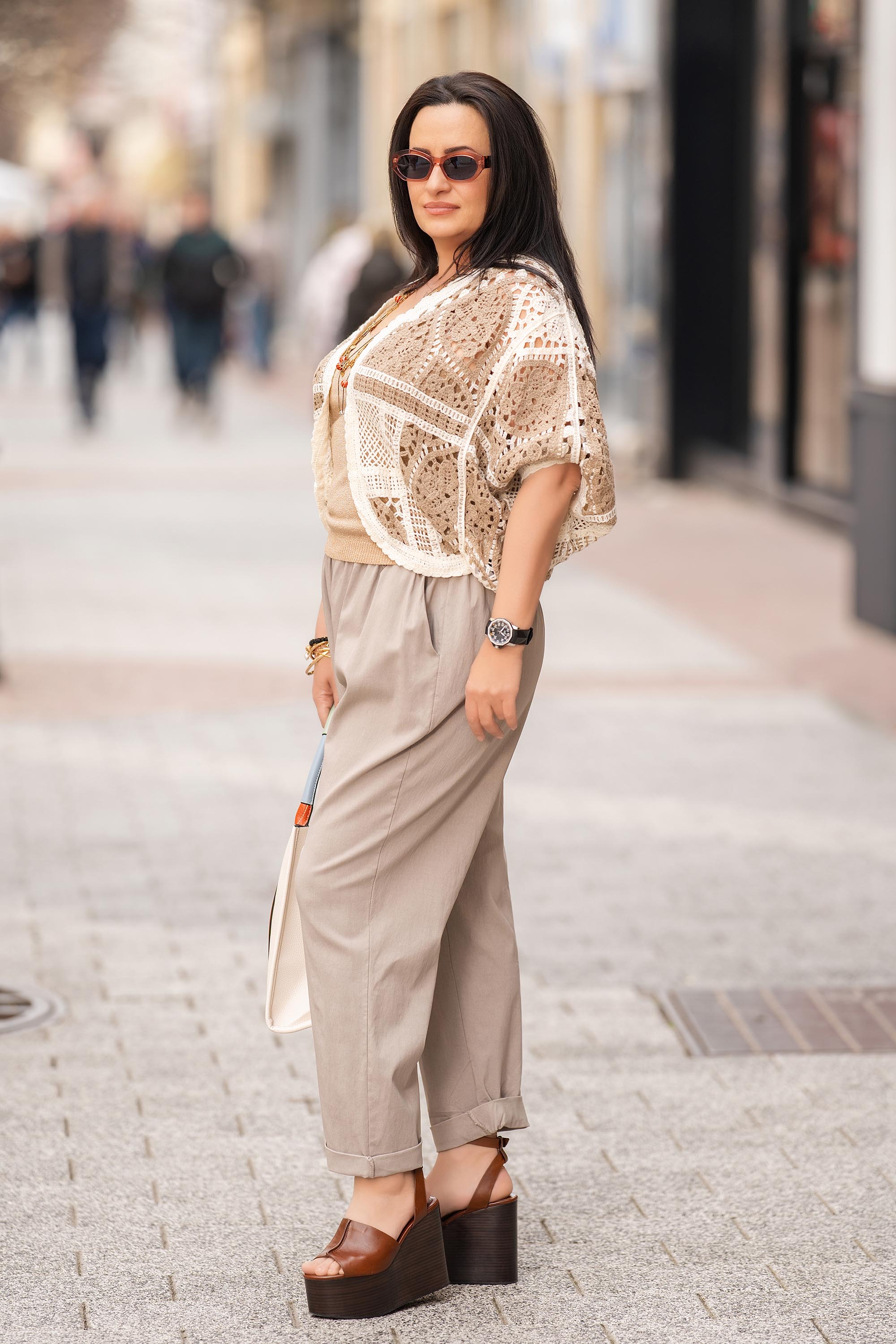 Елегантна макси жилетка с модерна двуцветна визия, съчетаваща кафяво и бежово в плетка тип една кука. Материята е мека и приятна на допир, осигурява комфорт през преходните сезони. Моделът е без закопчаване, което позволява лесно наслояване и свобода на движение. Прилепналите ръкави подчертават силуета и придават завършен вид на визията. Подходяща е както за ежедневието, така и за по-елегантни комбинации.