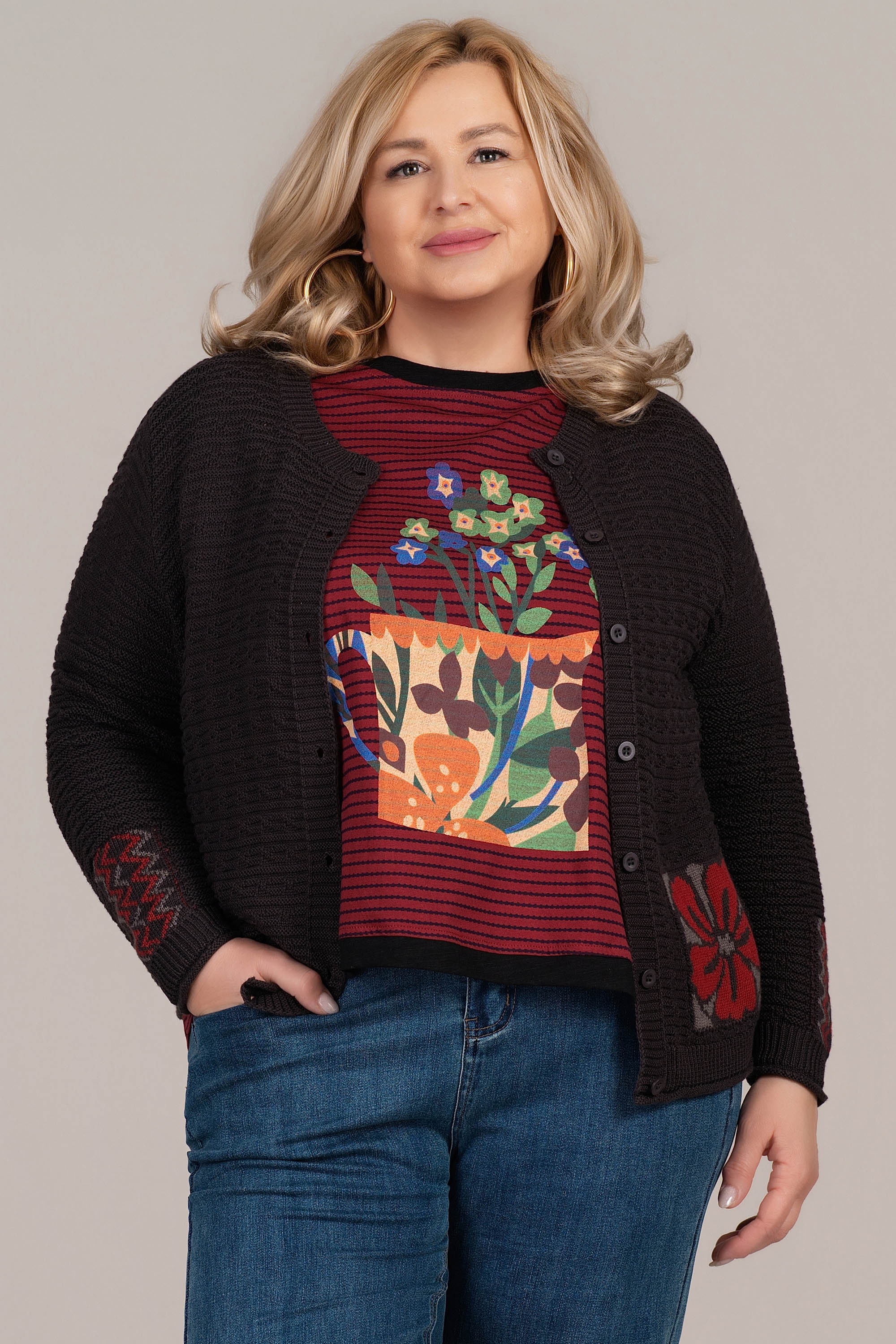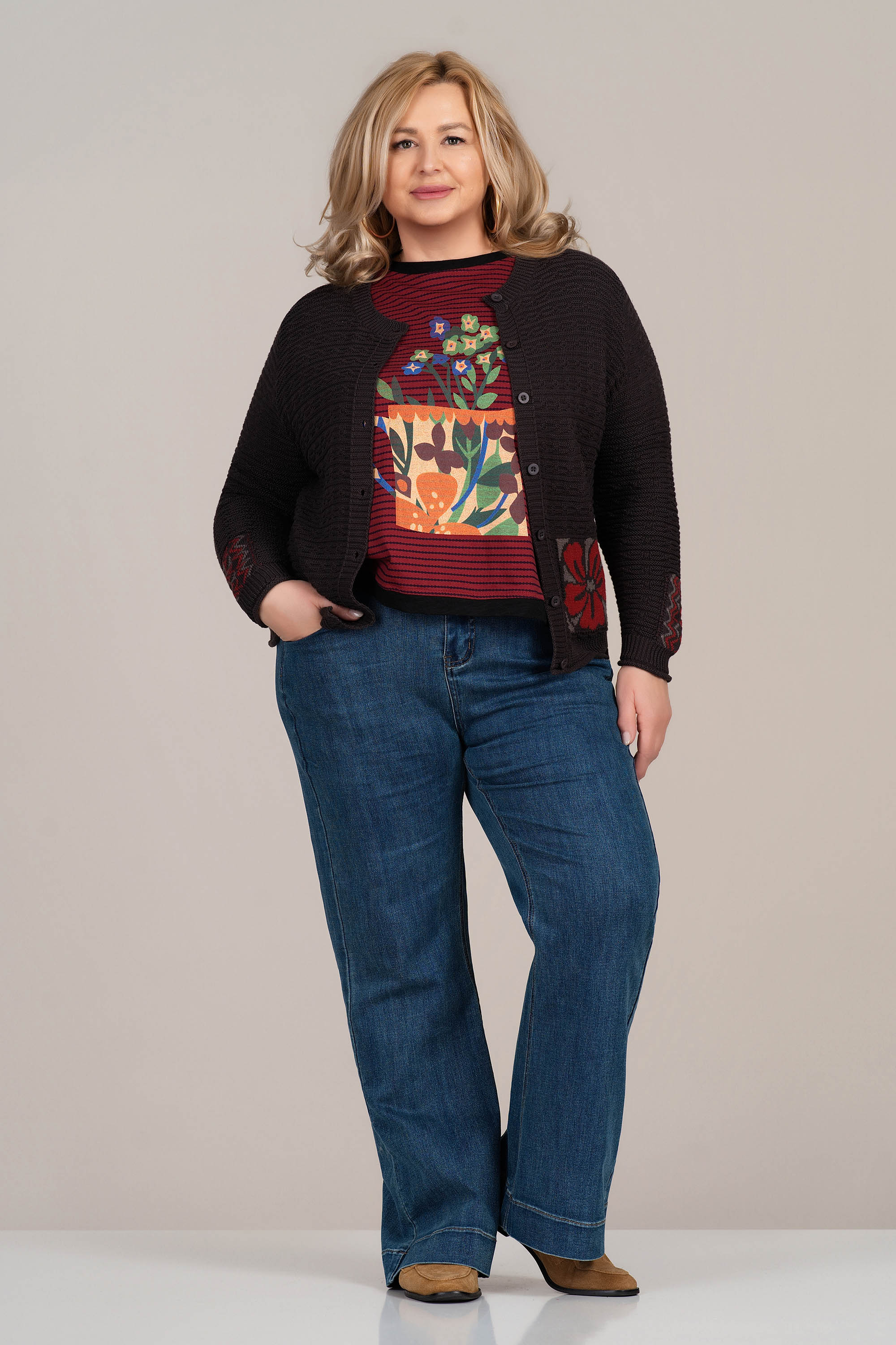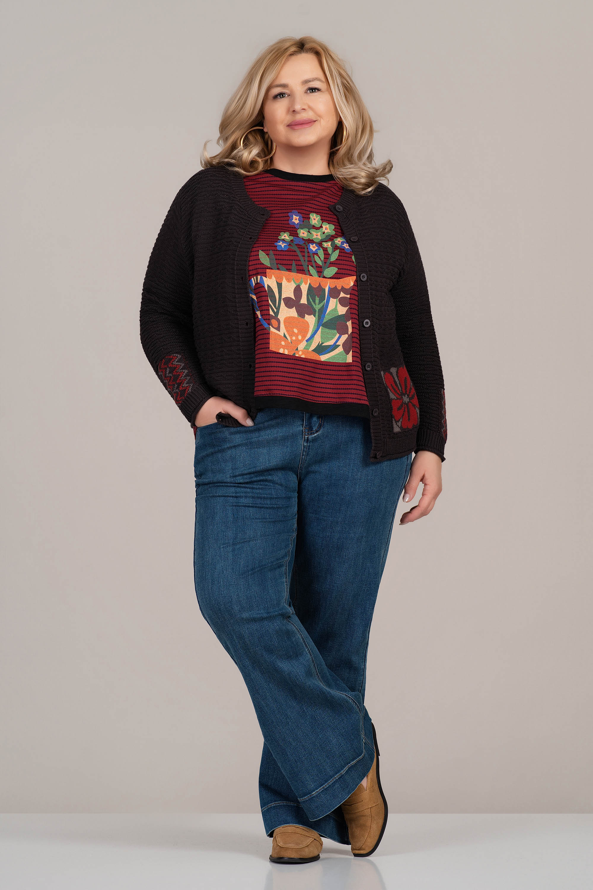 Тази кафява жилетка от фино плетиво се отличава с декоративен принт на джобовете и ръкавите – флорални и геометрични елементи в червено и сиво. Плетката е релефна и еластична, осигуряваща комфорт при носене. Съчетава се чудесно с едноцветни блузи или ризи, както и с дънки или елегантен панталон. Подходяща за пролет и есен.