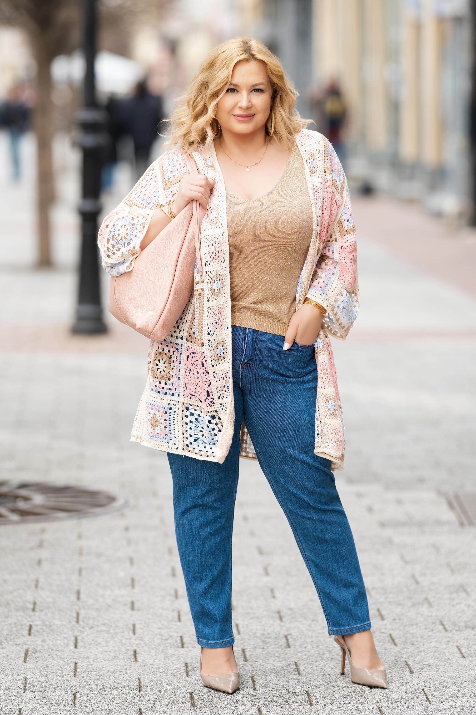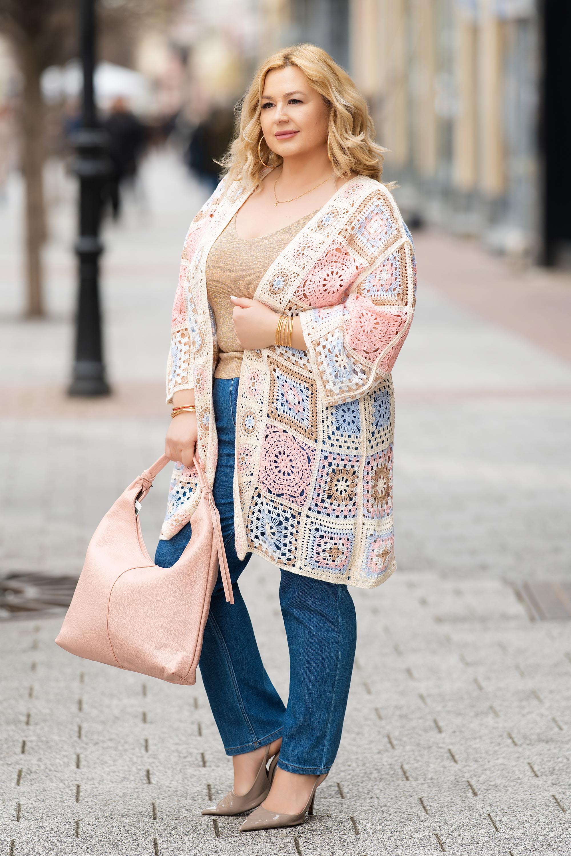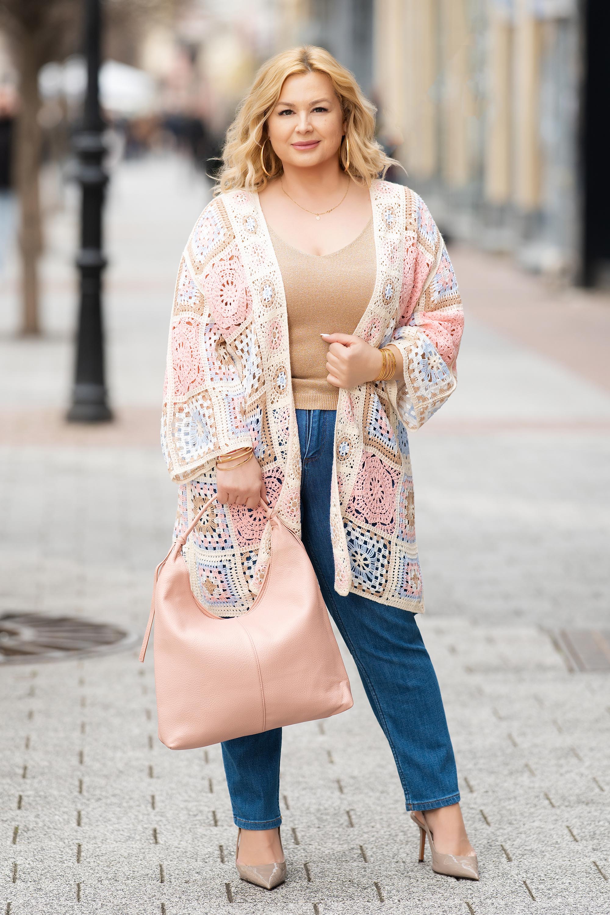 Впечатляваща макси жилетка с издължена линия и артистична плетка тип една кука в розово, допълнена от фини нюанси на синьо, бежово и кафяво. Материята е лека, устойчива и лесна за поддръжка, осигуряваща комфорт през целия ден. Моделът е без закопчаване, което я прави идеална за наслояване и създаване на разнообразни визии. Дългият силует издължава фигурата и придава елегантност. Подходящ избор за ежедневие и стилни градски комбинации.
