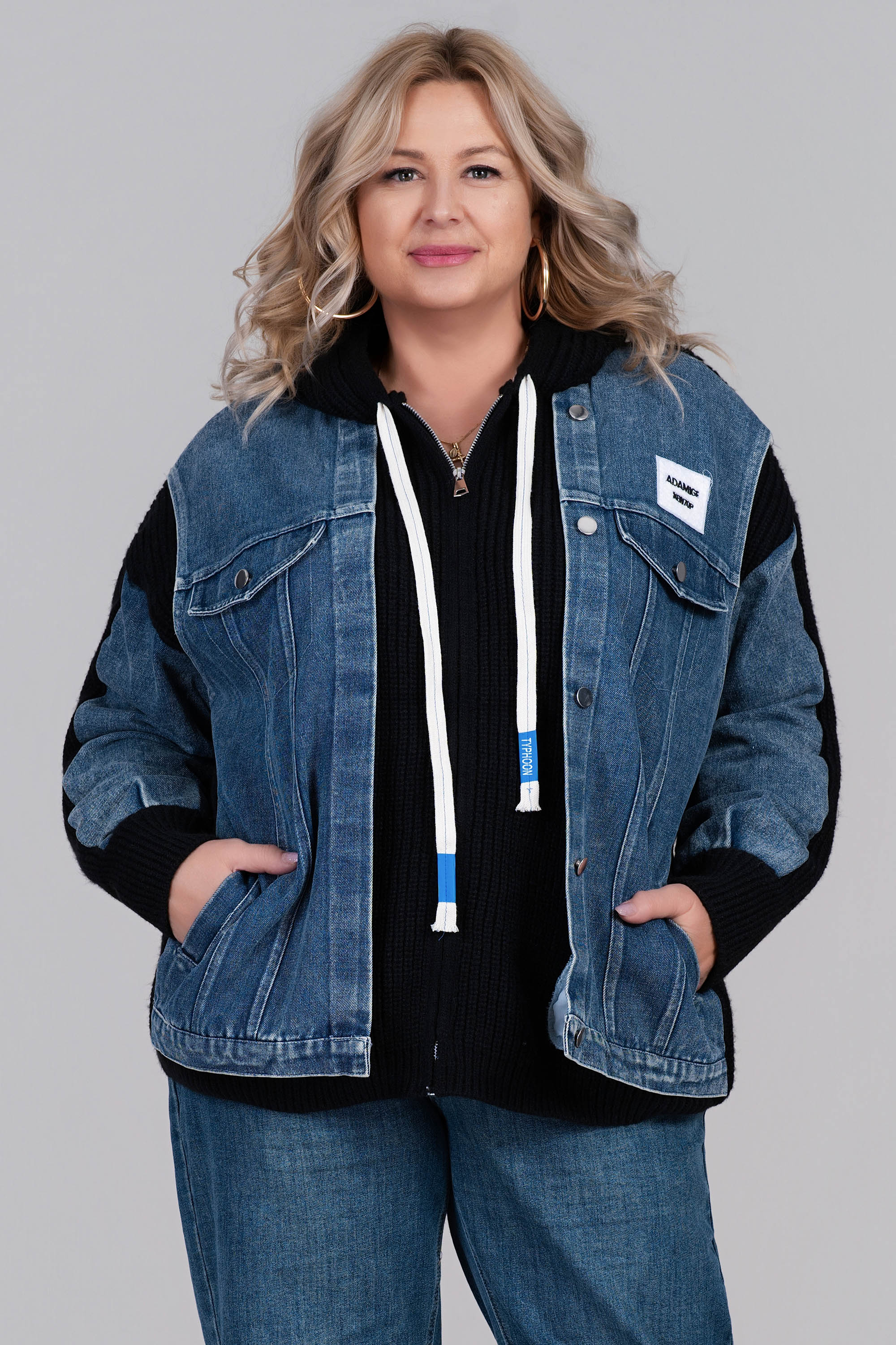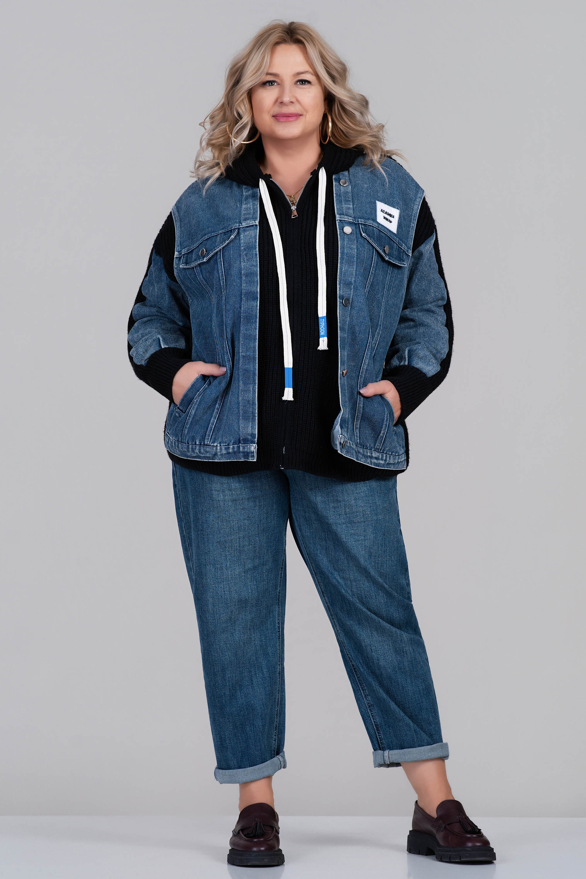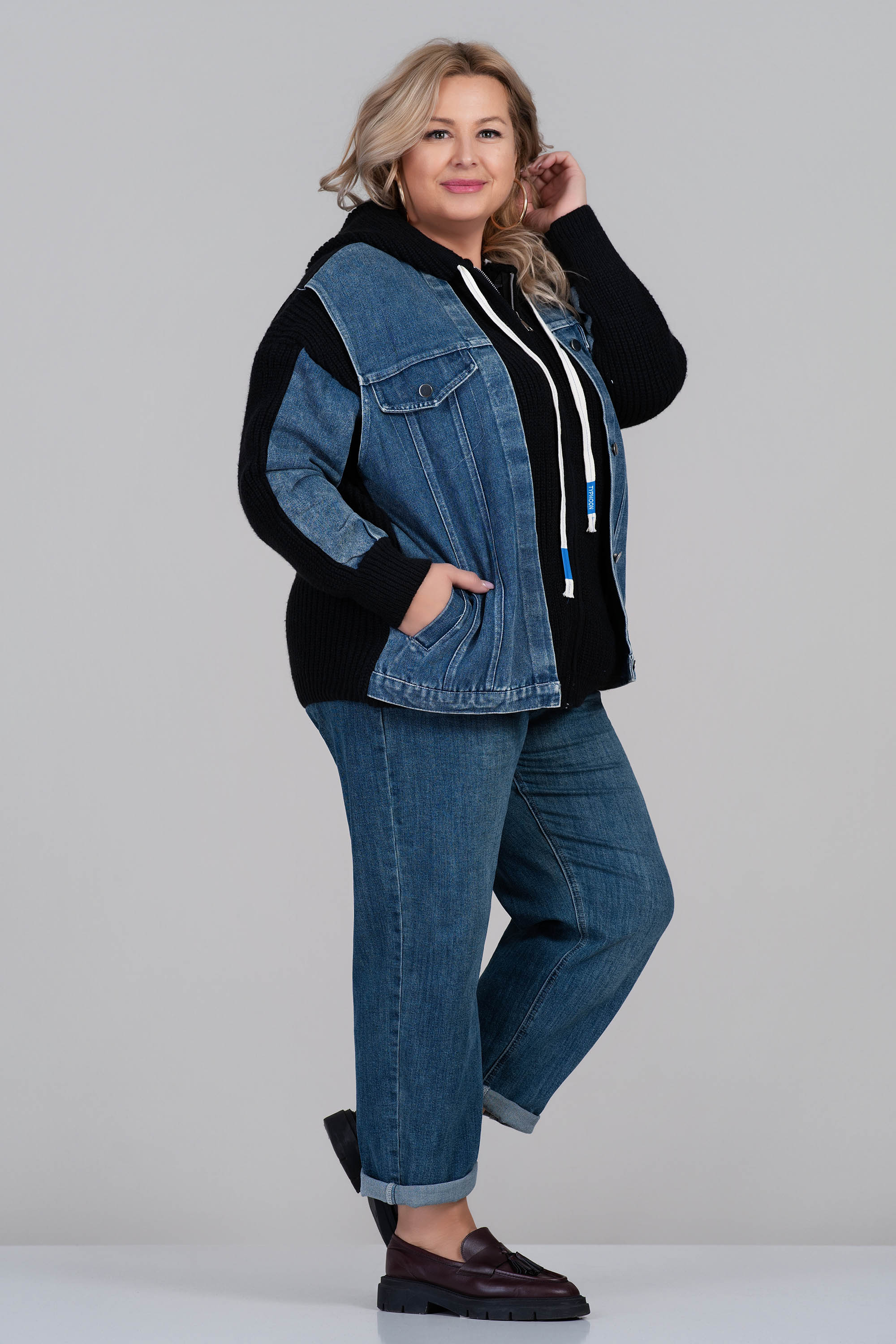 Стилна и топла плетена жилетка в черно с контрастни дънкови детайли по яката и предната част. Моделът е с комфортна свободна кройка, копчета и два джоба. Перфектна за есенно-зимния сезон – комбинира усещането за уют с модерна визия.