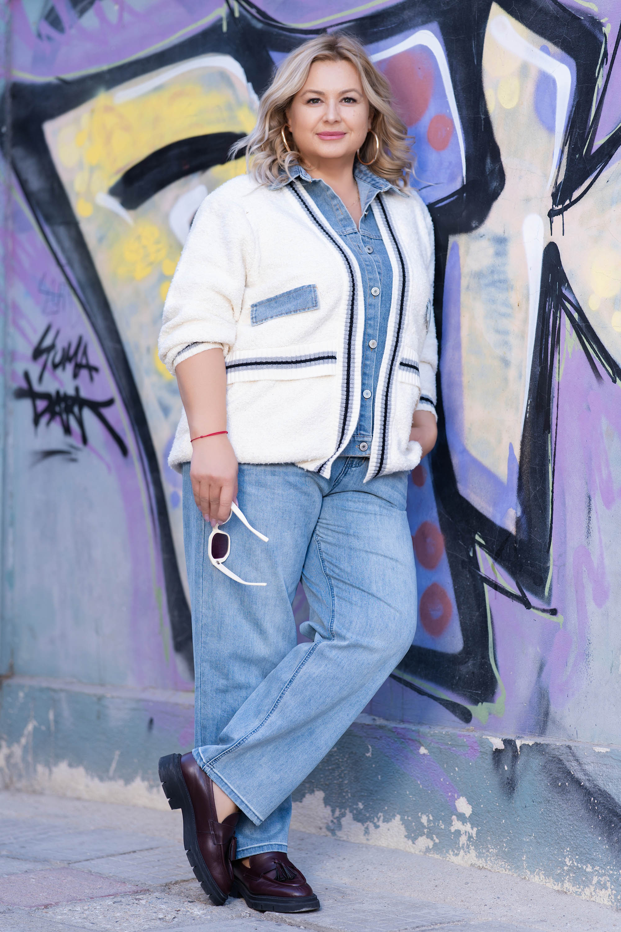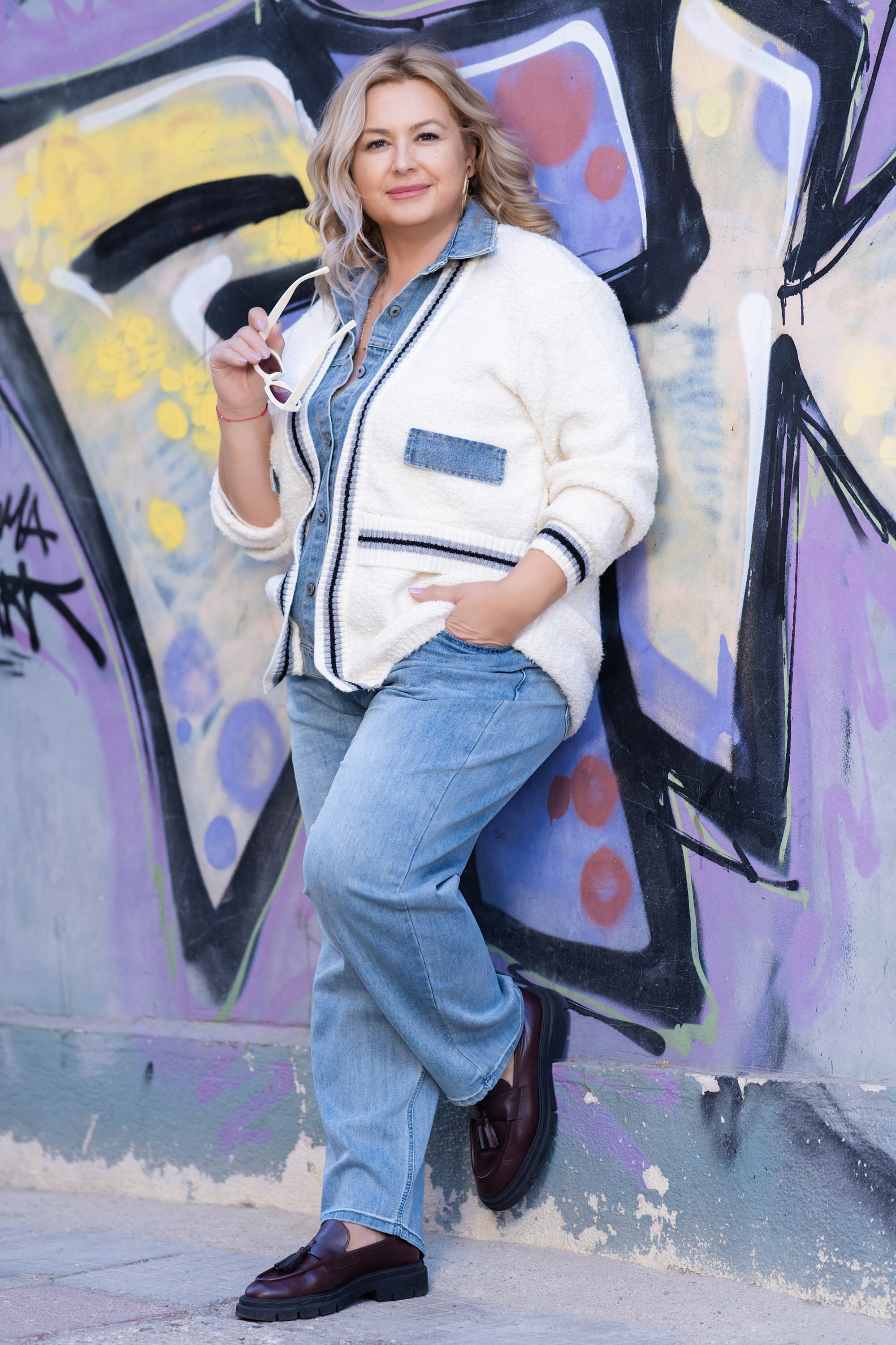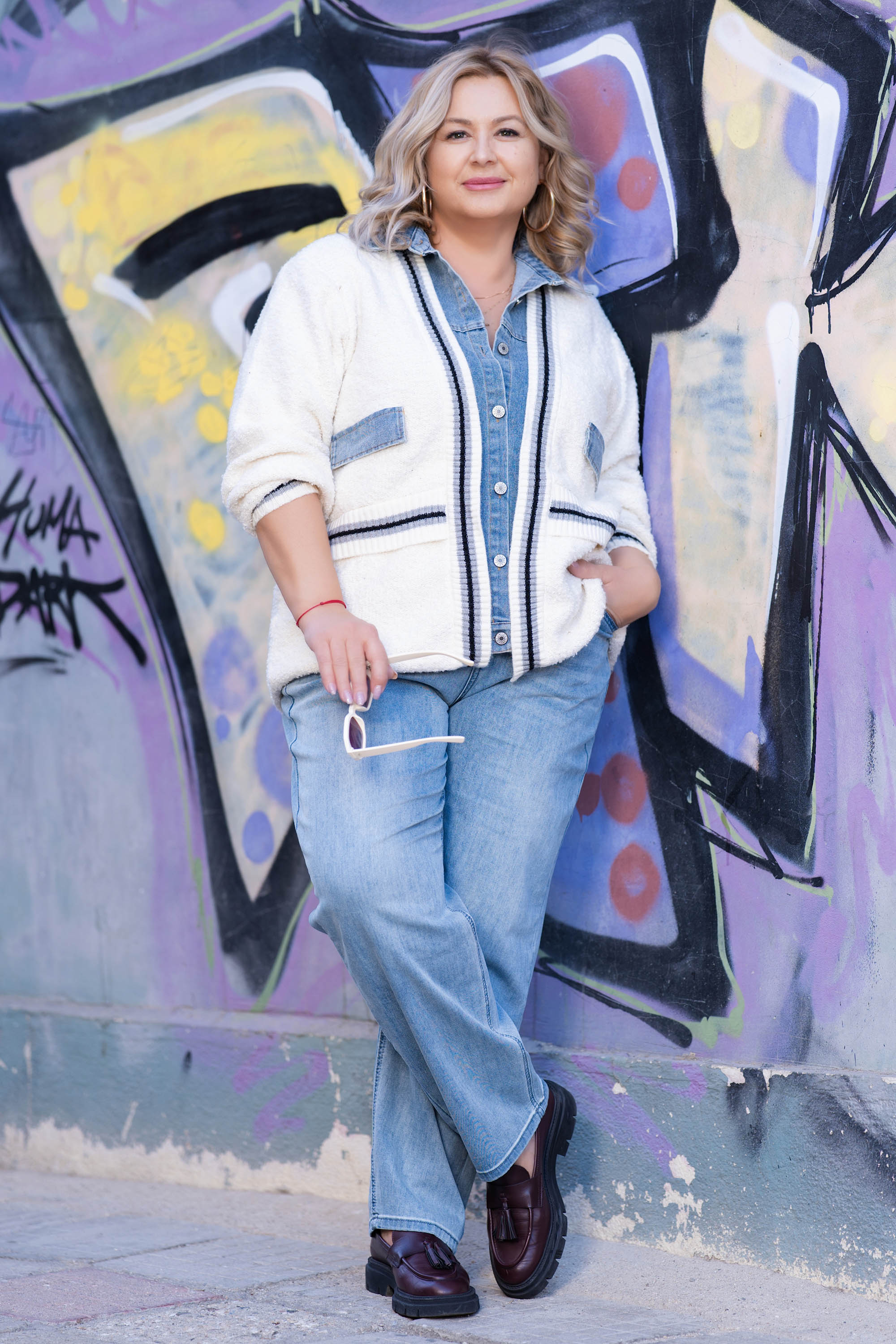 Стилна и топла плетена жилетка в бяло с контрастни дънкови детайли по яката и предната част. Моделът е с комфортна свободна кройка, копчета и два джоба. Перфектна за есенно-зимния сезон – комбинира усещането за уют с модерна визия.