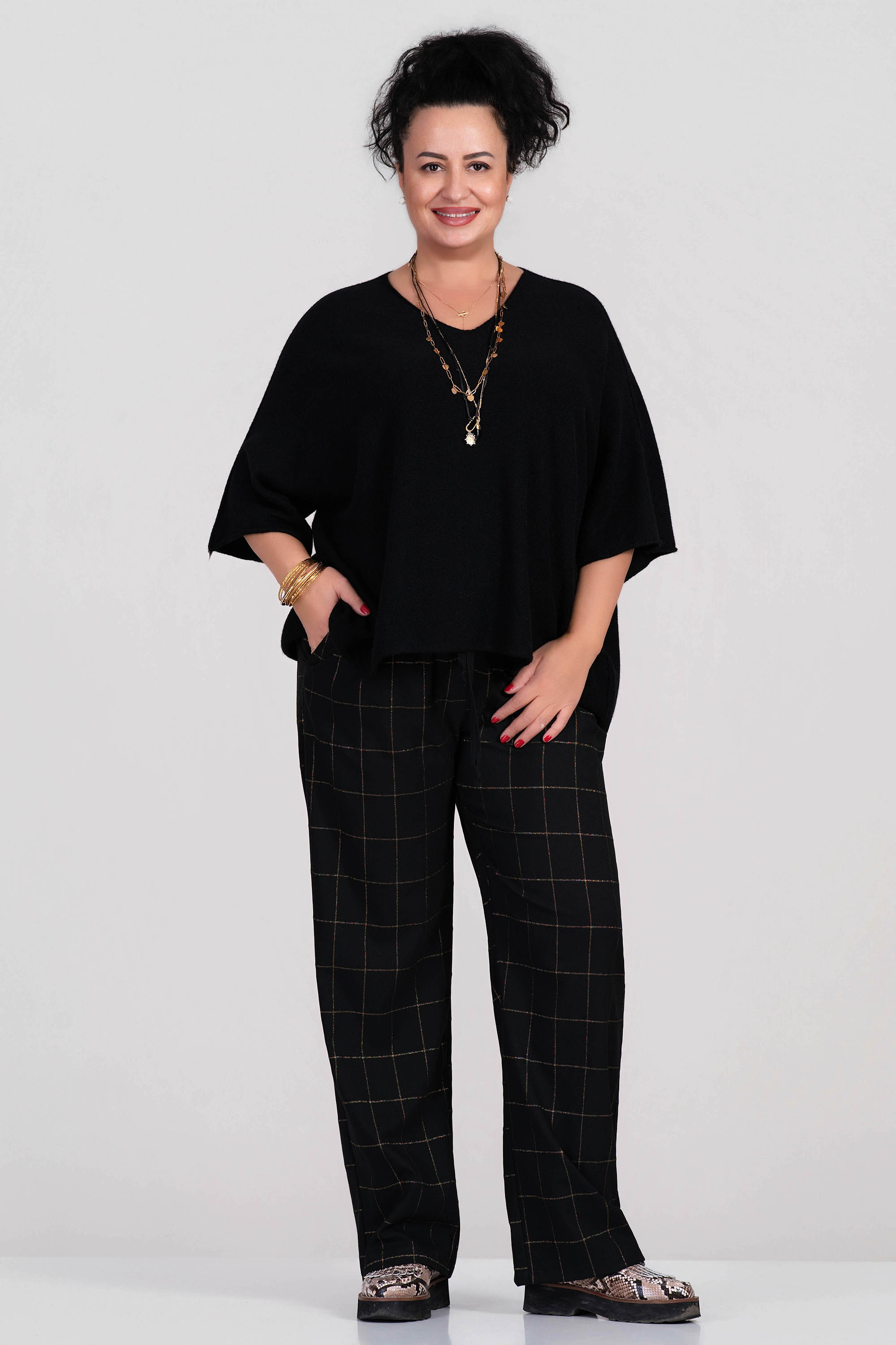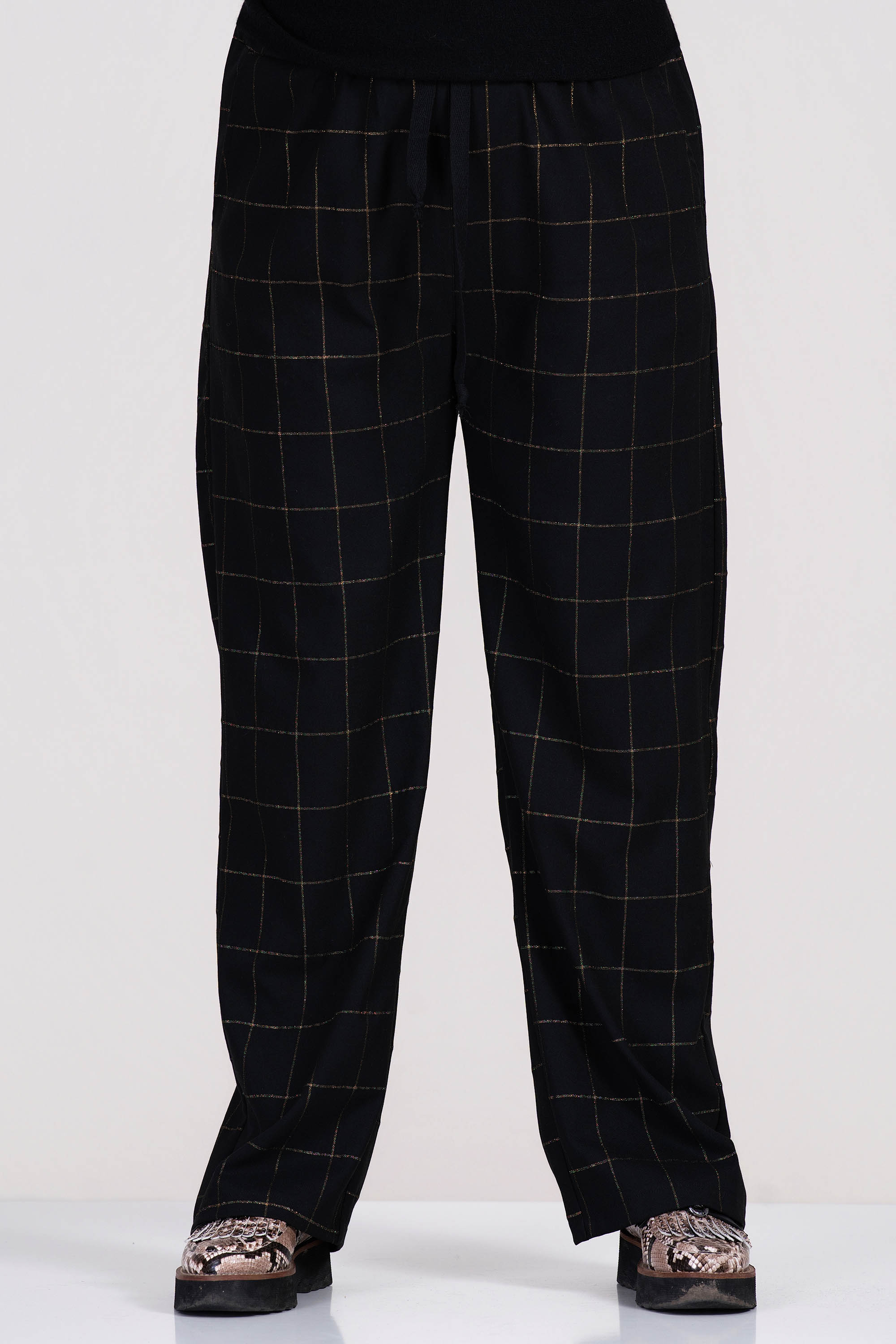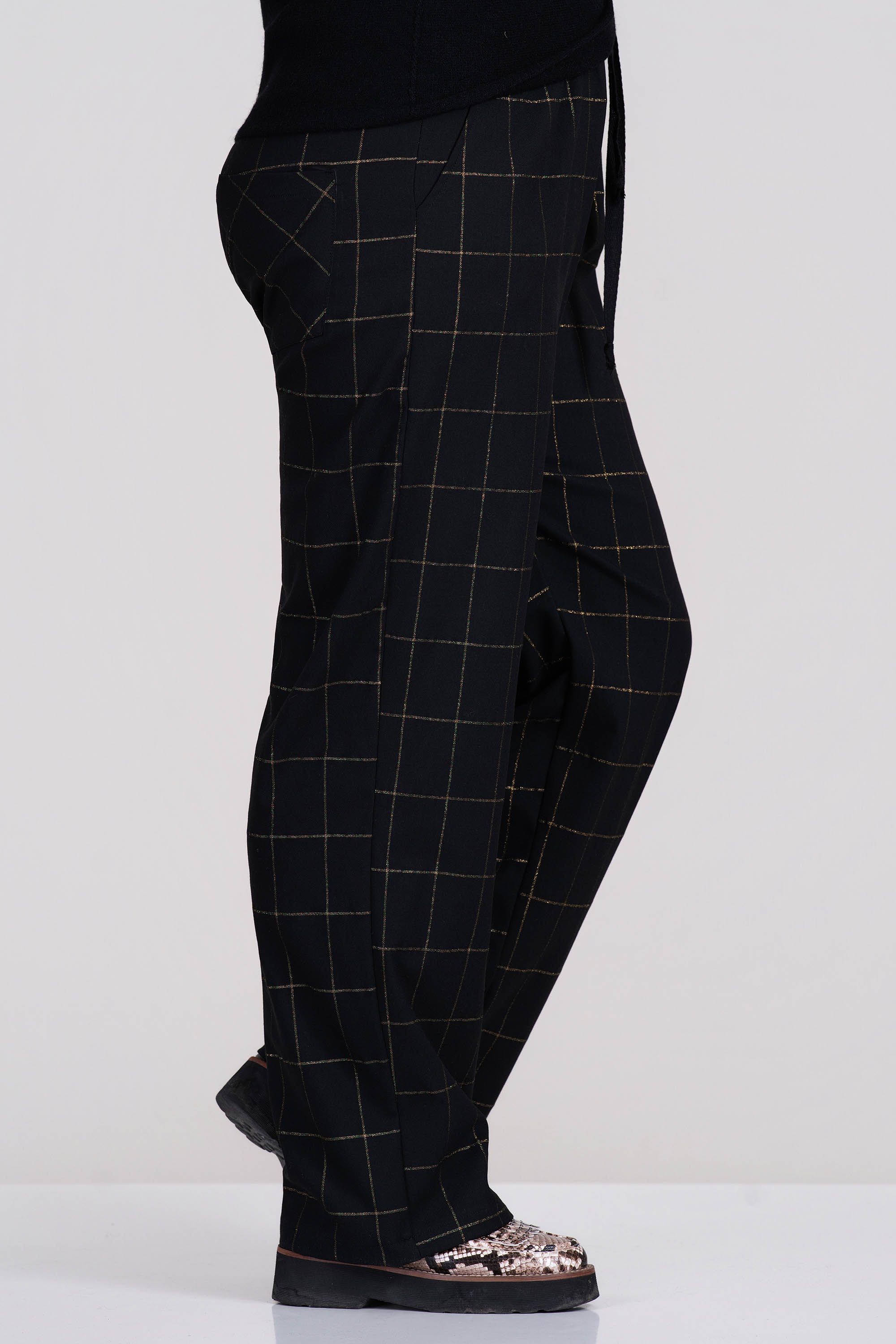 Удобен макси панталон в черен цвят със златисто каре, който придава издължен силует. Моделът е с еластичен колан и свободна кройка, осигуряваща комфорт през целия ден. Материята е плътна, но еластична, подходяща за ежедневна или офис визия.