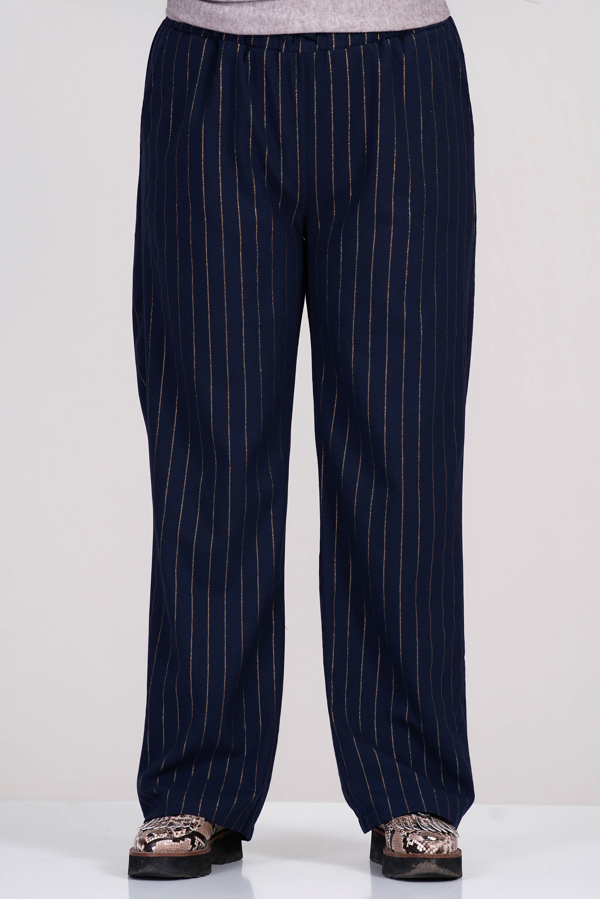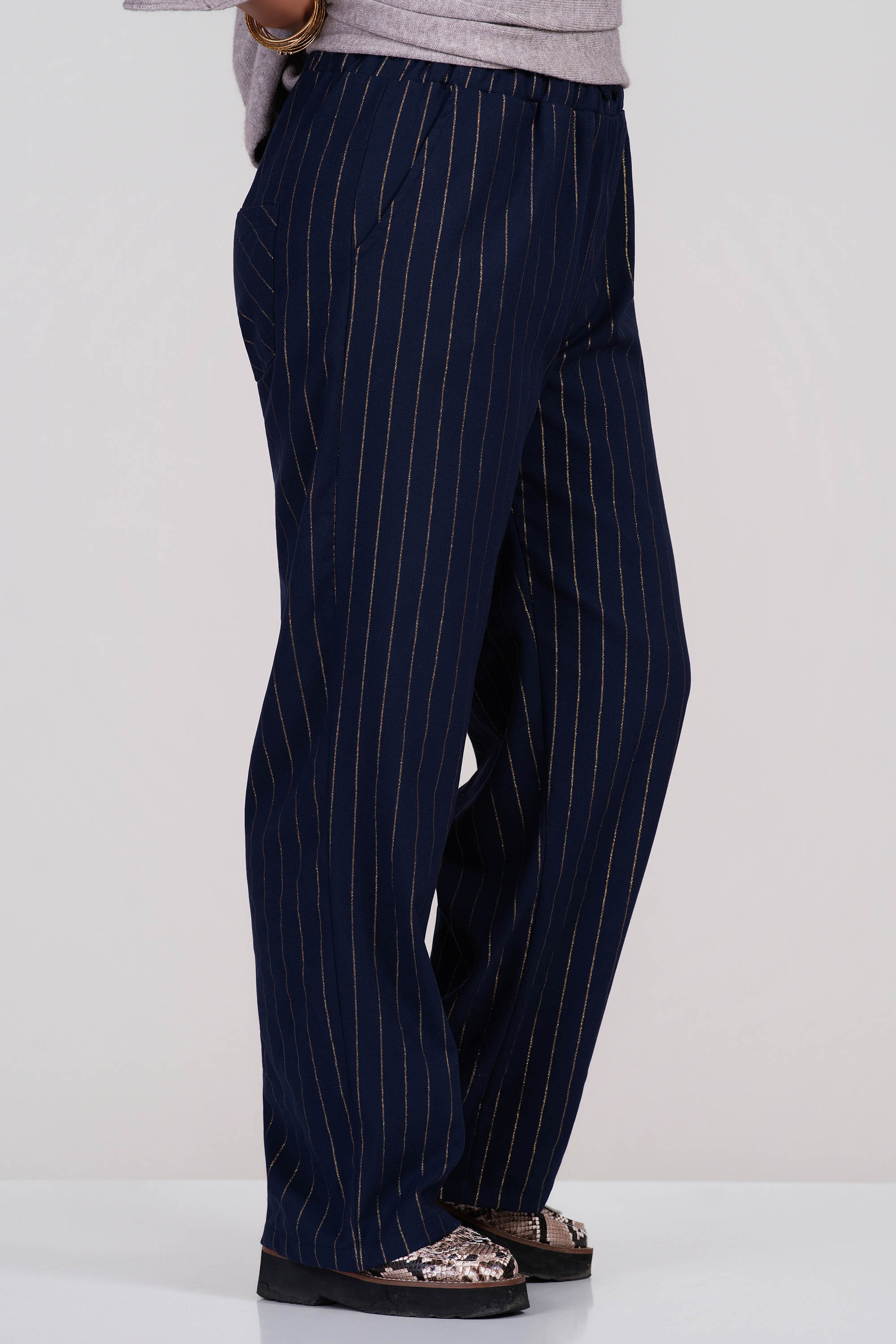 МАКСИ прав панталон в тъмносиньо с принт в златисто райе