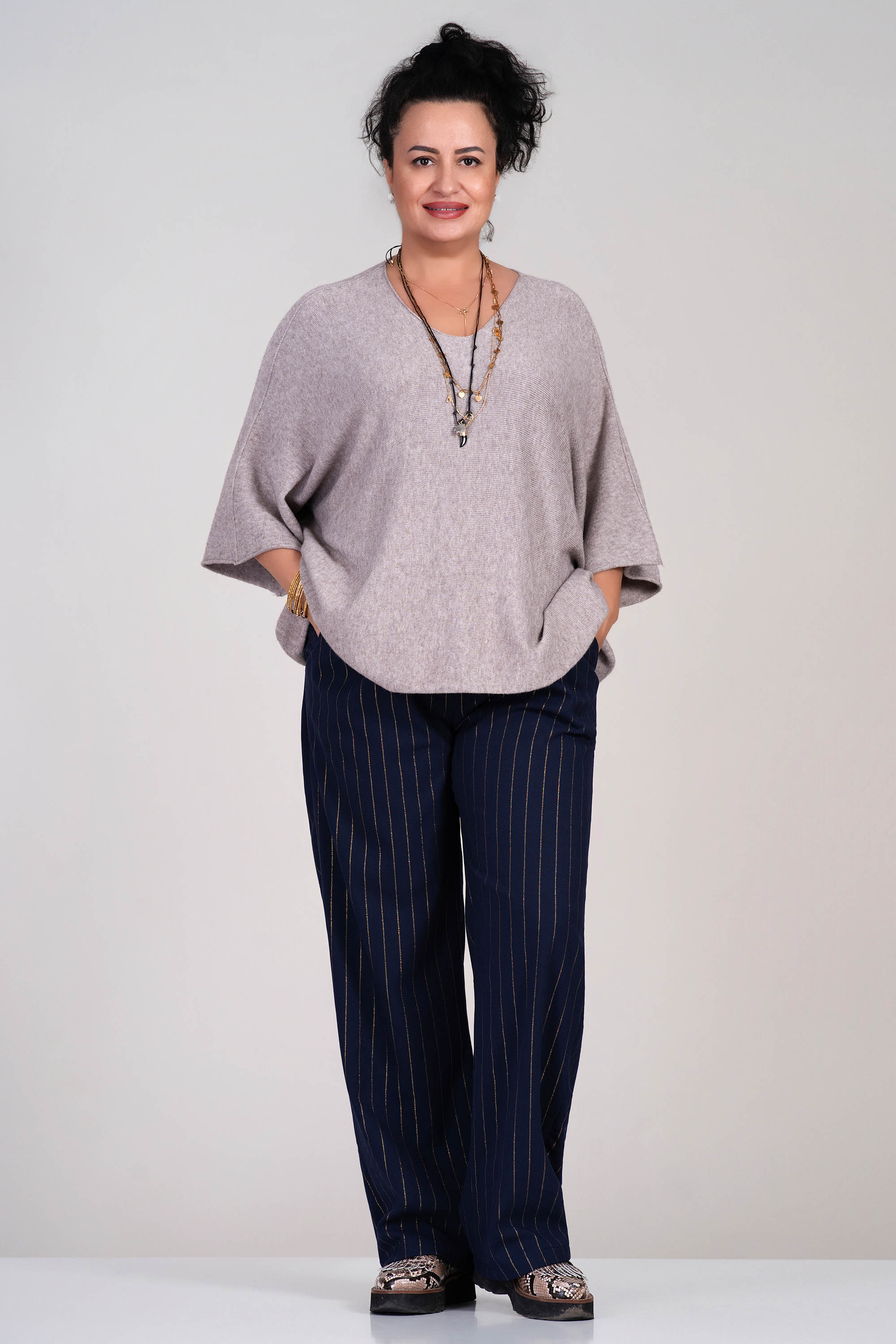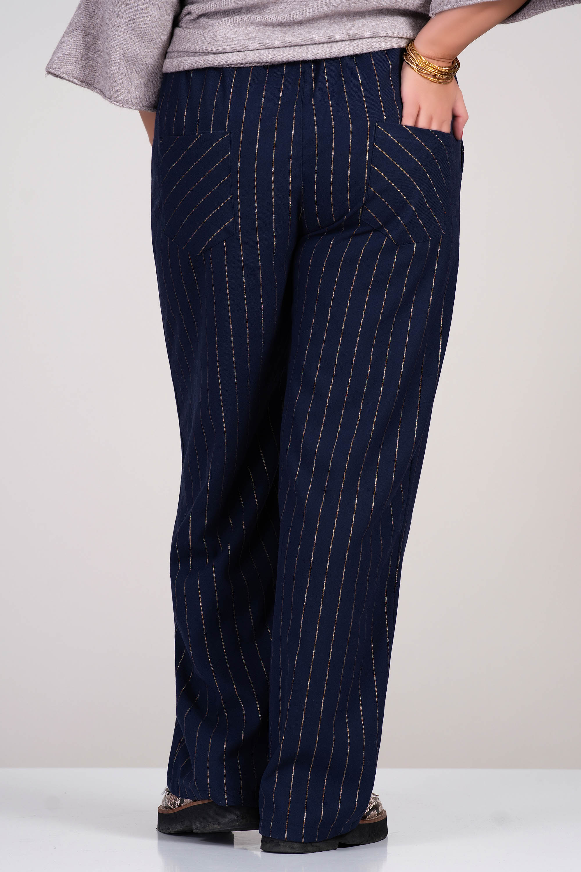 Удобен макси панталон в тъмносив цвят със златисто райе, който придава издължен силует. Моделът е с еластичен колан и свободна кройка, осигуряваща комфорт през целия ден. Материята е плътна, но еластична, подходяща за ежедневна или офис визия.