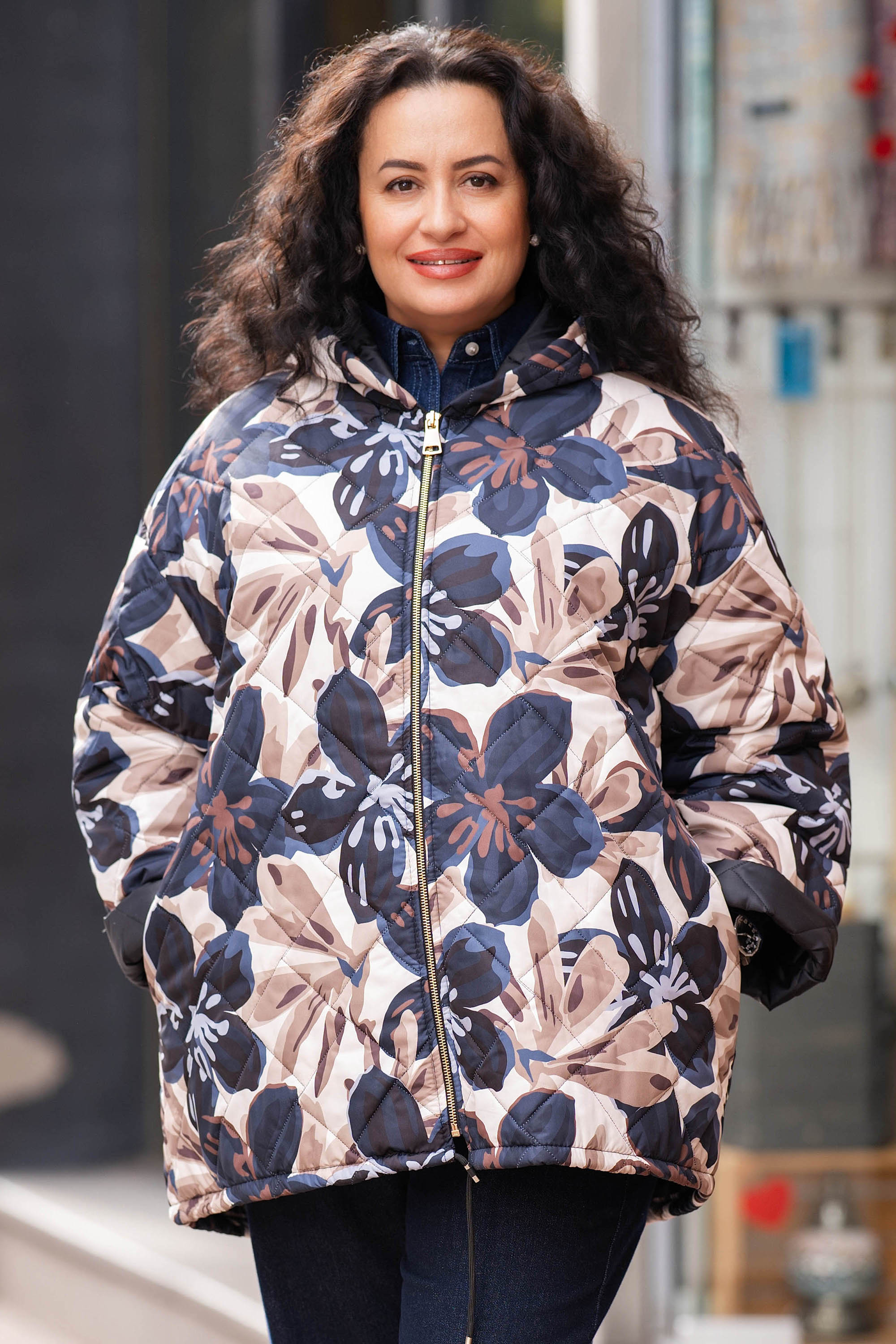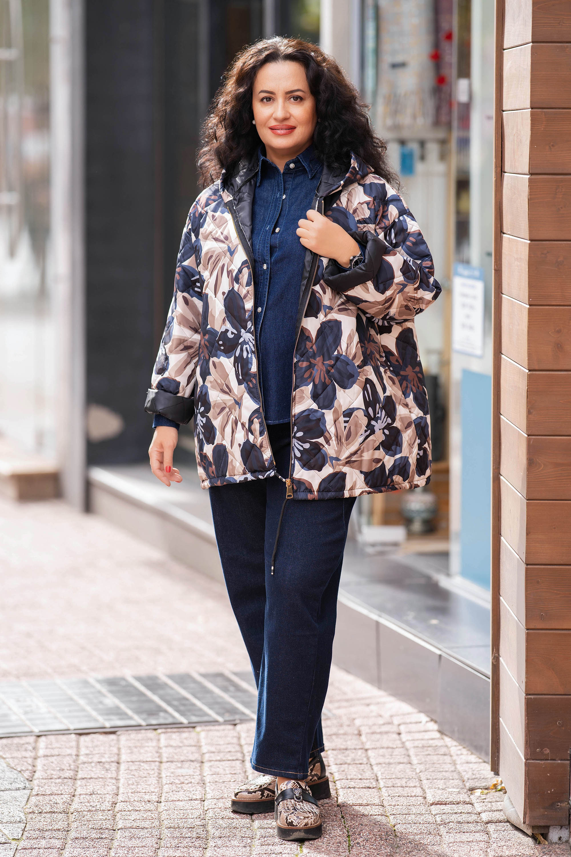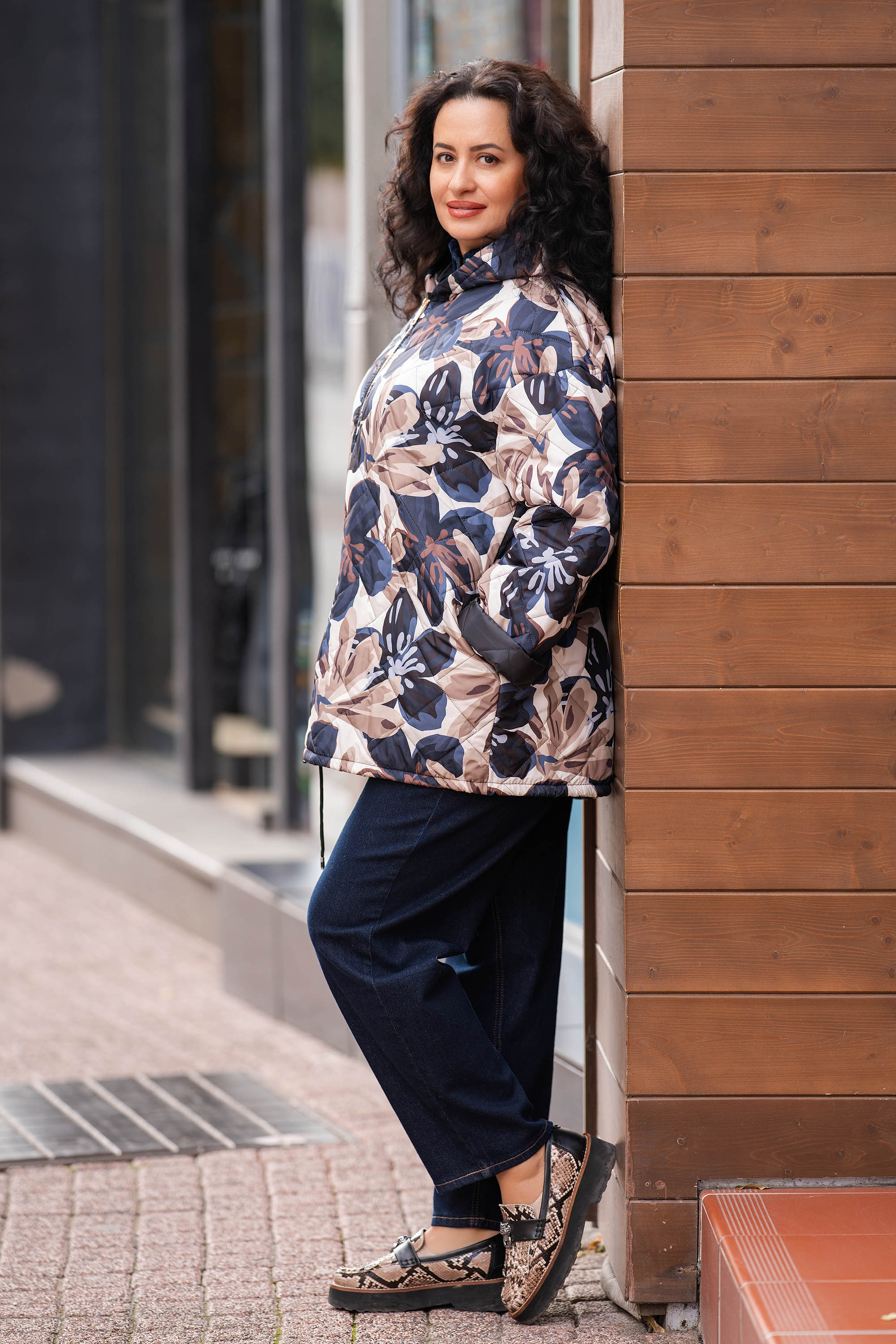 МАКСИ преходно яке с флорален принт в тъмносиво и кафяво