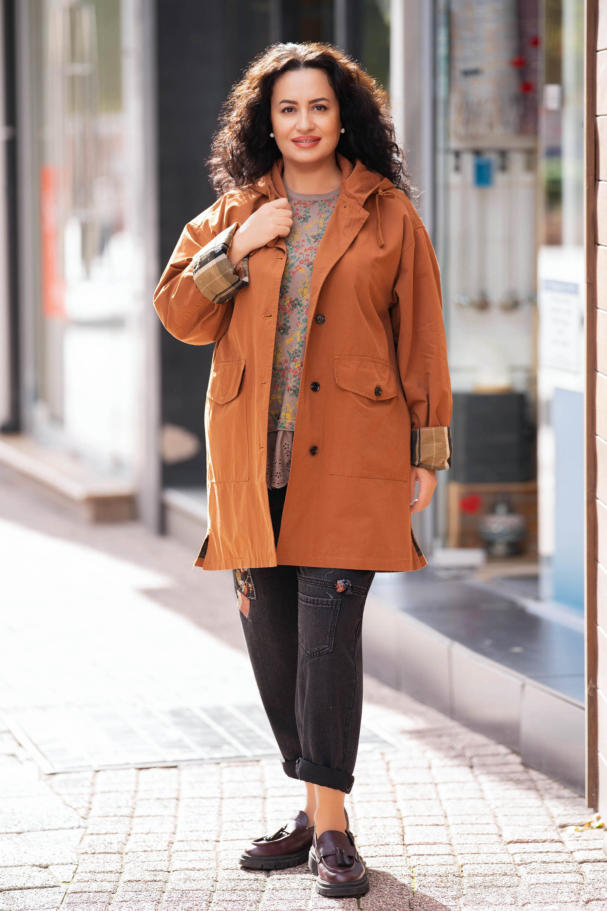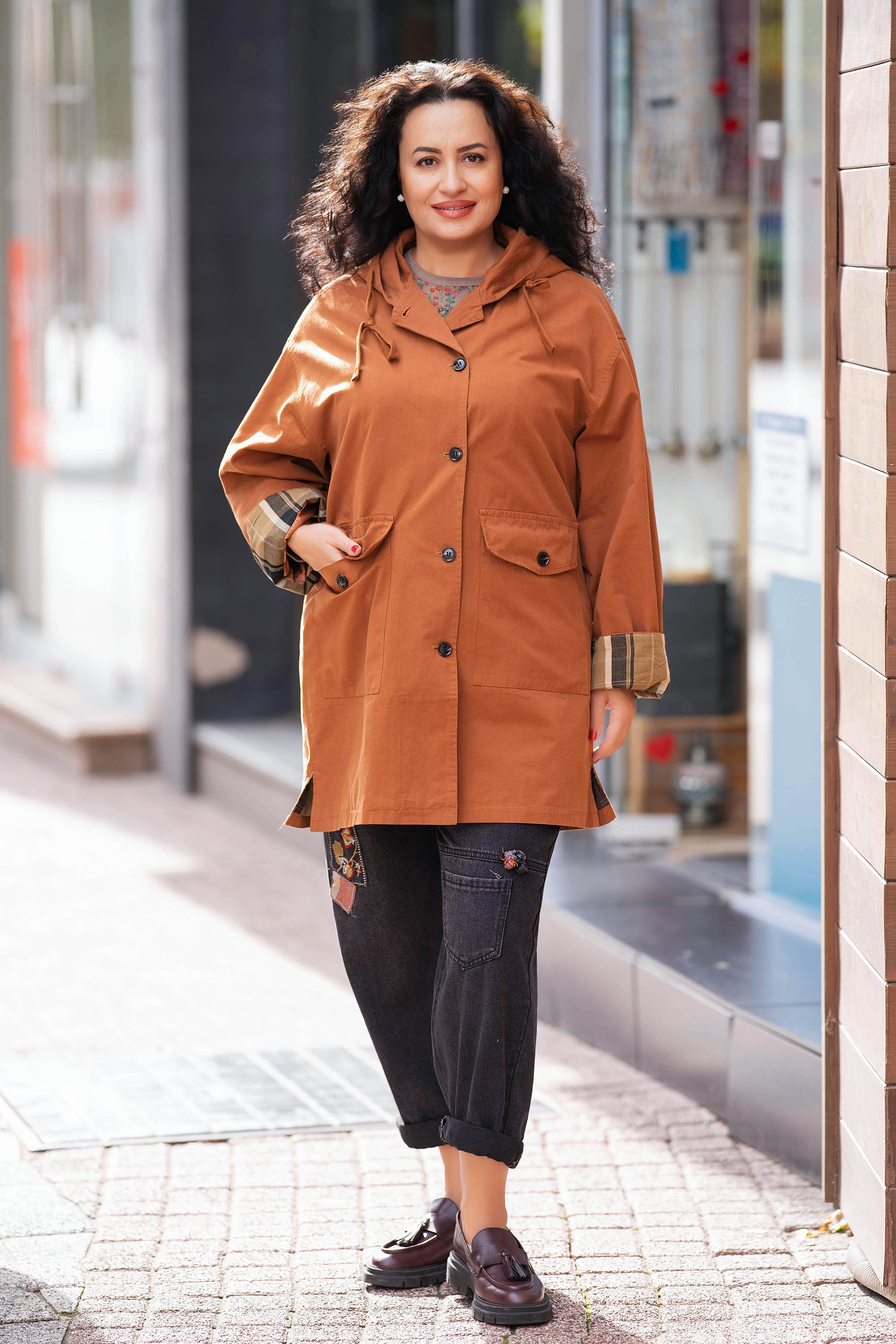 Удобно преходно яке в стилен карамелен цвят, изработено от лек полиестер. Снабдено с качулка, цип, копчета и два предни джоба с капак. Вътрешната каре подплата в зелено придава топъл акцент, а страничните шлицове осигуряват свобода на движение. Идеално за ежедневна употреба в есенно-зимния сезон.