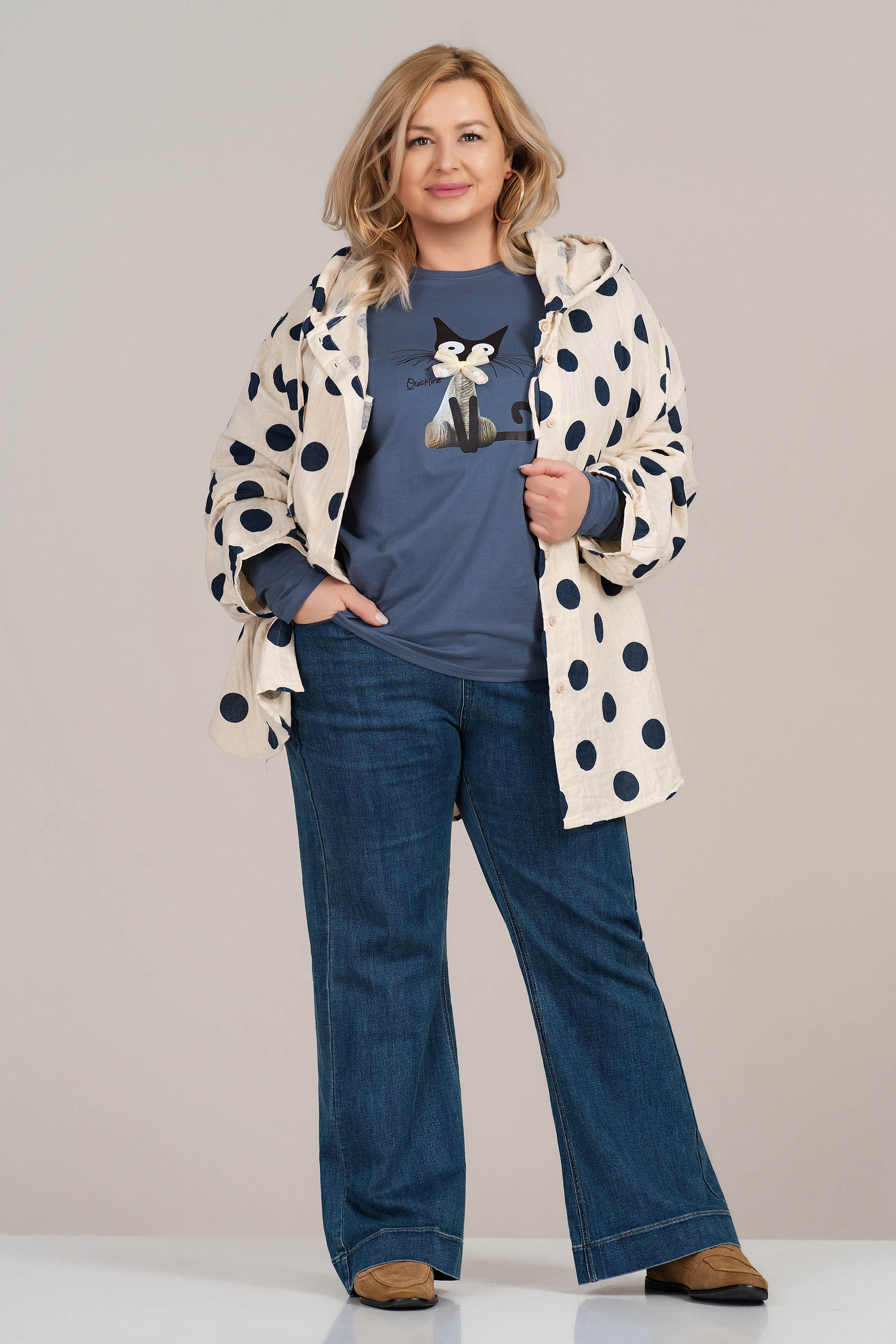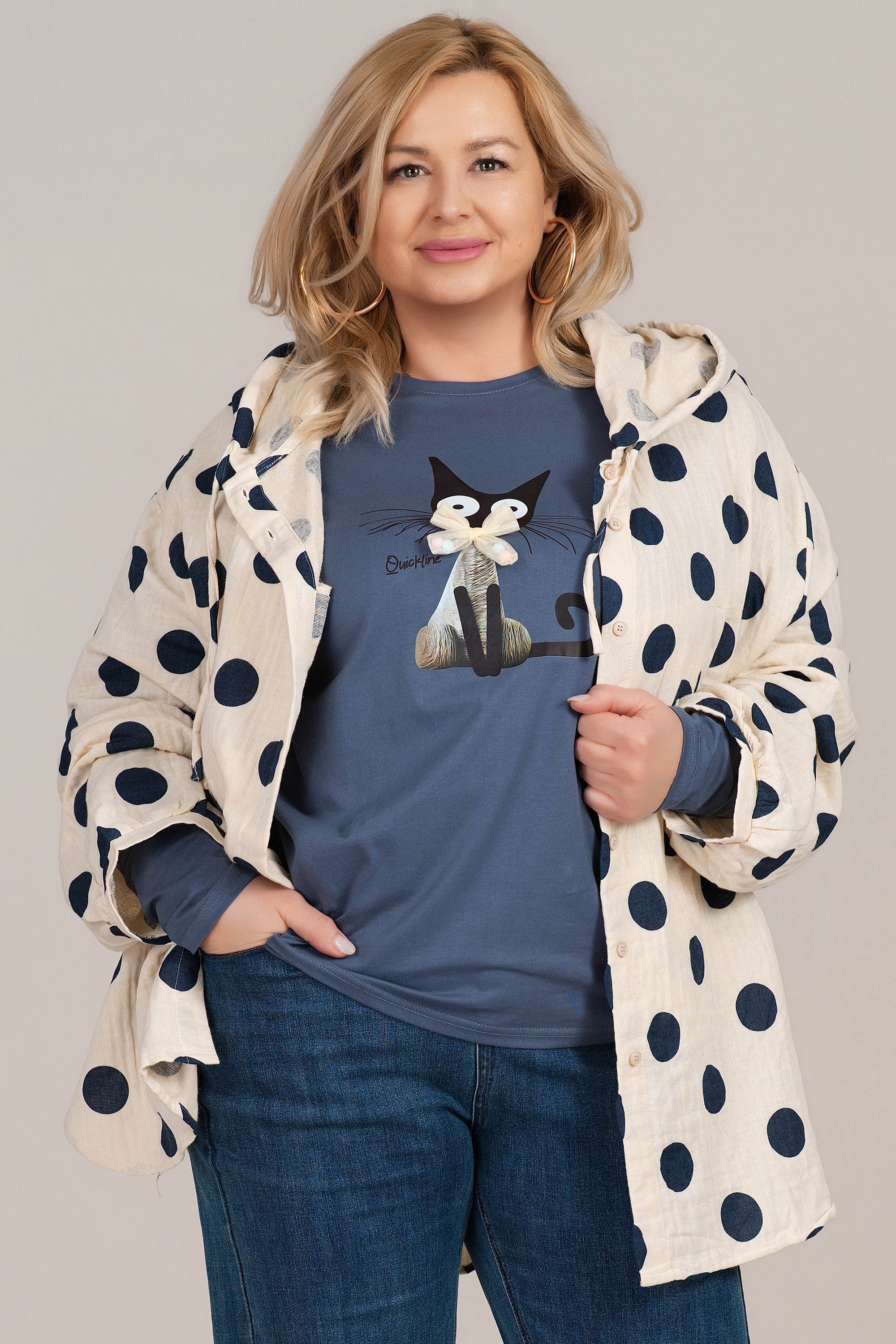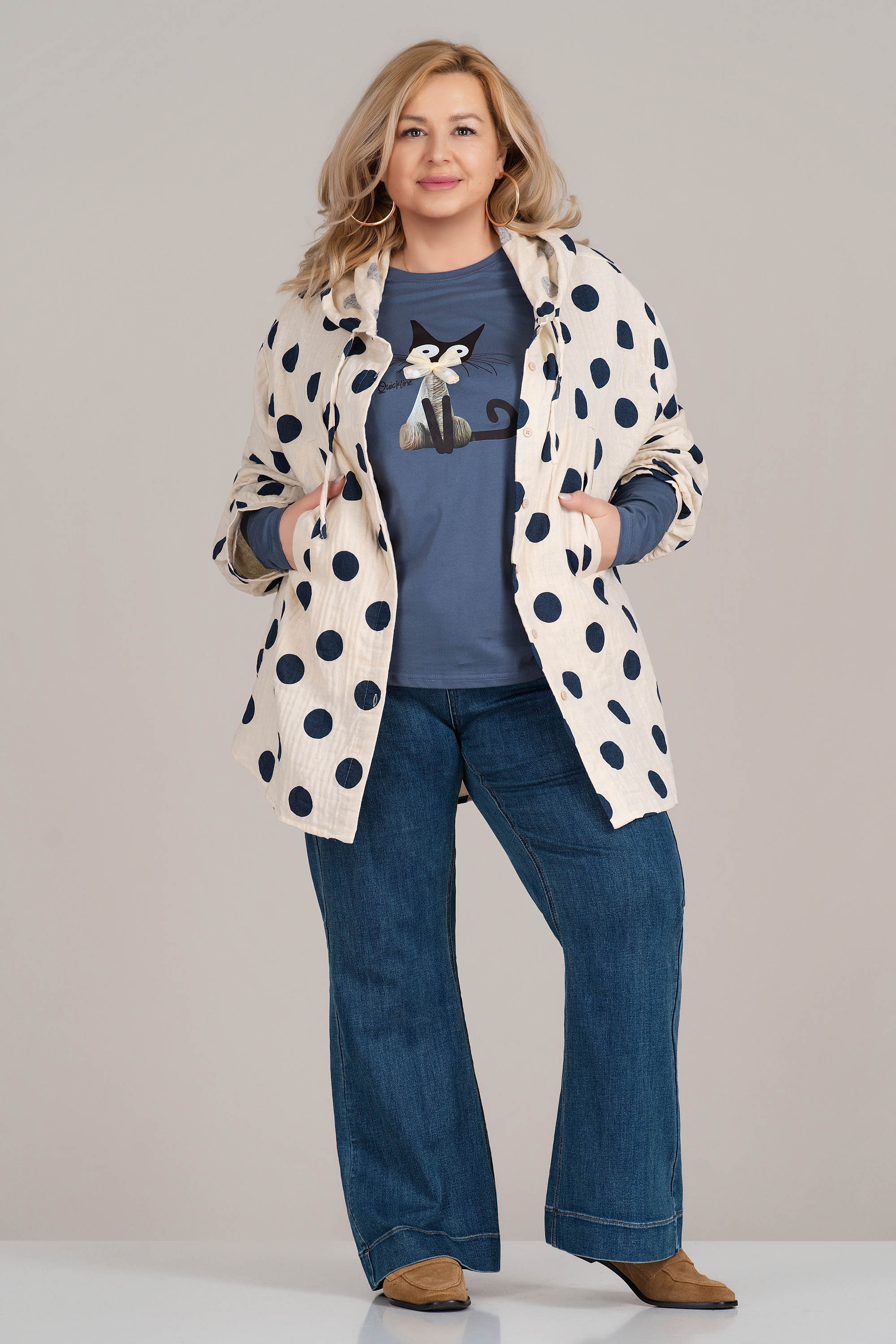 Това пролетно яке впечатлява с игрив и свеж дизайн – светлобежов фон, изпъстрен с едри точки в тъмносиньо. Моделът е с удобна качулка, връзки за регулиране и закопчаване с копчета. Свободната кройка и памучната основа осигуряват комфорт при променливо време. Чудесен избор за ежедневието в преходните сезони.