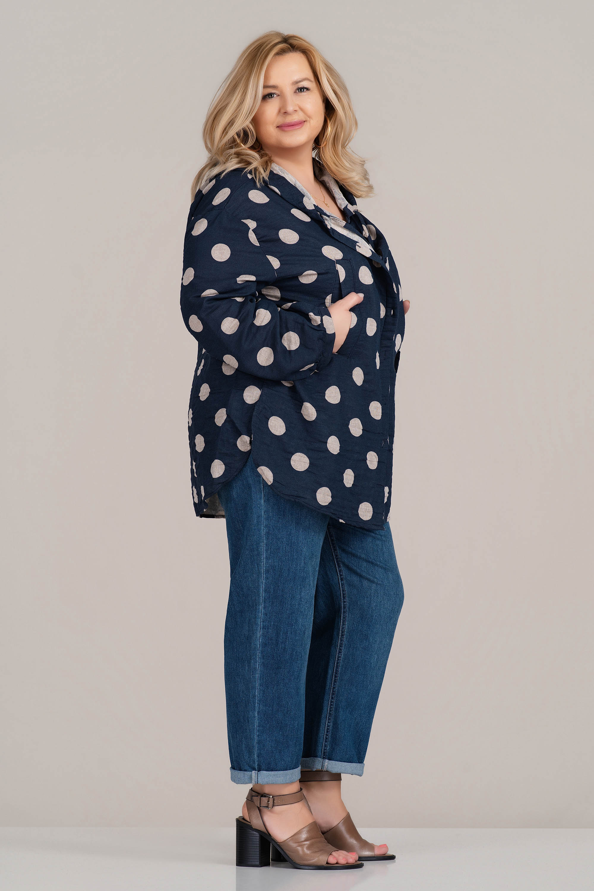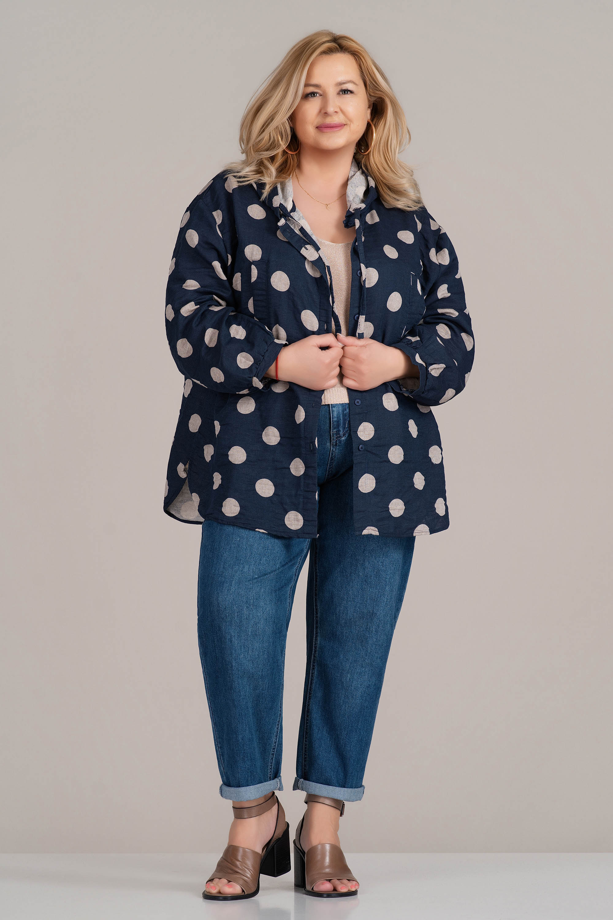 Това пролетно яке впечатлява с игрив и свеж дизайн – тъмносин фон, изпъстрен с едри точки в бежово. Моделът е с удобна качулка, връзки за регулиране и закопчаване с копчета. Свободната кройка и памучната основа осигуряват комфорт при променливо време. Чудесен избор за ежедневието в преходните сезони.