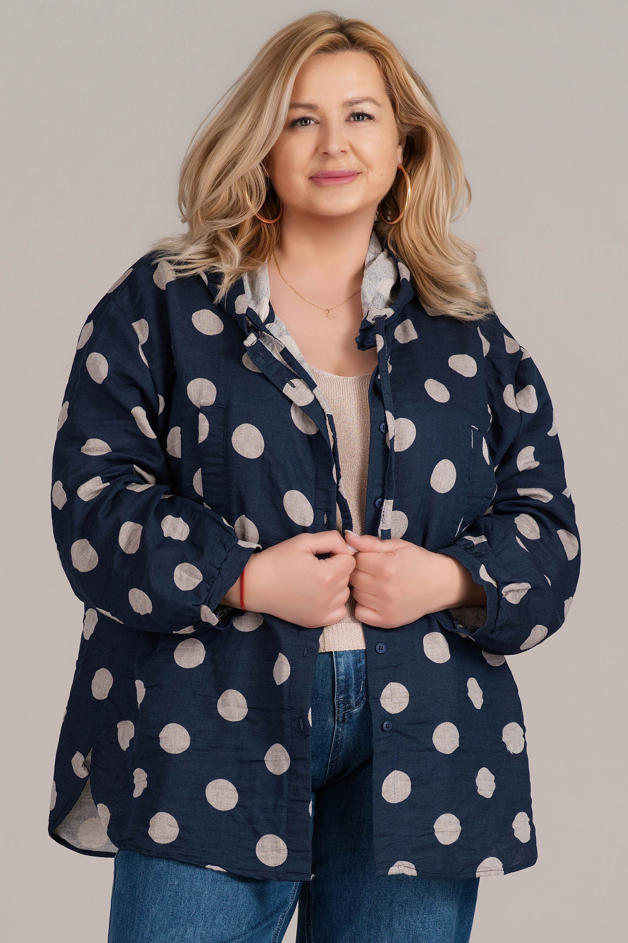 Макси пролетно яке с качулка в тъмносиньо с принт светли точки