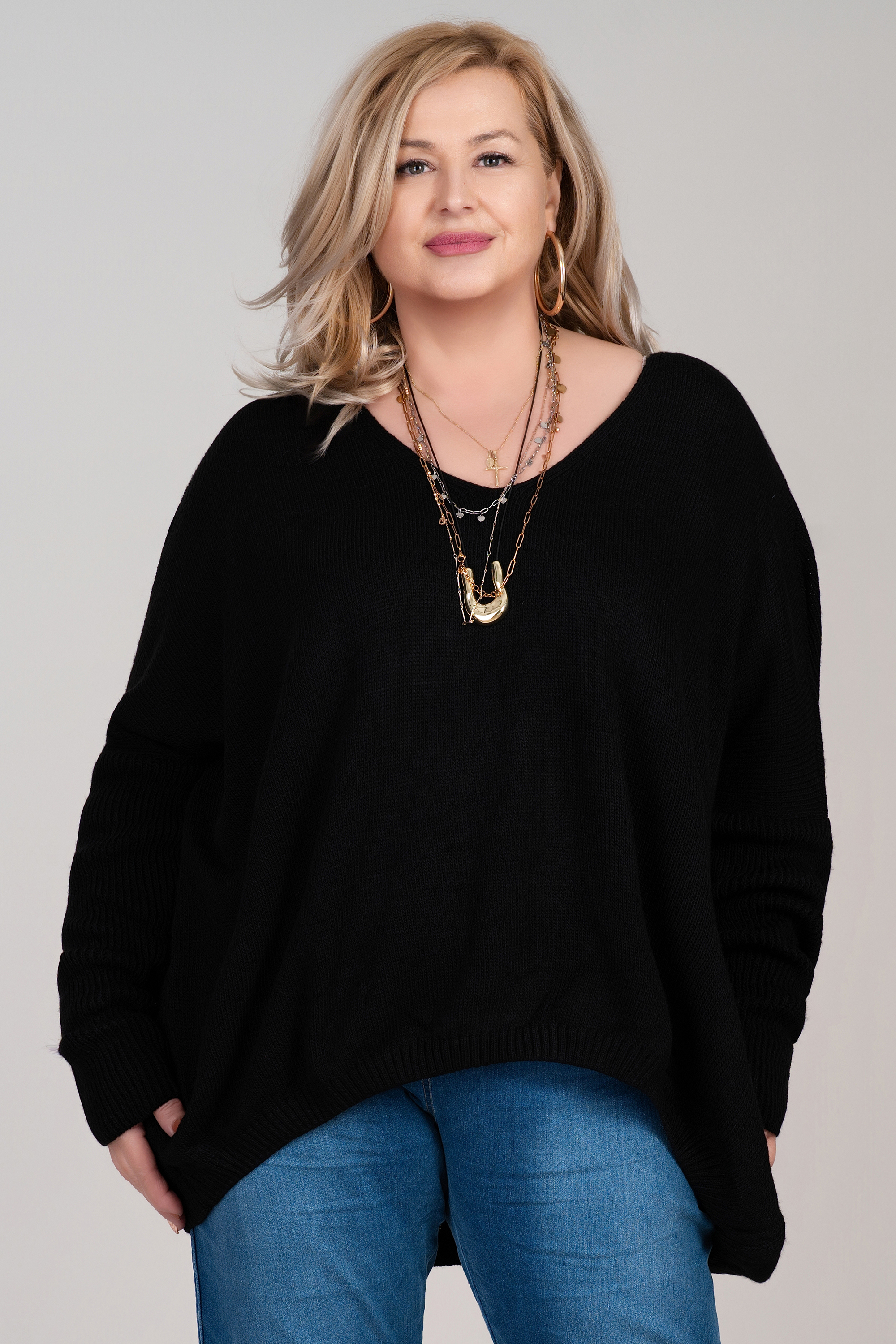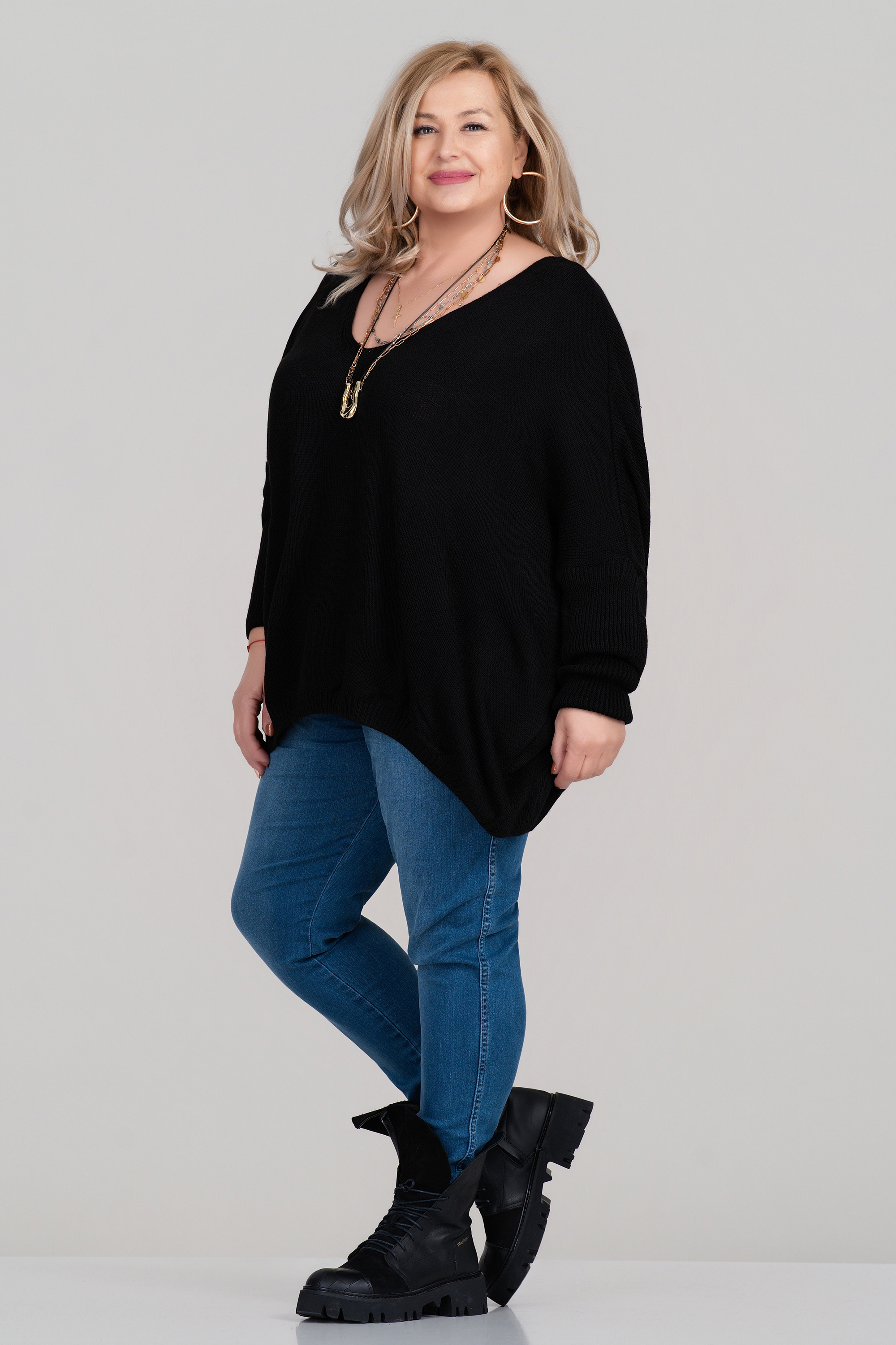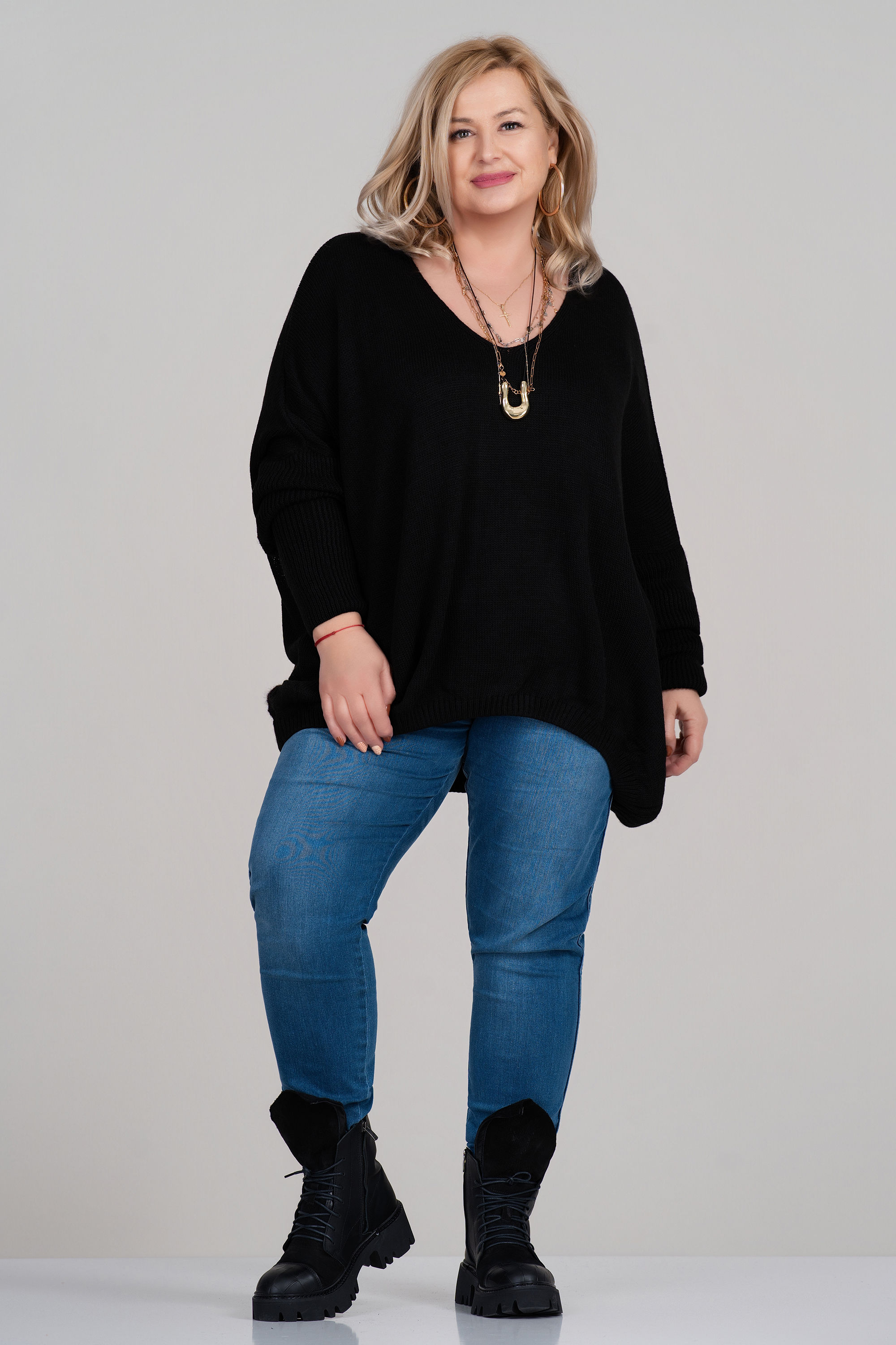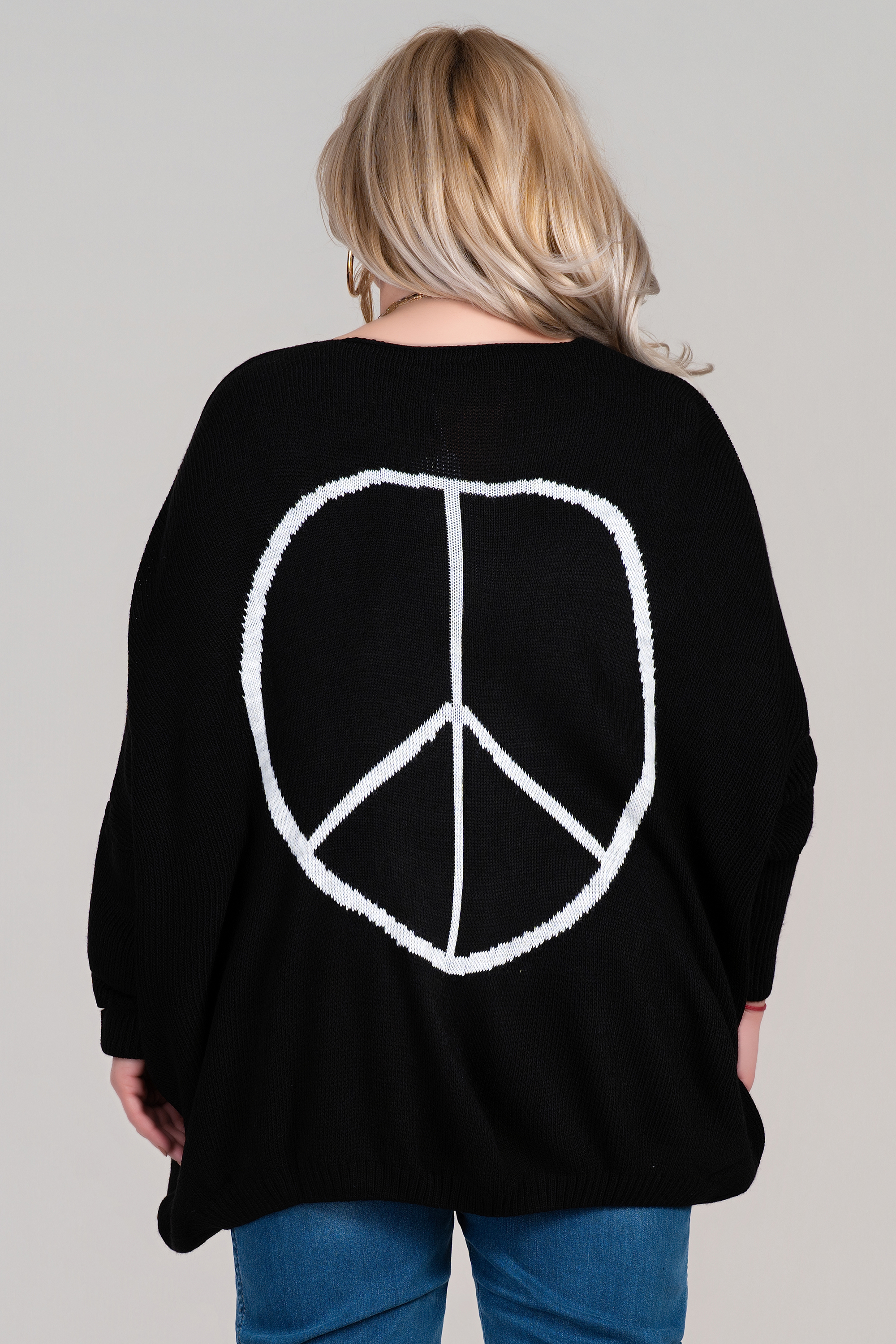 Този макси пуловер в класическо черно впечатлява със свободна кройка, фино плетиво и изчистен силует. Акцентът пада върху гърба – голям бял знак за мир, който придава модерен и артистичен характер. Острото деколте допринася за издължаване на шията и подчертава линията на лицето. Практичен избор за есенно-зимния сезон, както за ежедневието, така и за по-неформални поводи.