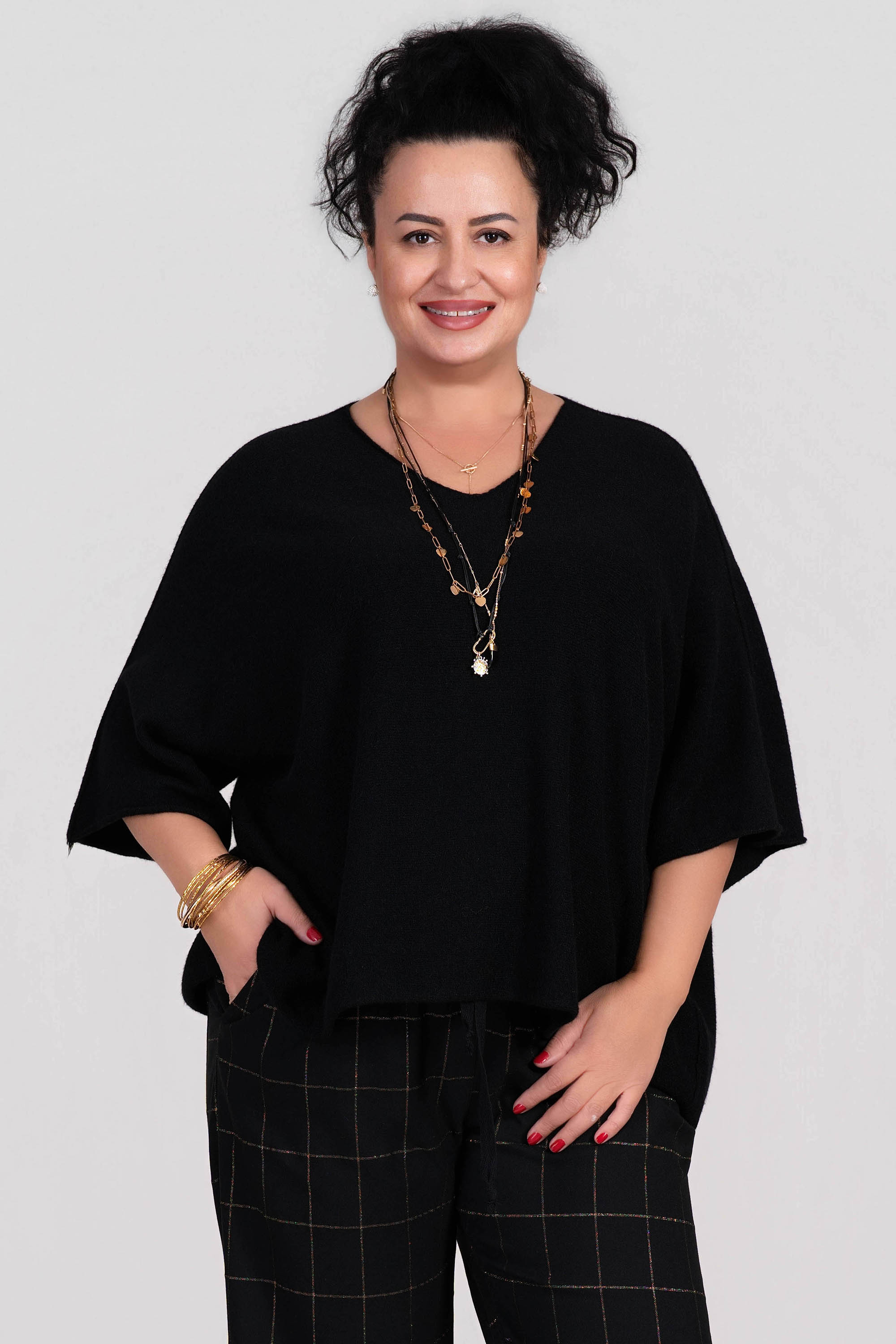 Едноцветен макси пуловер с елегантен силует и меко остро деколте. Моделът е изработен от фино италианско плетиво и е със стилен 7/8 ръкав, който подчертава линията на ръцете. Материята е нежна и приятна на допир, подходяща за преходни сезони. Универсален модел за съчетание с панталони, поли или дънки.
