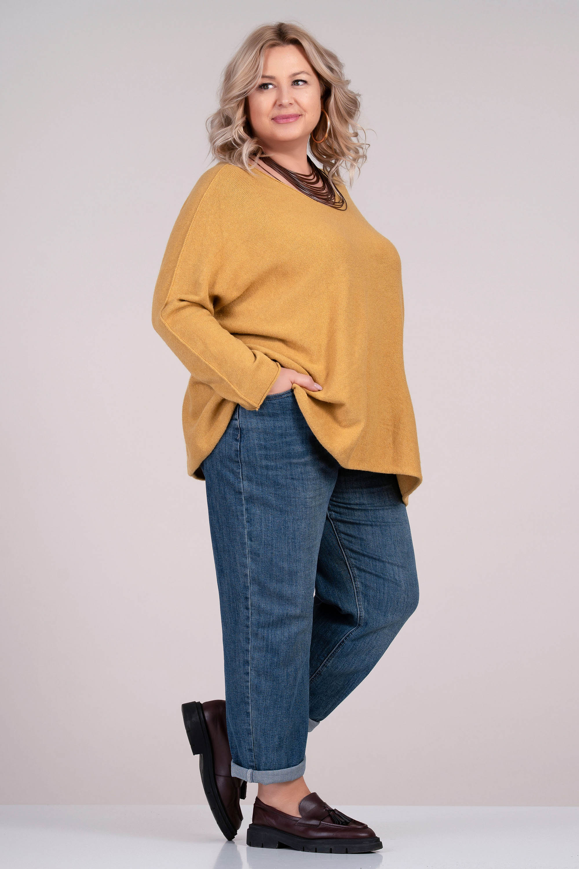 Този макси пуловер в меко жълто съчетава стил и удобство. Финото плетиво осигурява приятно усещане върху кожата, а широката кройка с остро деколте придава женственост и свобода на движение. Подходящ за носене както самостоятелно, така и в съчетание с риза или топ.
