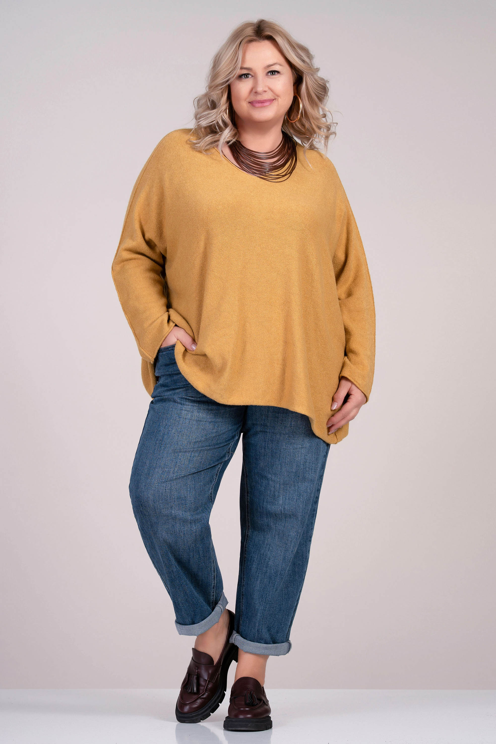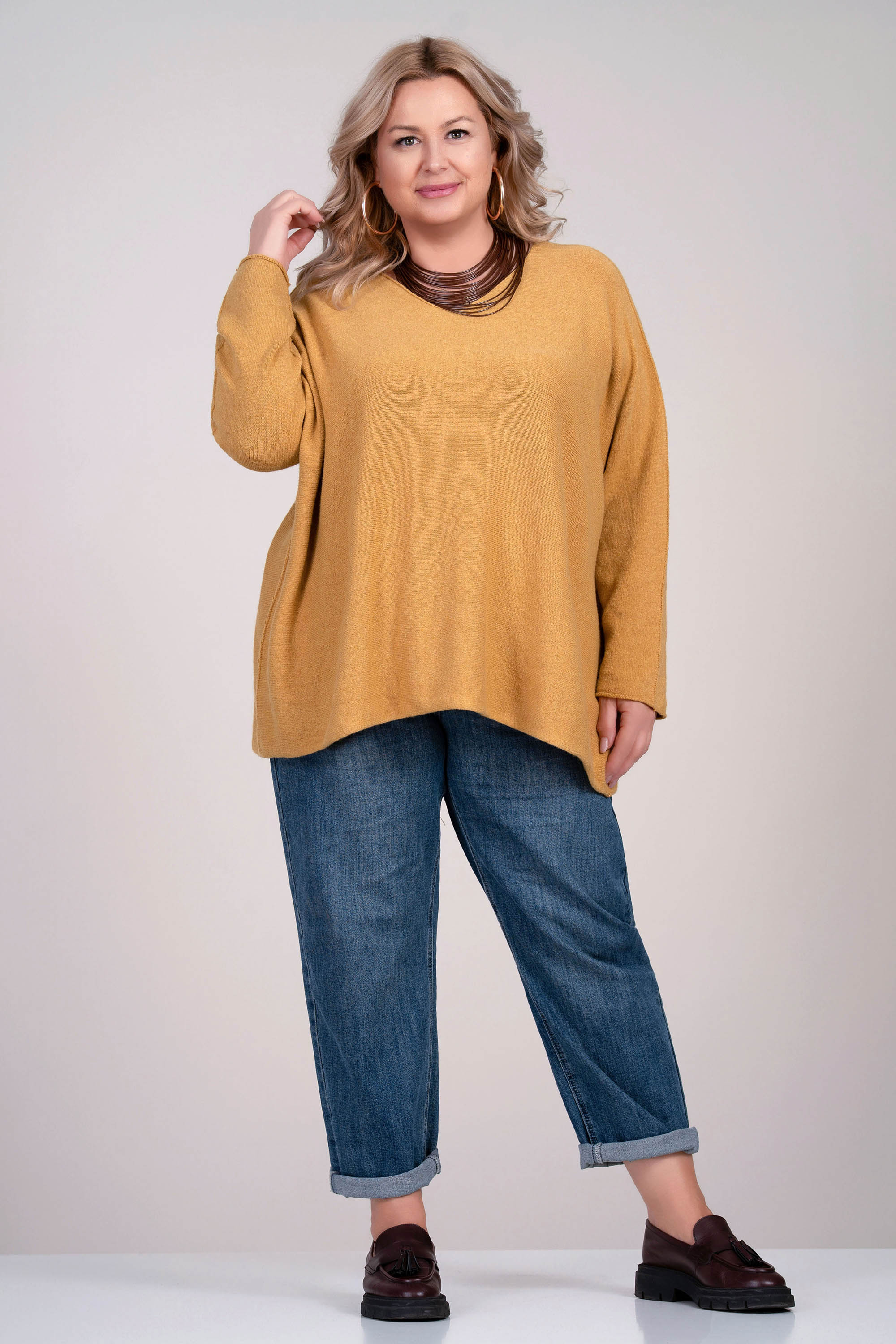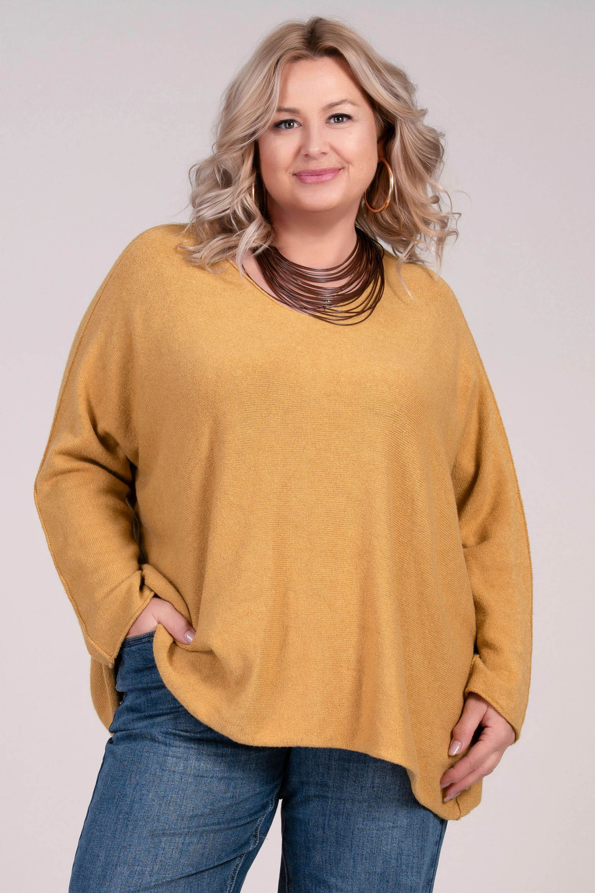 Този макси пуловер в меко жълто съчетава стил и удобство. Финото плетиво осигурява приятно усещане върху кожата, а широката кройка с остро деколте придава женственост и свобода на движение. Подходящ за носене както самостоятелно, така и в съчетание с риза или топ.