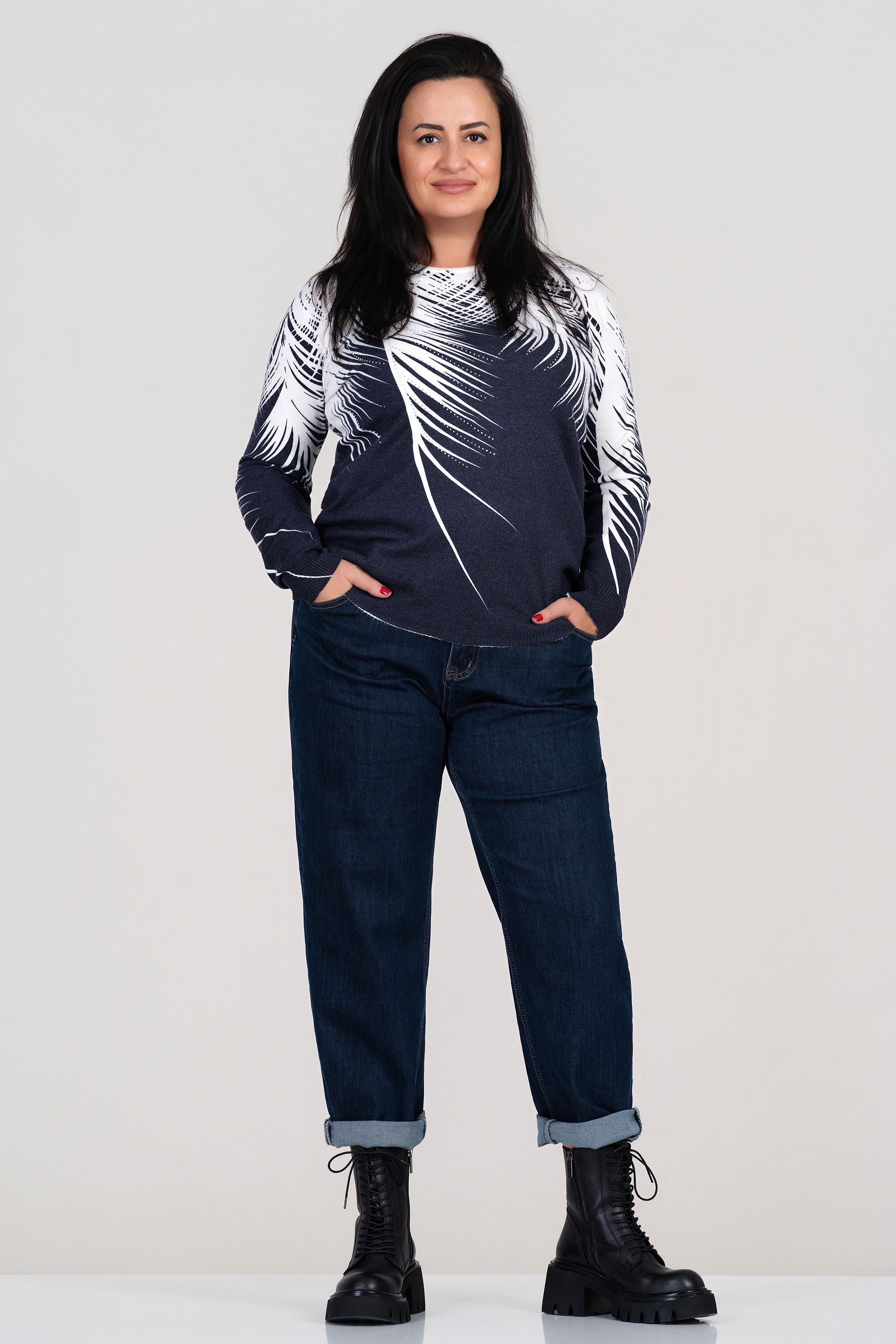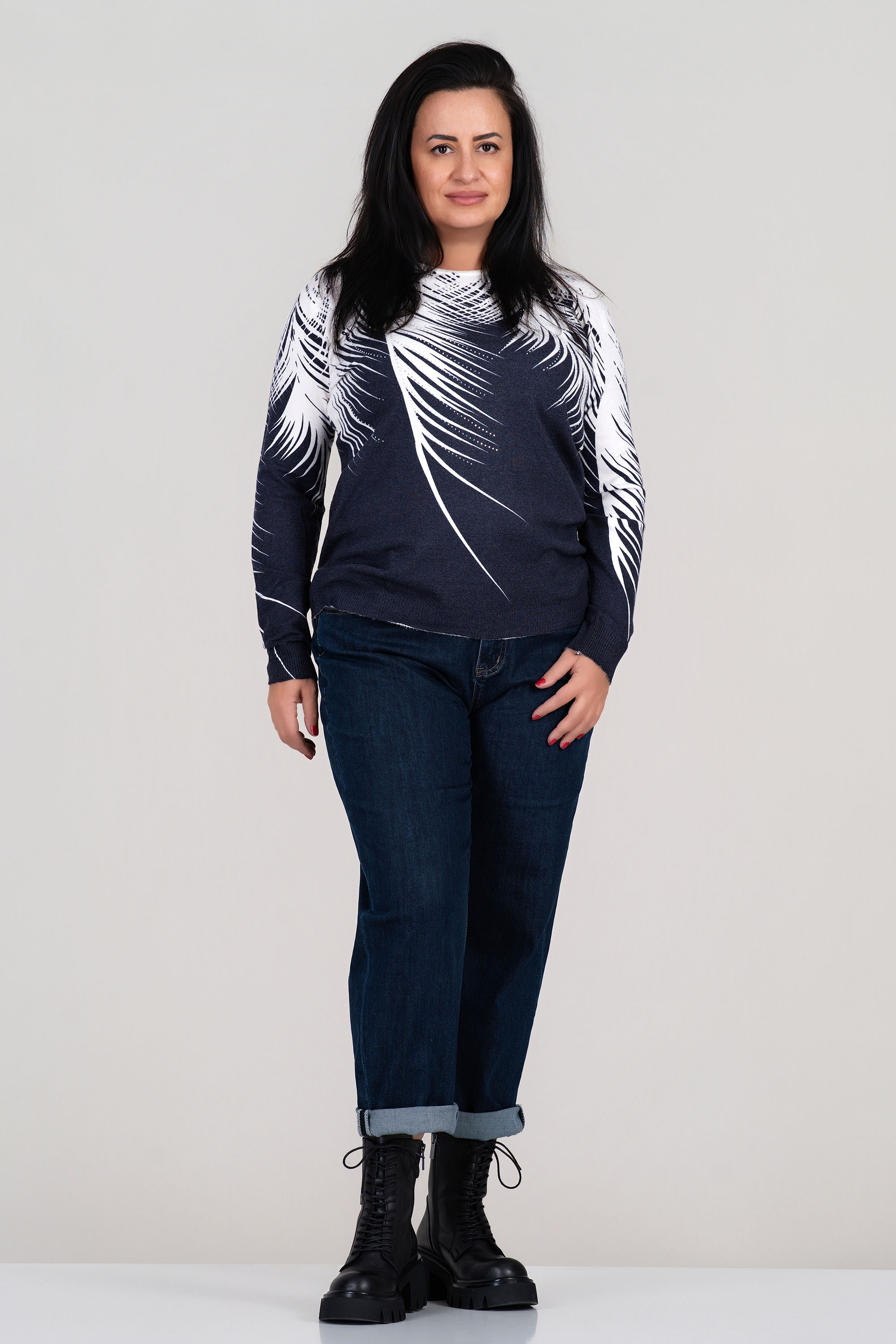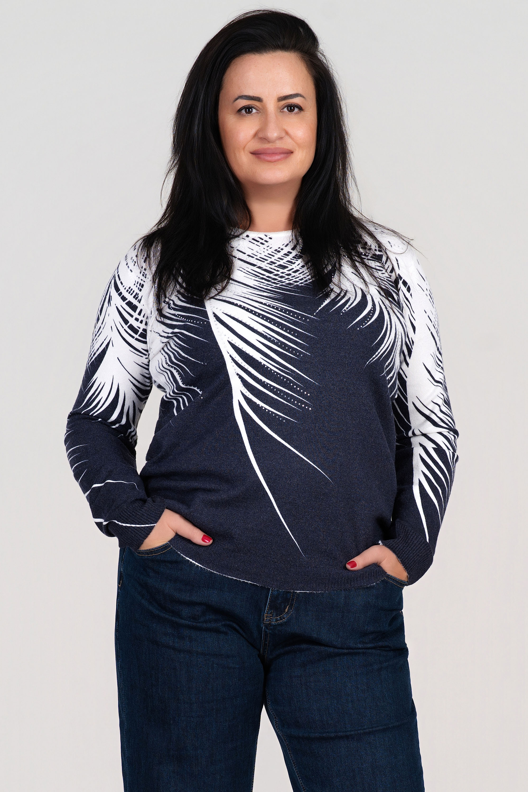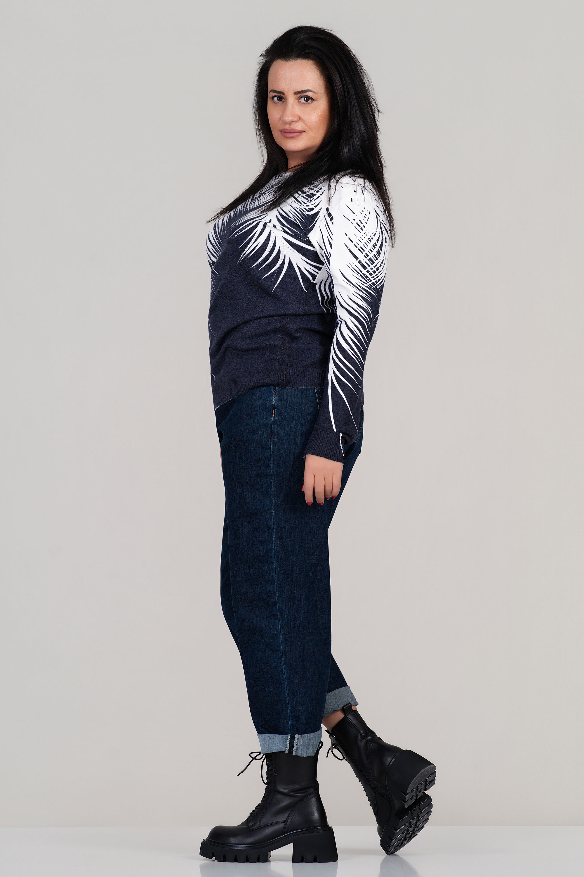 Този пуловер от фино плетиво в тъмносиньо е едновременно ефектен и универсален. Белият принт с клони придава артистичност, докато класическата линия осигурява удобство при носене. Подходящ за ежедневно носене, особено в по-хладните сезони, и лесен за комбиниране с различни стилове.