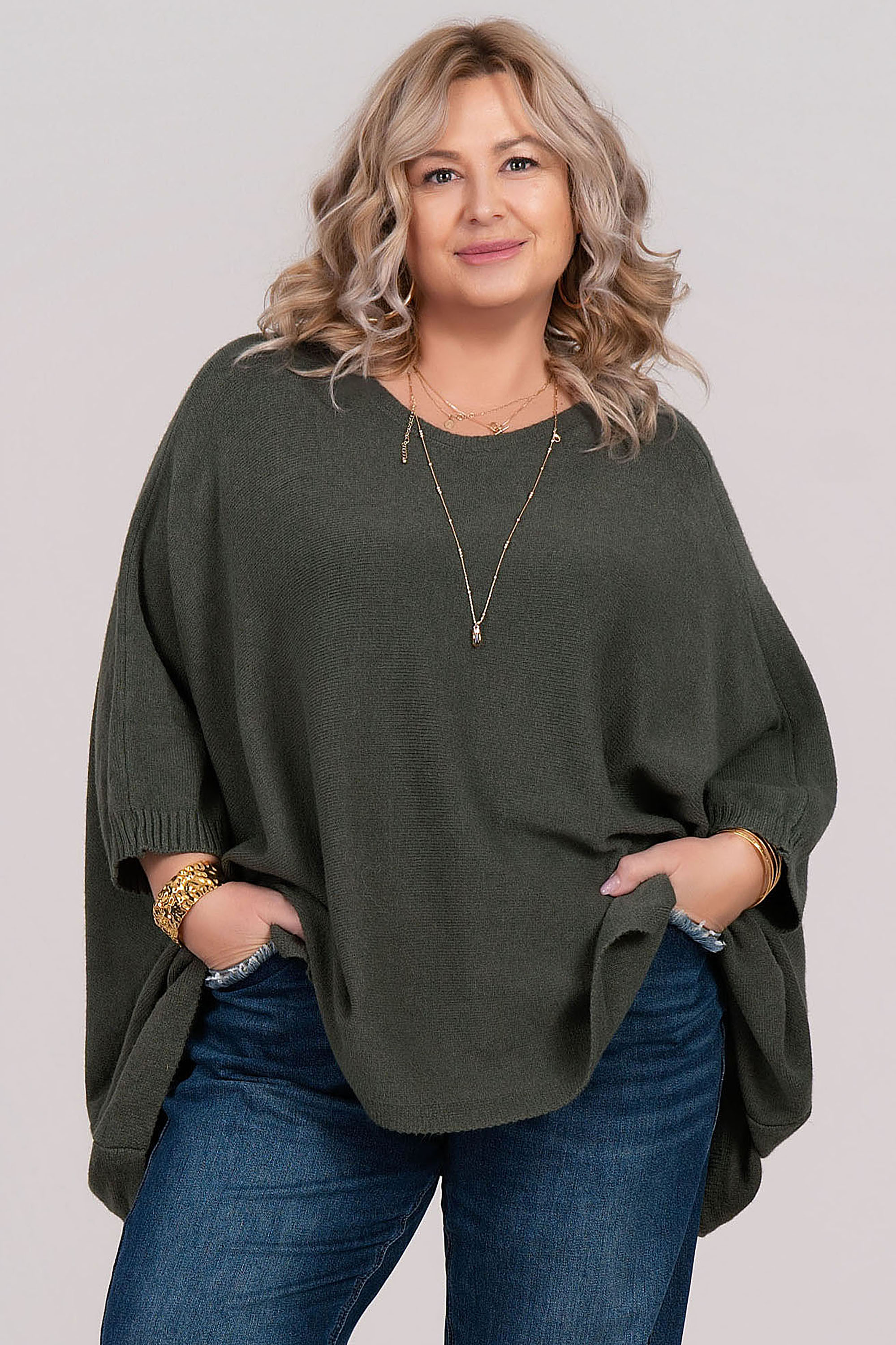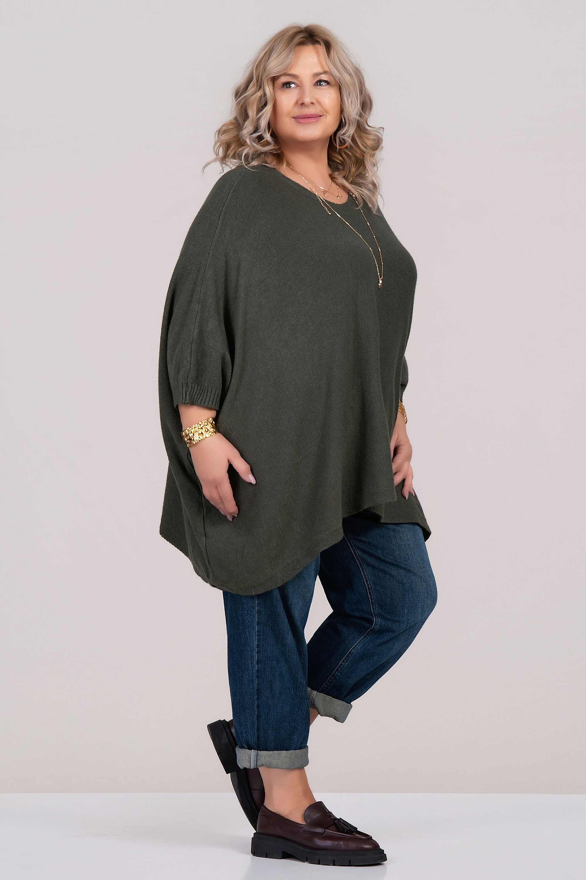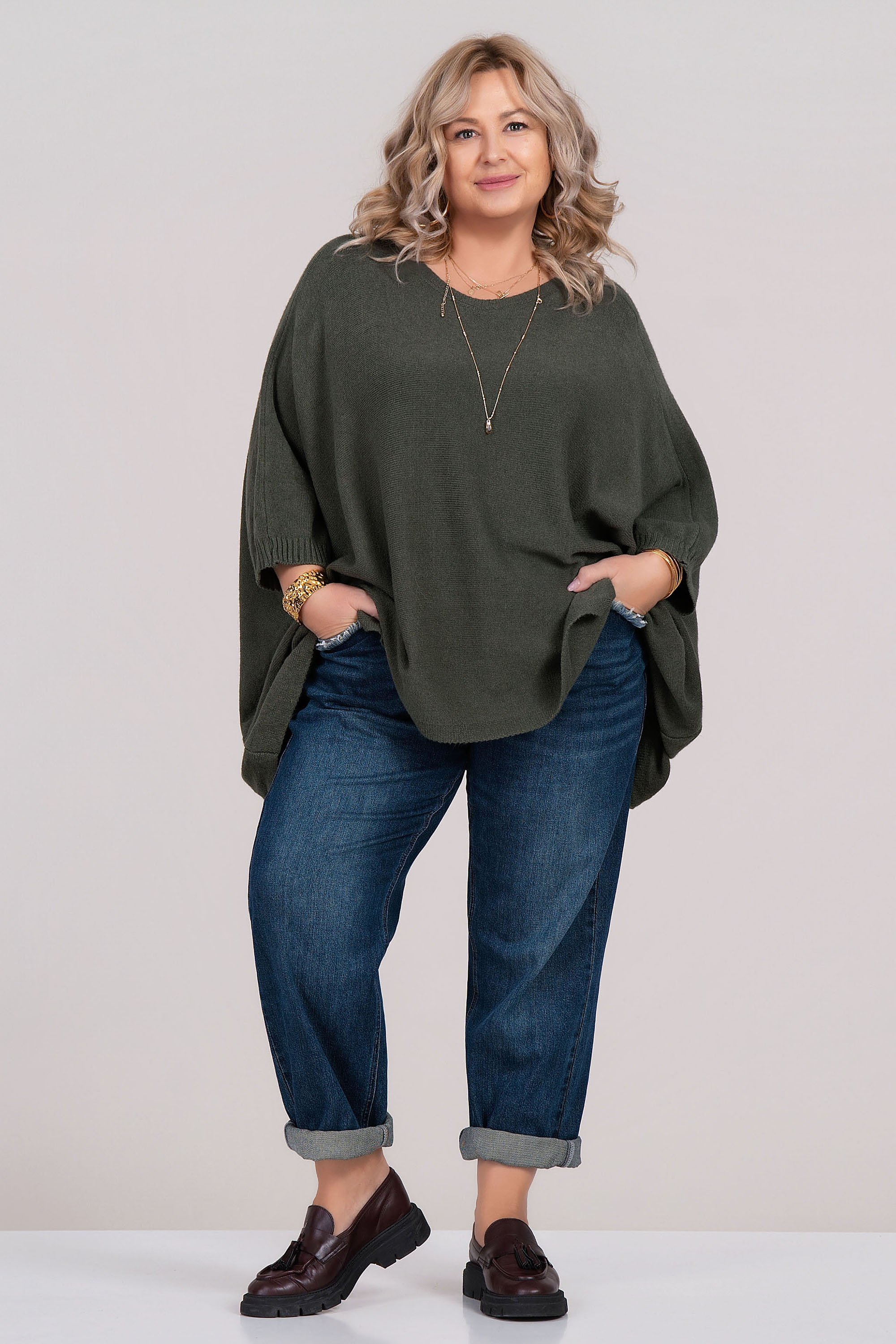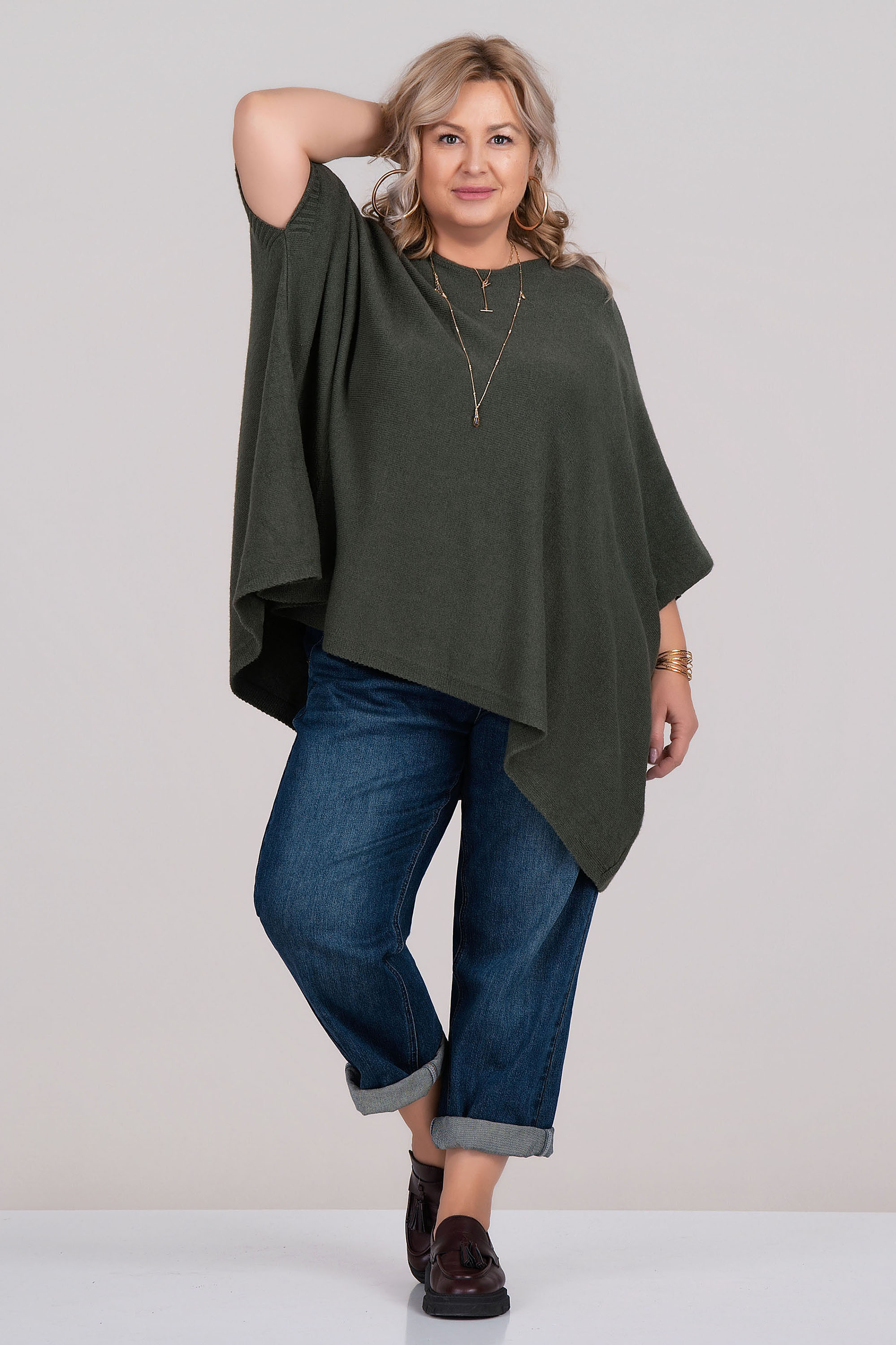 Елегантен макси пуловер от меко фино плетиво, осигуряващ комфорт и стил във всеки сезон. Асиметричният дизайн и острото деколте придават модерна линия и визуално издължават силуета. Моделът е с 7/8 ръкав и е подходящ както за ежедневна, така и за по-елегантна визия. Материята с вискоза гарантира приятно усещане върху кожата и лесна поддръжка.