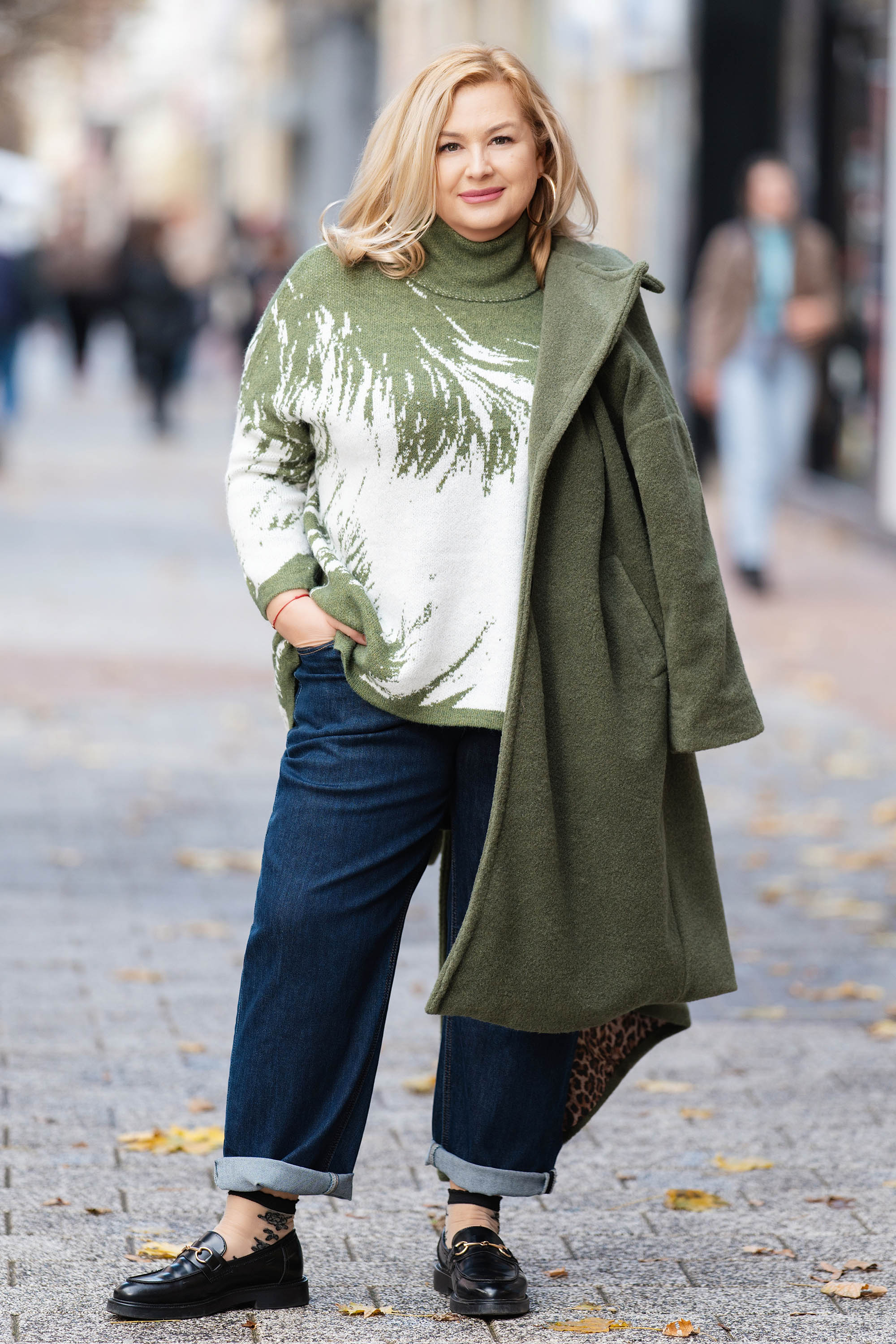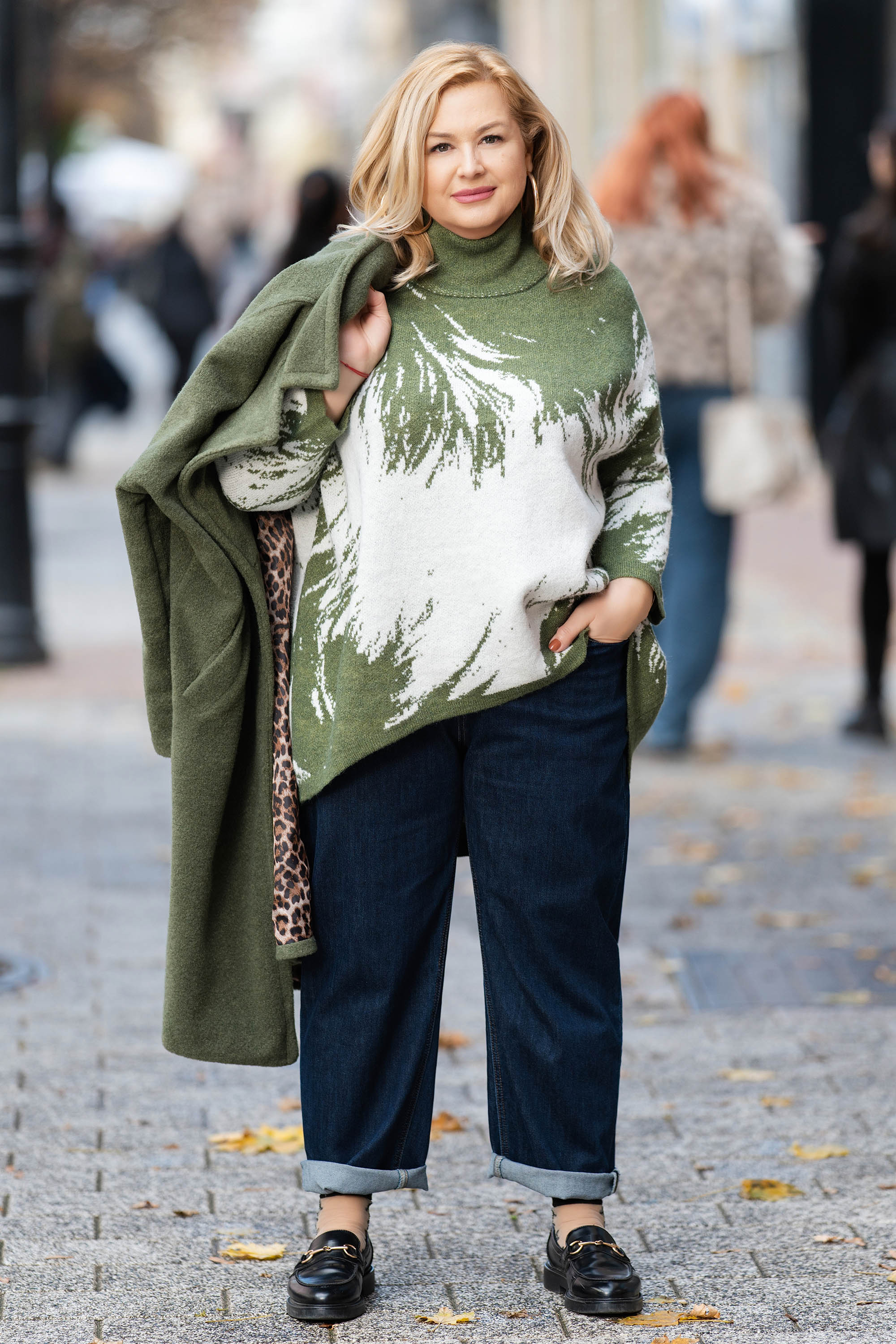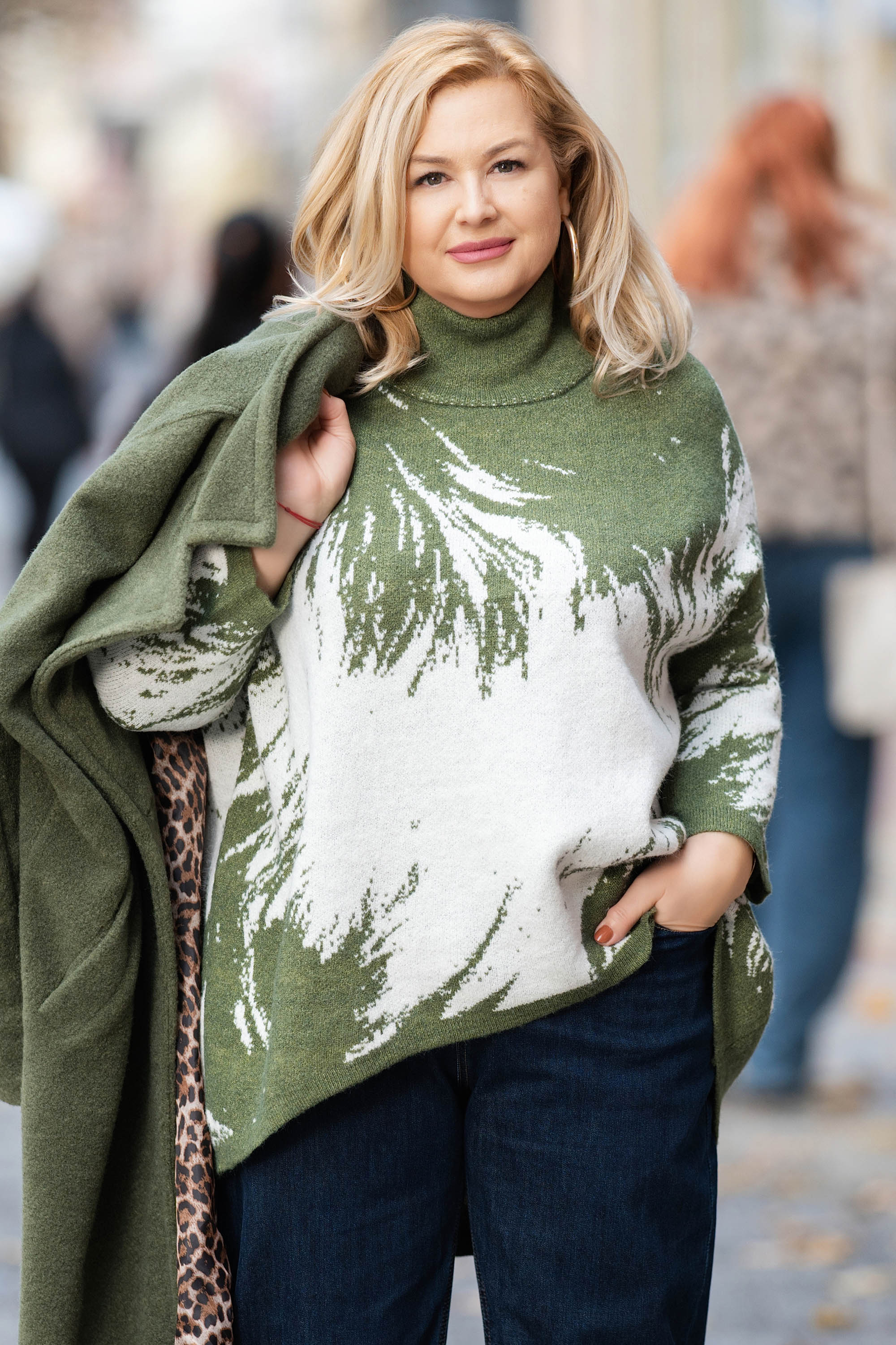 Този макси пуловер съчетава комфорт и свежа визия с абстрактен принт в бяло. Изработен от меко фино плетиво с еластичност, моделът приляга свободно и осигурява свобода на движение. Поло яката добавя топлина и стил, идеален избор за есенно-зимния сезон. Подходящ както за ежедневие, така и за по-елегантни визии.