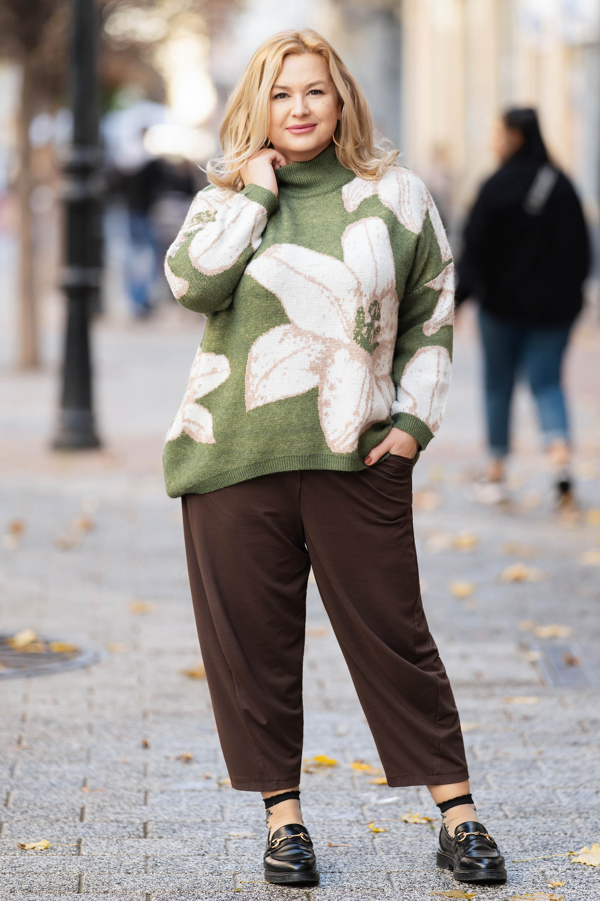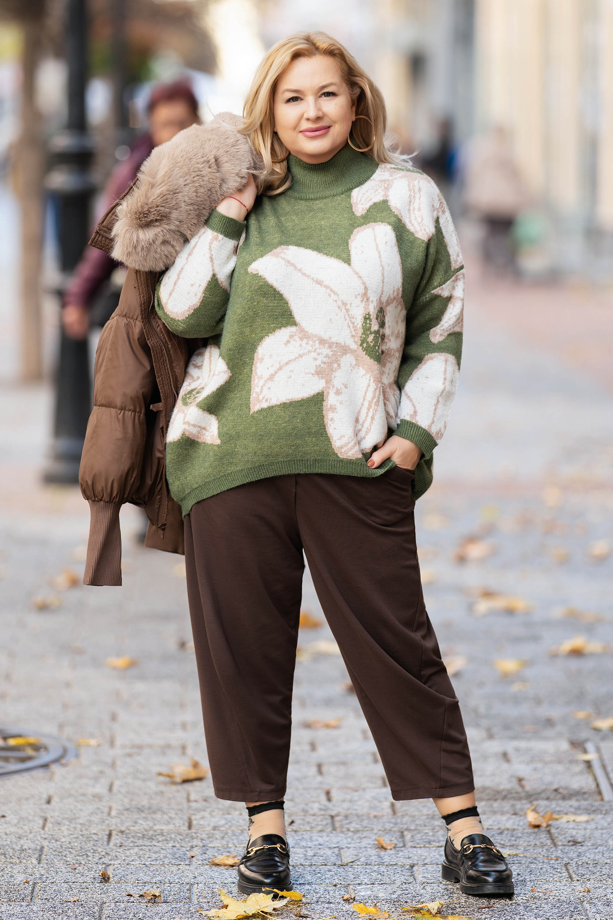 Този макси пуловер съчетава комфорт и свежа визия с флорален мотив в бяло. Изработен от меко фино плетиво с еластичност, моделът приляга свободно и осигурява свобода на движение. Поло яката добавя топлина и стил, идеален избор за есенно-зимния сезон. Подходящ както за ежедневие, така и за по-елегантни визии.