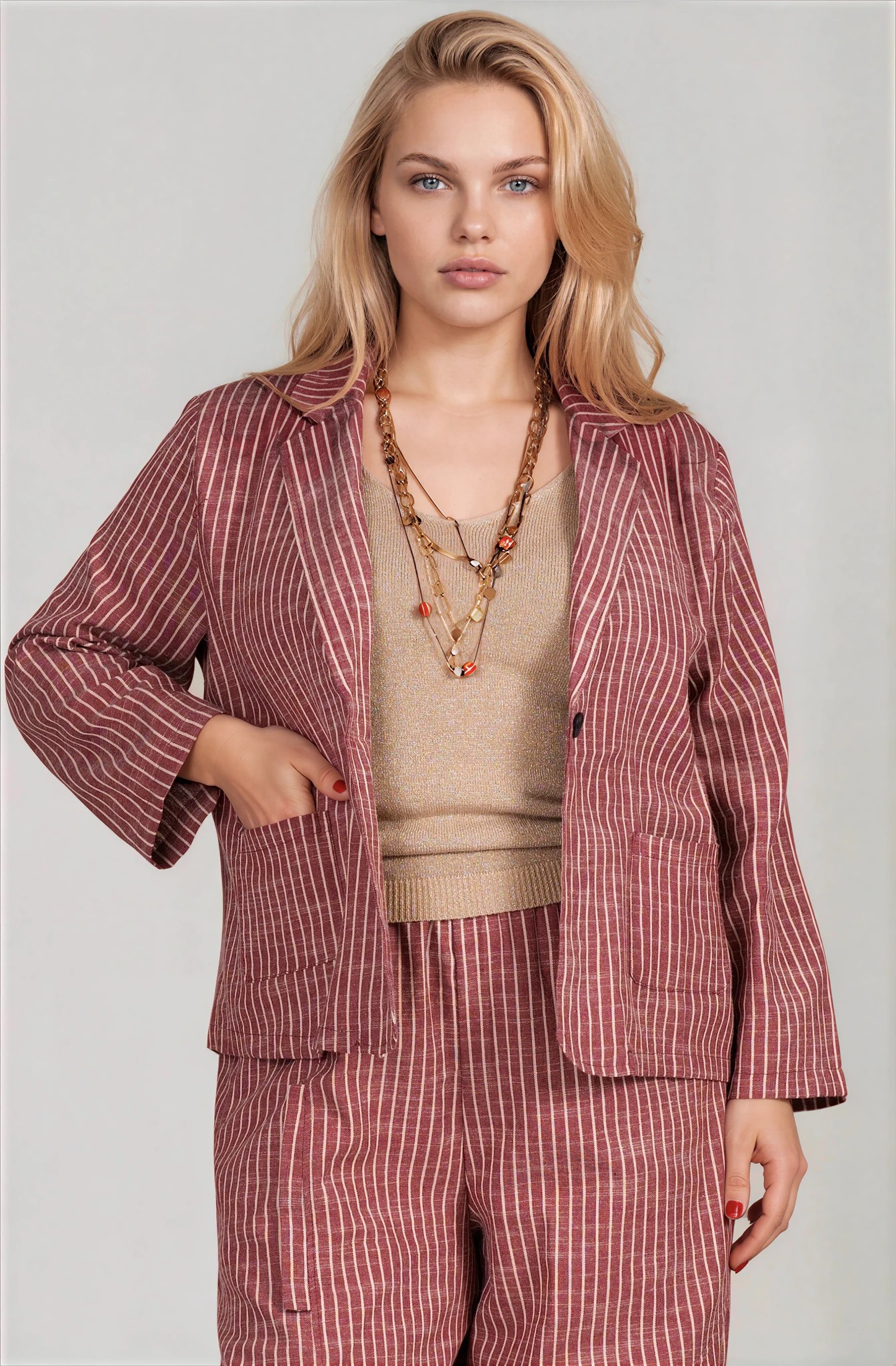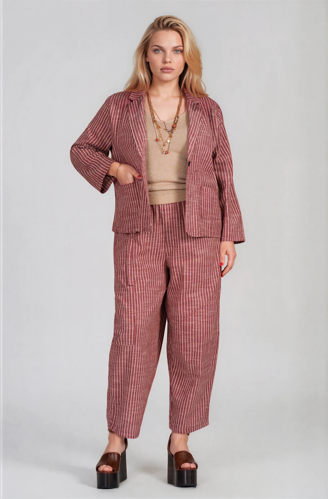 Стилен макси комплект с фино райе, състоящ се от сако и панталон. Моделът комбинира удобство и модерна визия, като памучната материя осигурява естествен комфорт и добра проветривост, а еластанът придава лека еластичност.