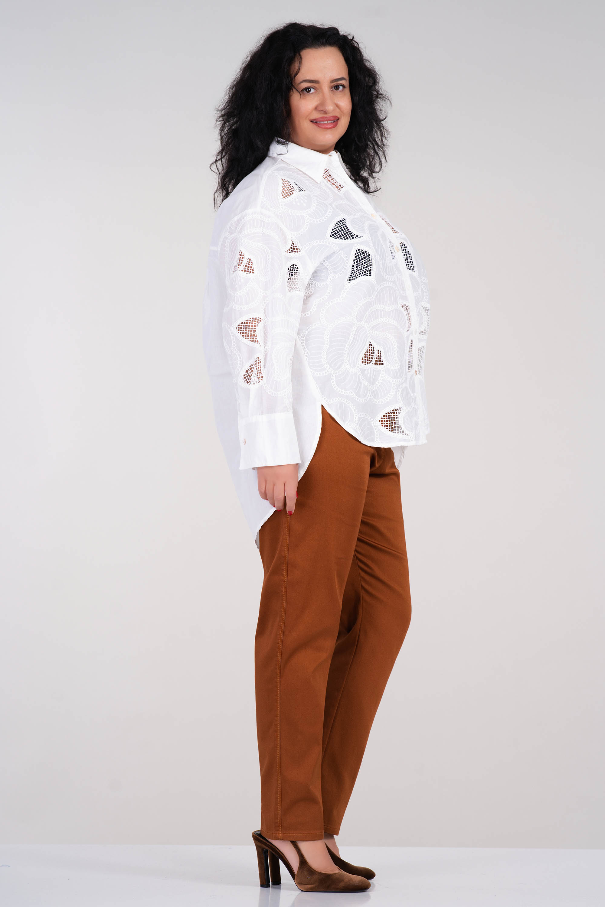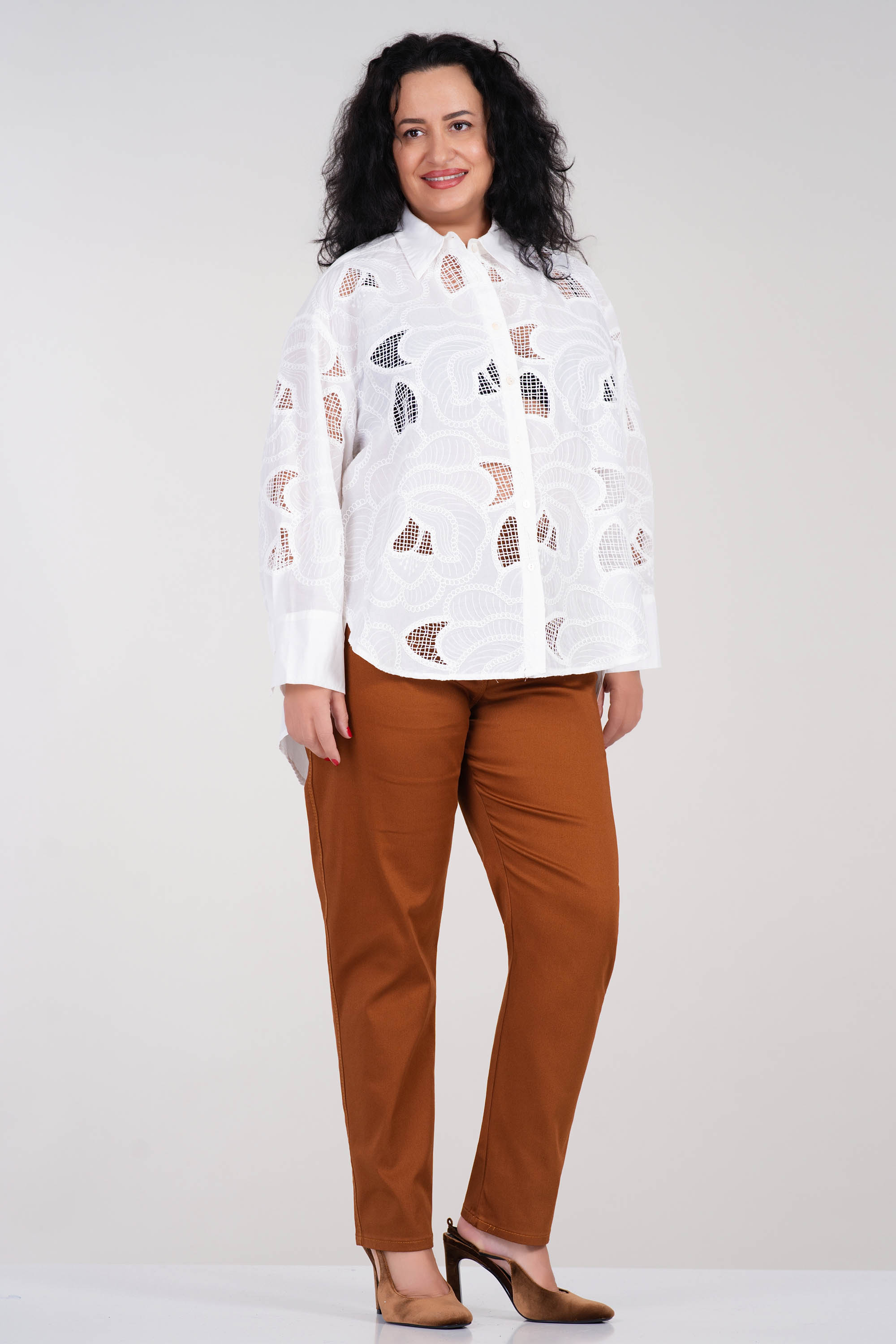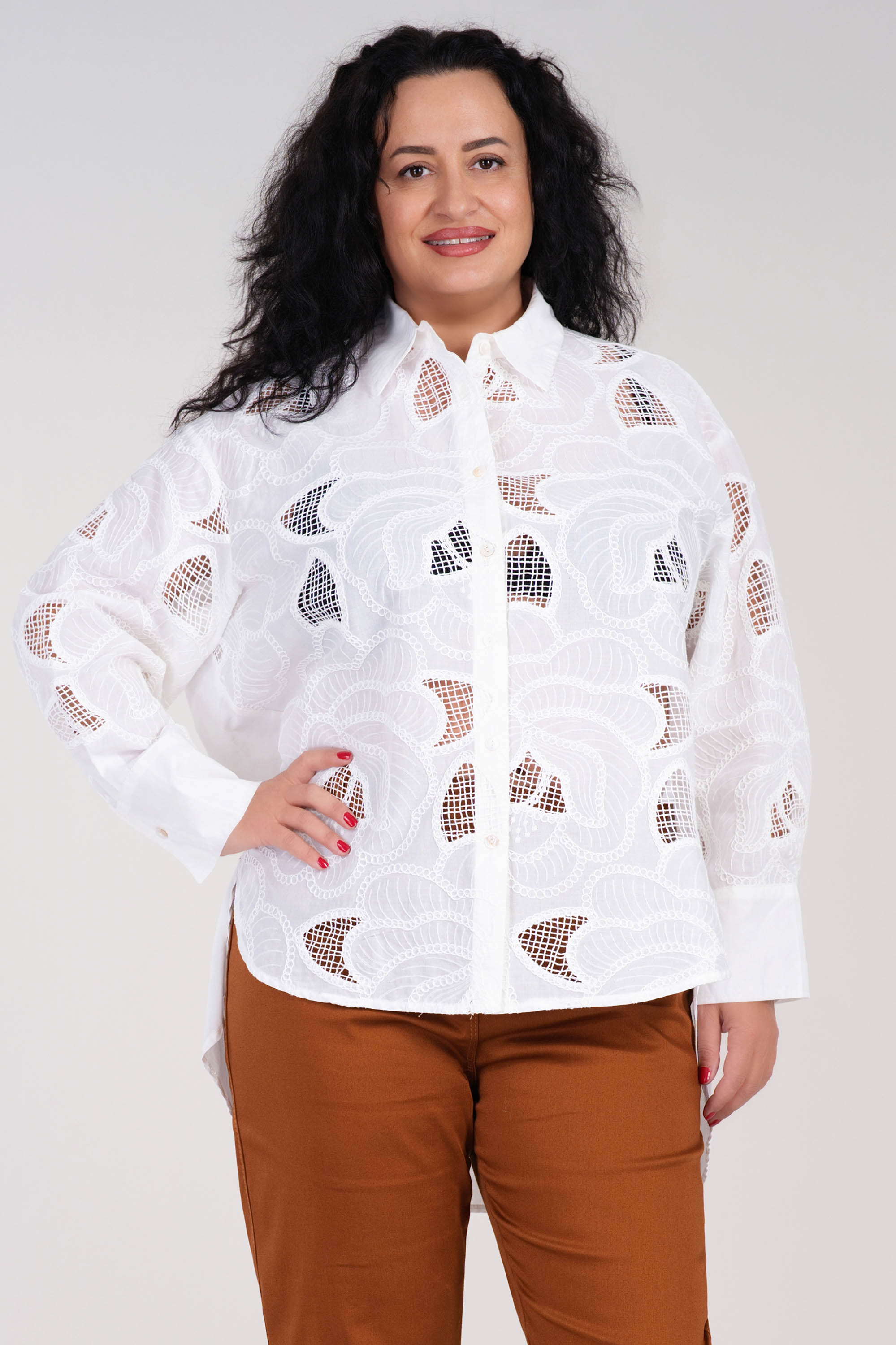 Изработена от 100% памук с изразителна флорална рязана бродерия, тази риза впечатлява с елегантна визия и лекота при носене. Свободната кройка и издълженият гръб осигуряват комфорт и свобода на движение. Фините флорални мотиви добавят артистичен щрих към класическата риза. Идеален избор за топлите сезони и за стилни градски визии.