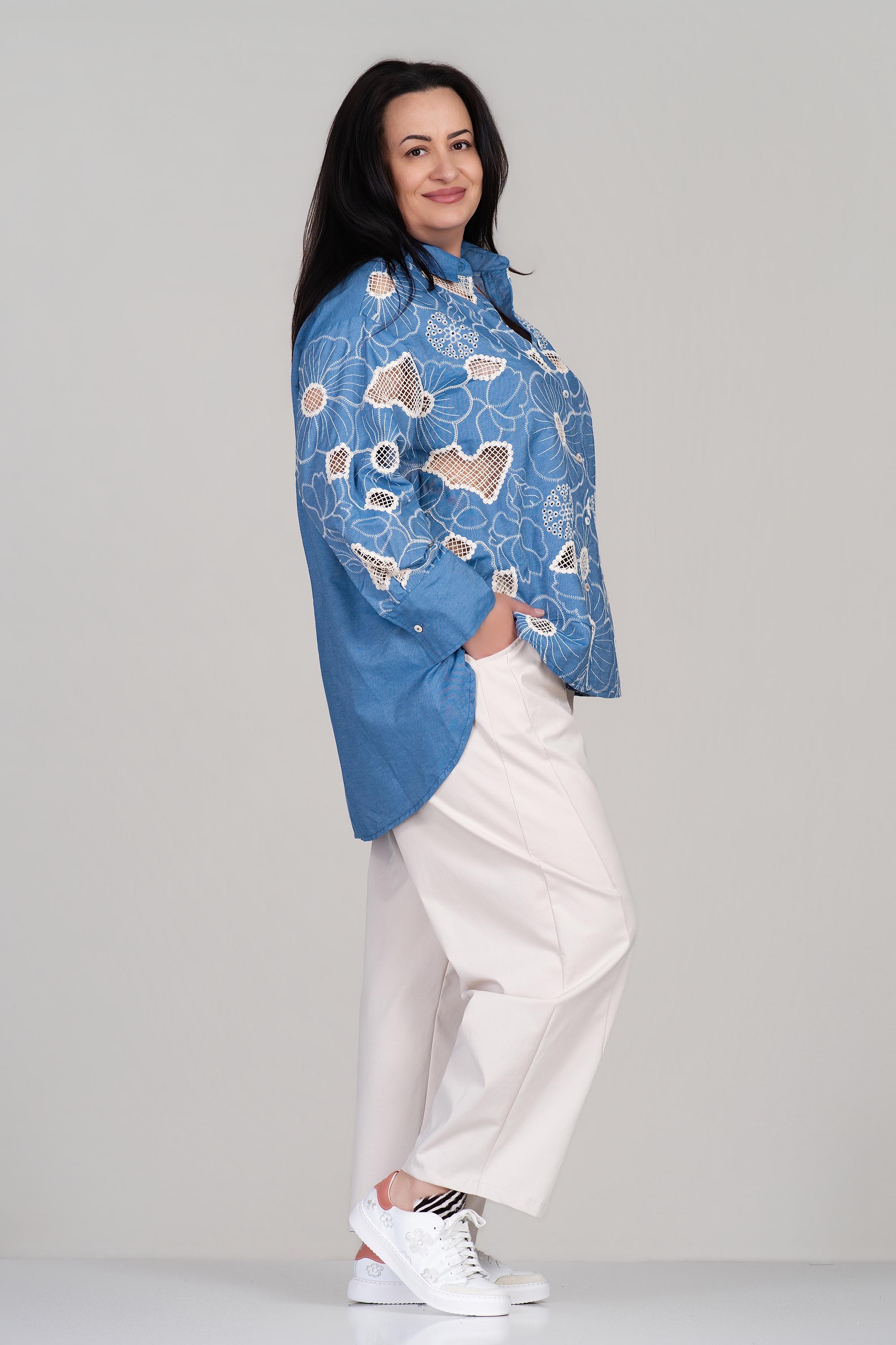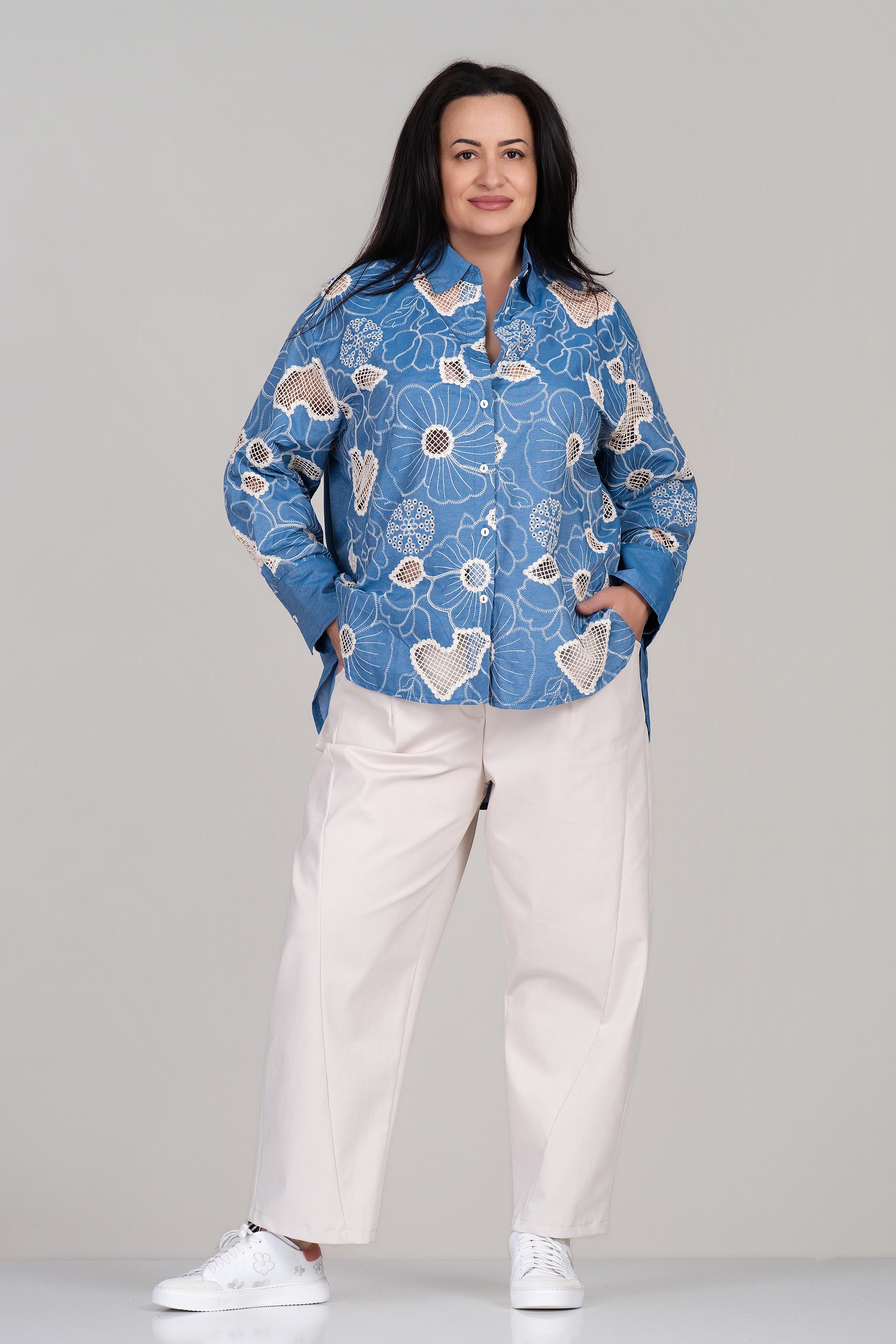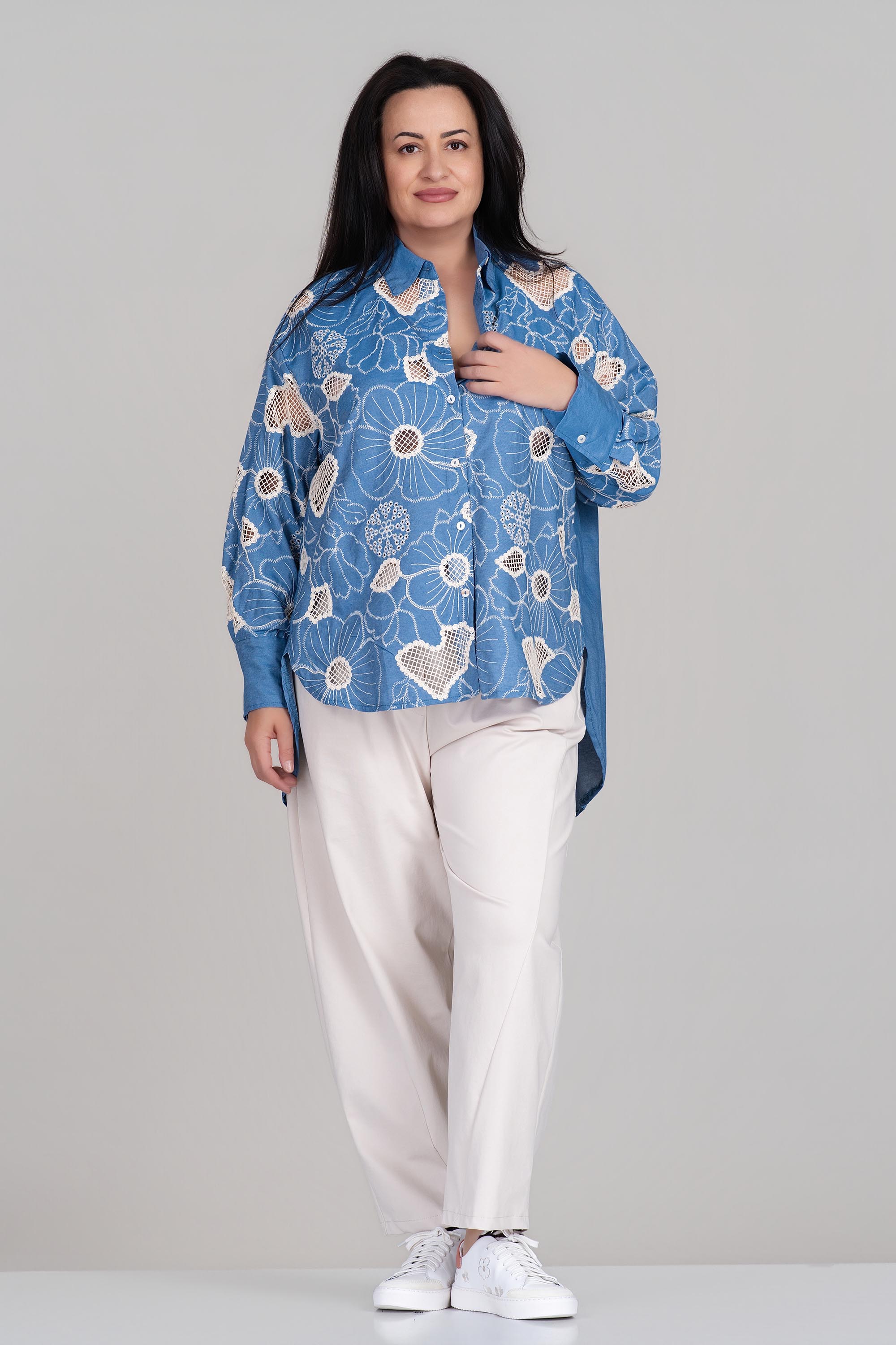 Елегантна макси риза с изразен артистичен характер и комфортна кройка. Памучната материя е мека, дишаща и подходяща за целодневно носене. Флоралният принт, комбиниран с бродирани елементи, придава релеф и отличителност на визията. Класическата яка и копчетата създават балансиран силует, подходящ както за ежедневие, така и за по-елегантни комбинации.
