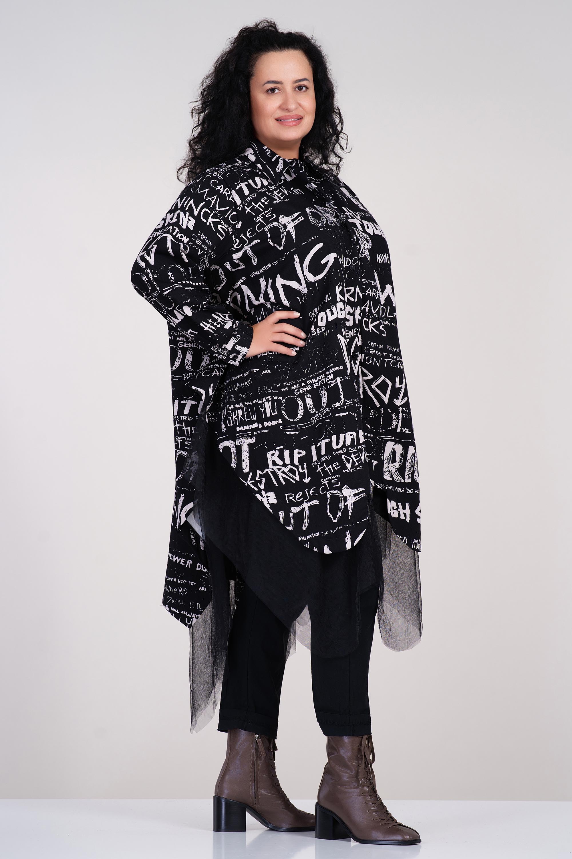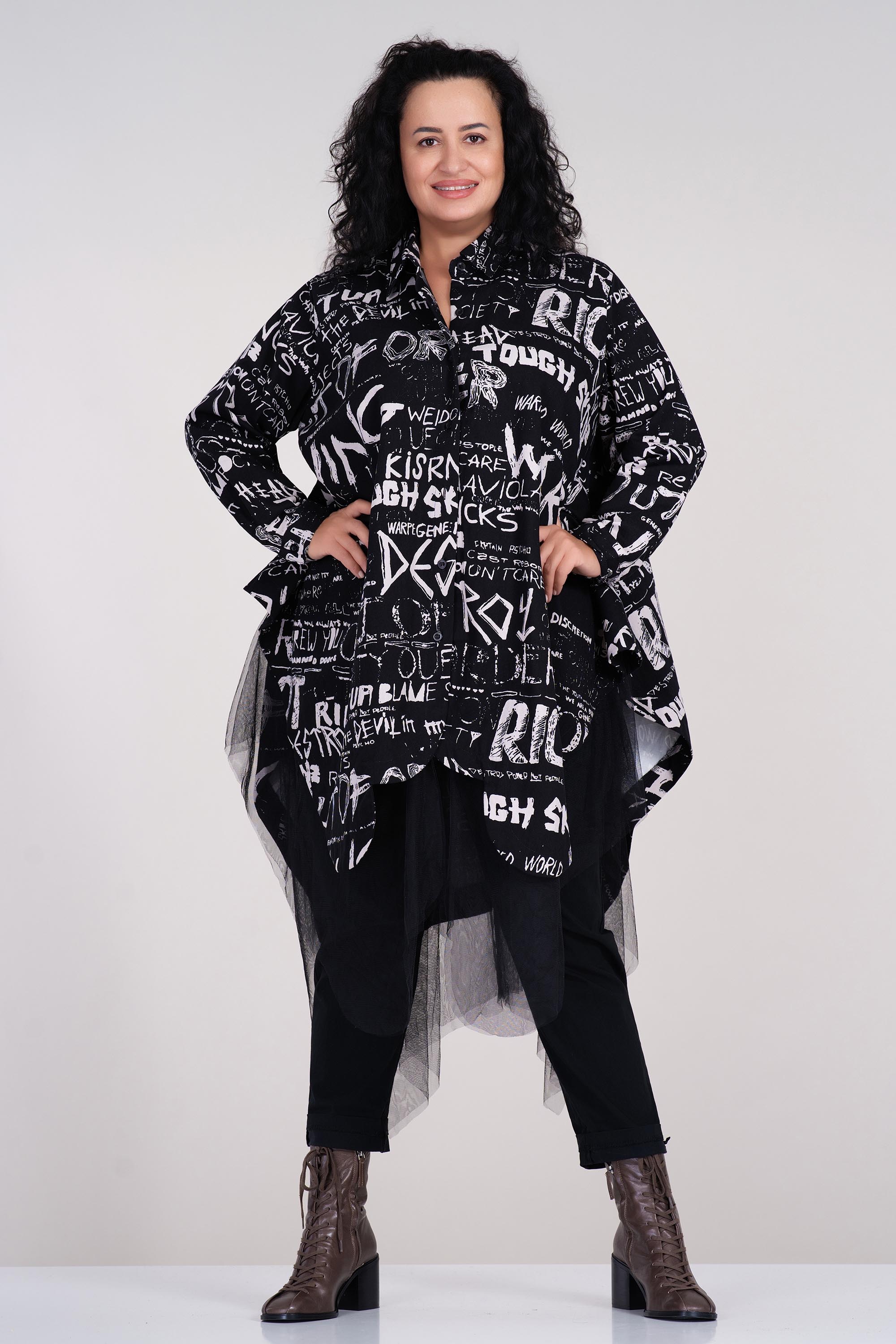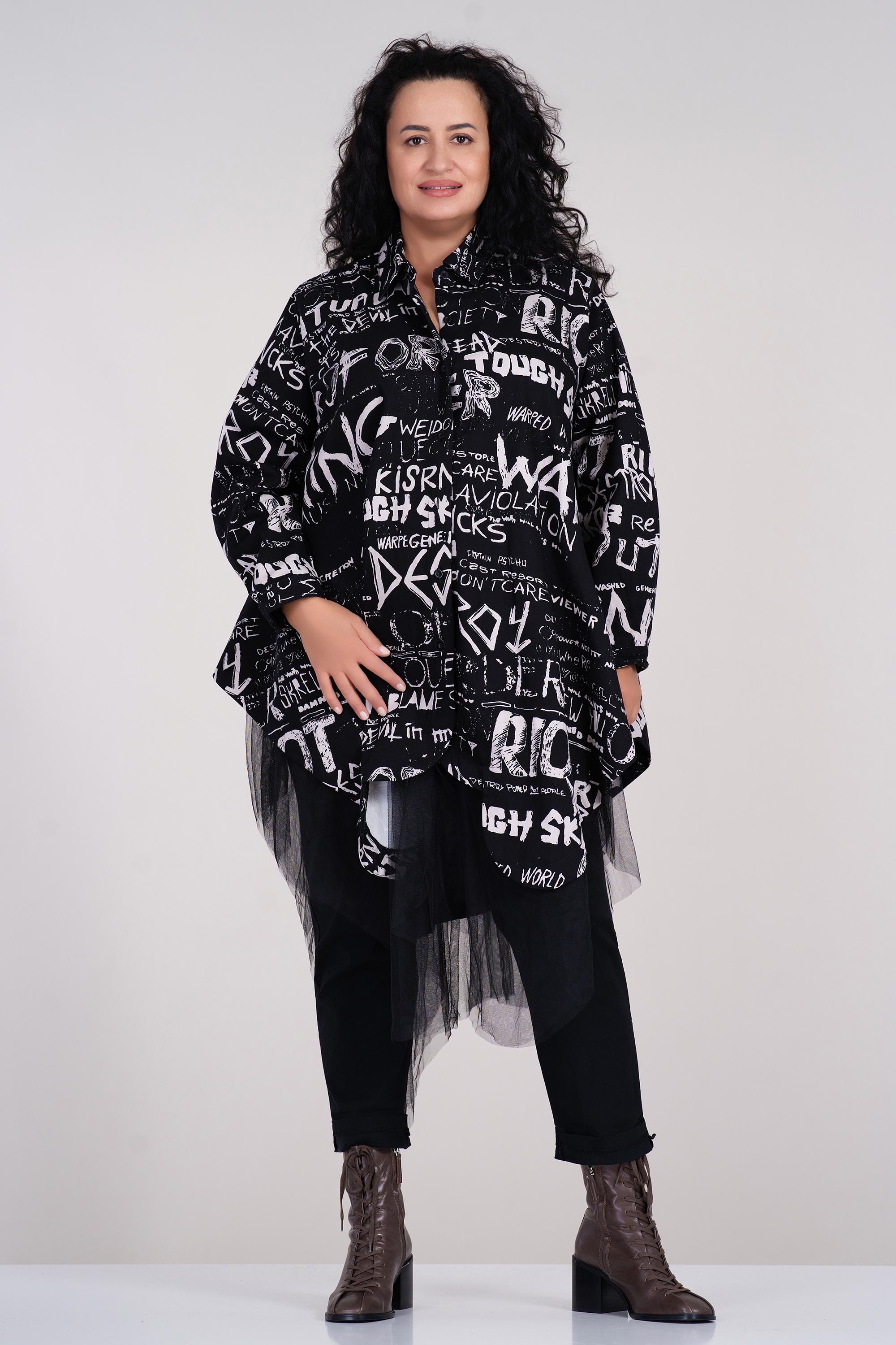 Тази макси рокля впечатлява със смела визия и уникален дизайн. Контрастният принт в бяло върху черна основа създава динамичен ефект, а риза-кройката и асиметричният подгъв с тюл добавят обем и лекота. Подходяща за модерни визии в градска среда, тази рокля съчетава комфорт и артистичен стил.