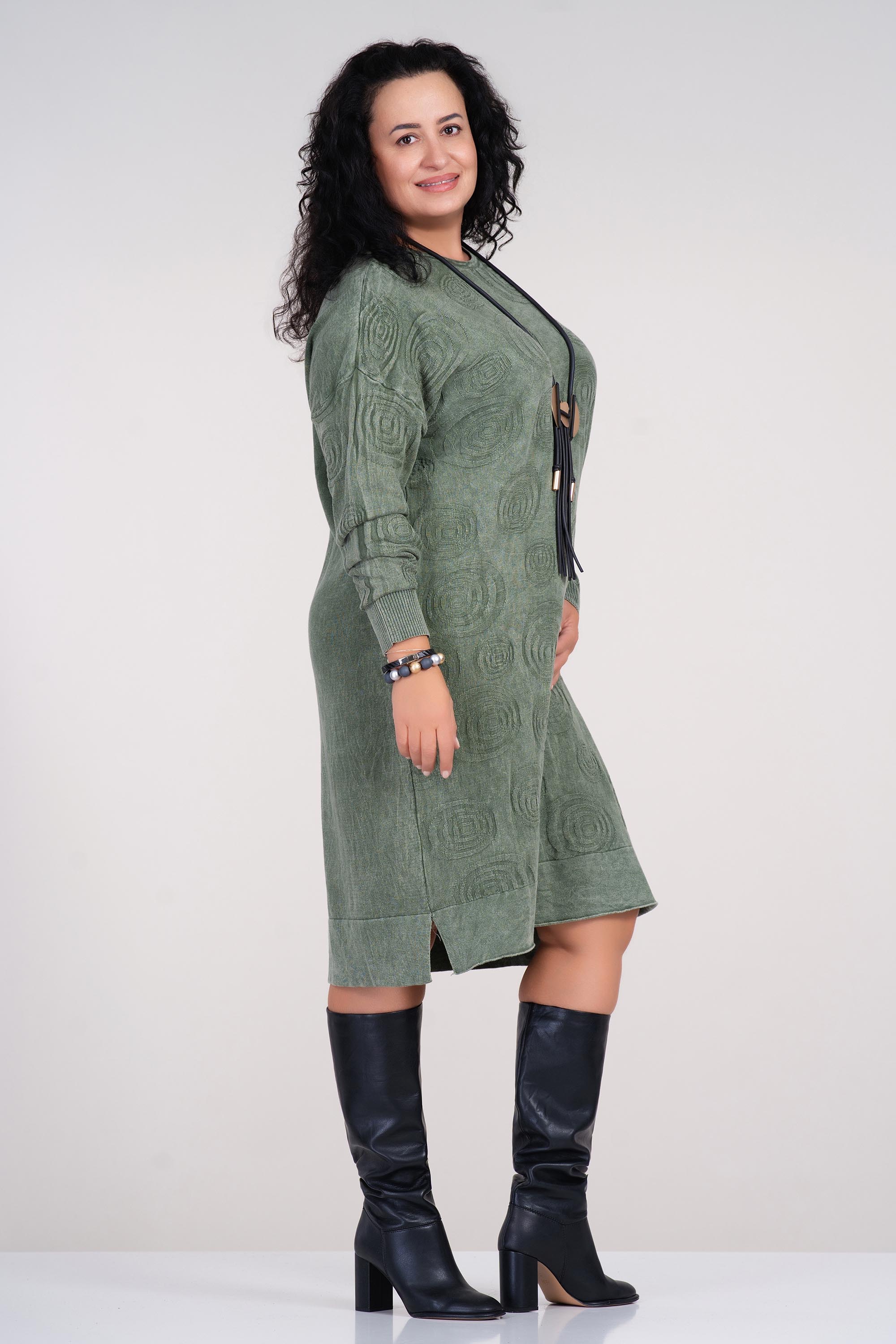 Тази рокля от фино плетиво впечатлява със зелен цвят и релефна текстура в кръгли мотиви. Свободната кройка с паднало рамо и обло деколте осигурява максимален комфорт и стилно излъчване. Моделът е изключително подходящ за есенно-зимния сезон и се съчетава лесно с плътни чорапогащи и боти.